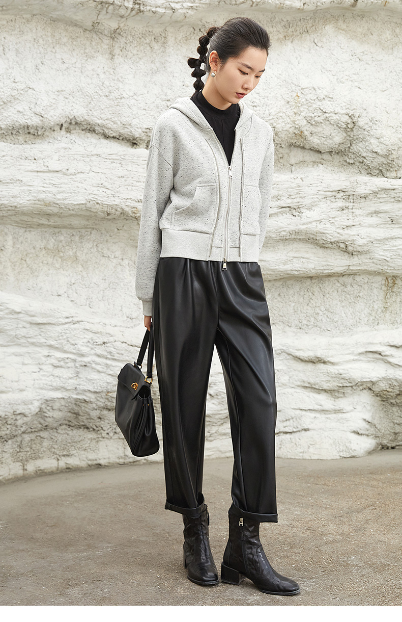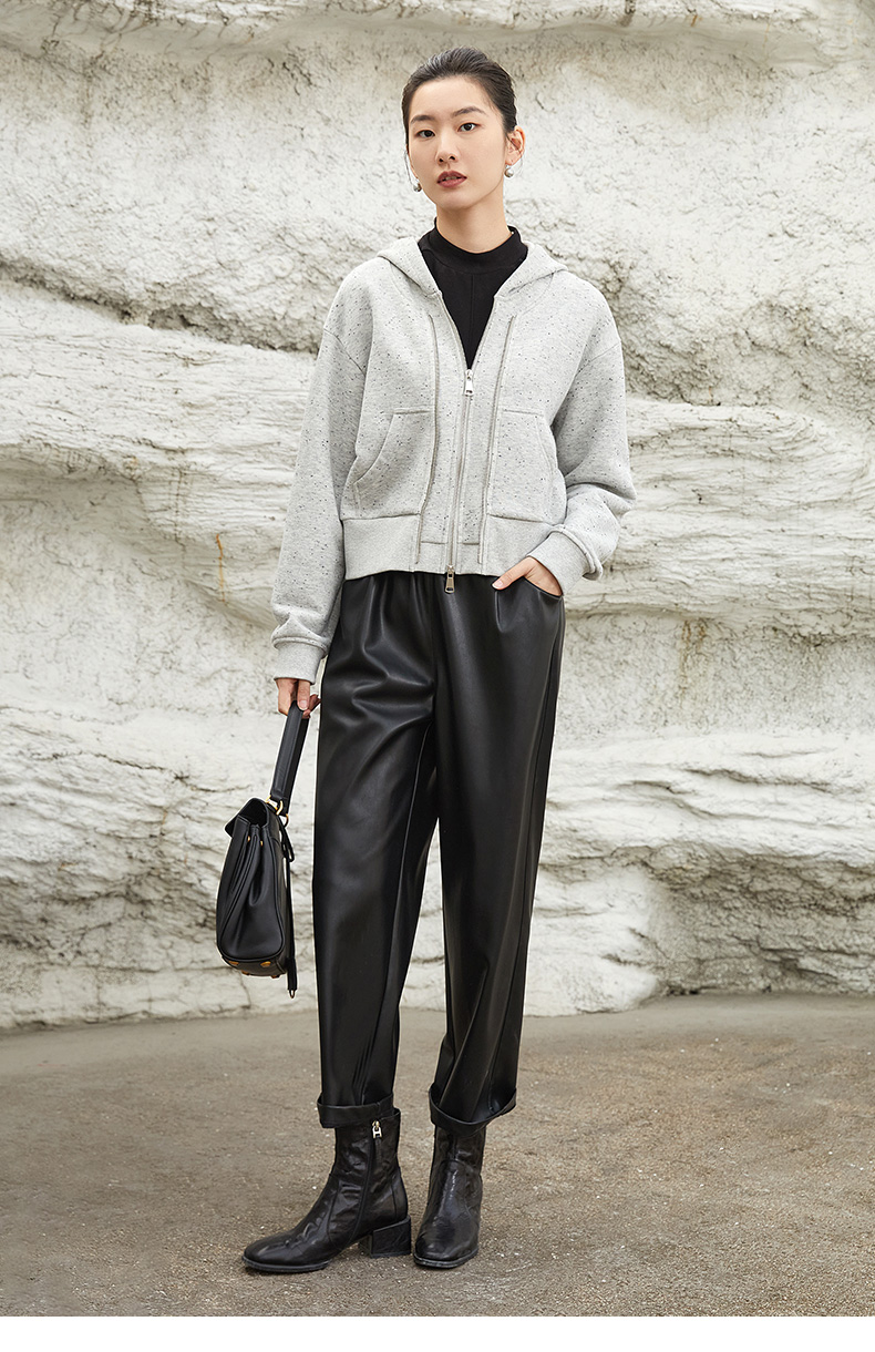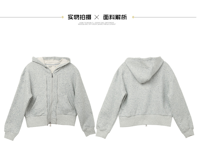秋冬季新款灰色连帽卫衣外套女短款宽松显瘦彩点纱双拉链开衫上衣