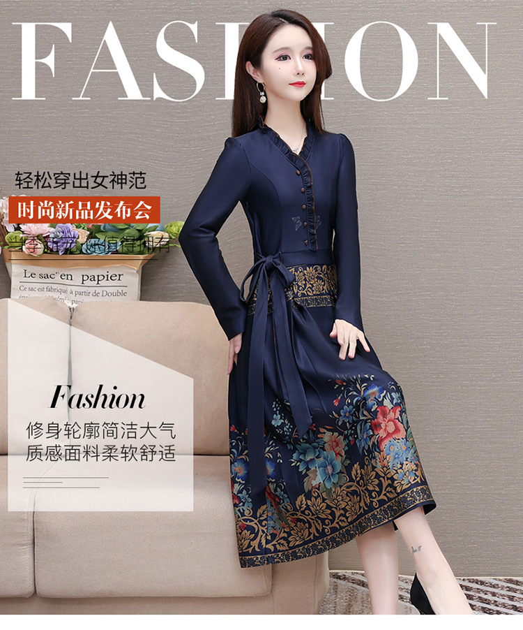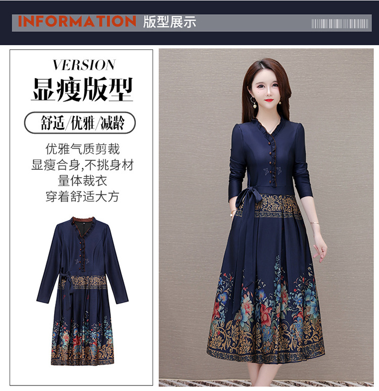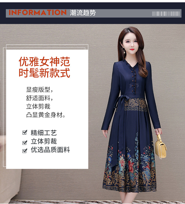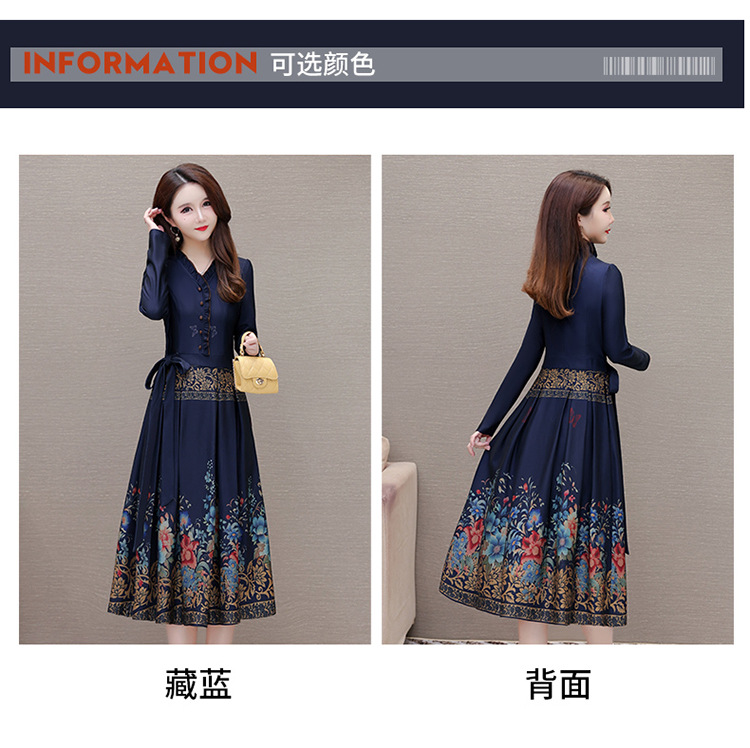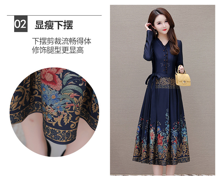 春季新款,中长款长袖A字裙复古长袖印花连衣裙QYM-JJ-6628039-Y