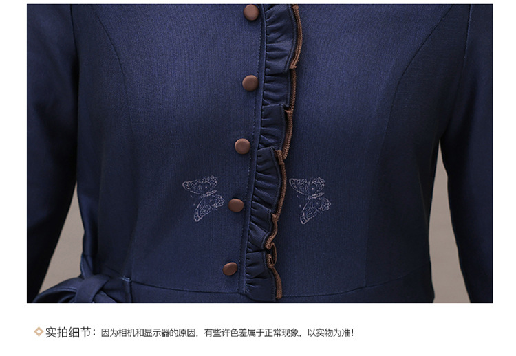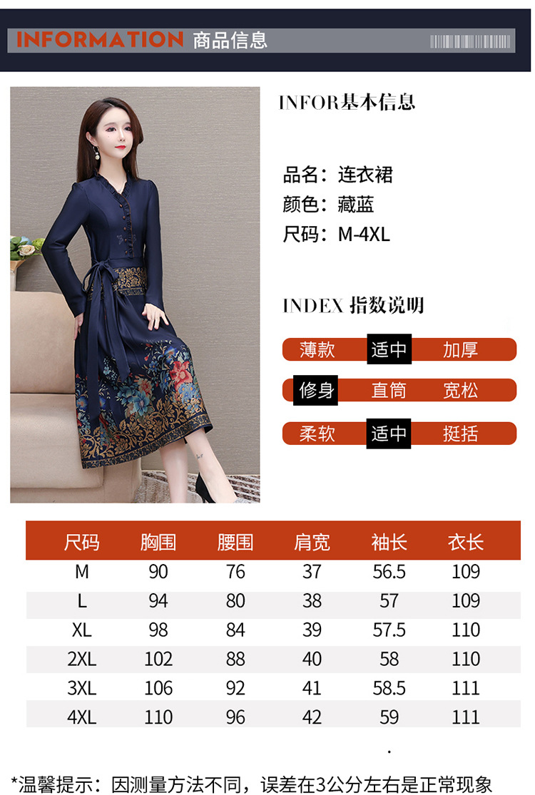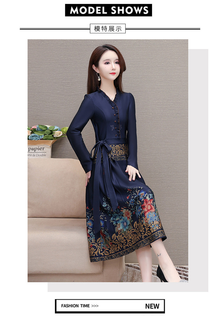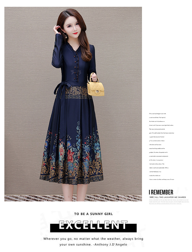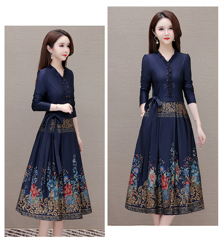 春季新款,中长款长袖A字裙复古长袖印花连衣裙QYM-JJ-6628039-Y