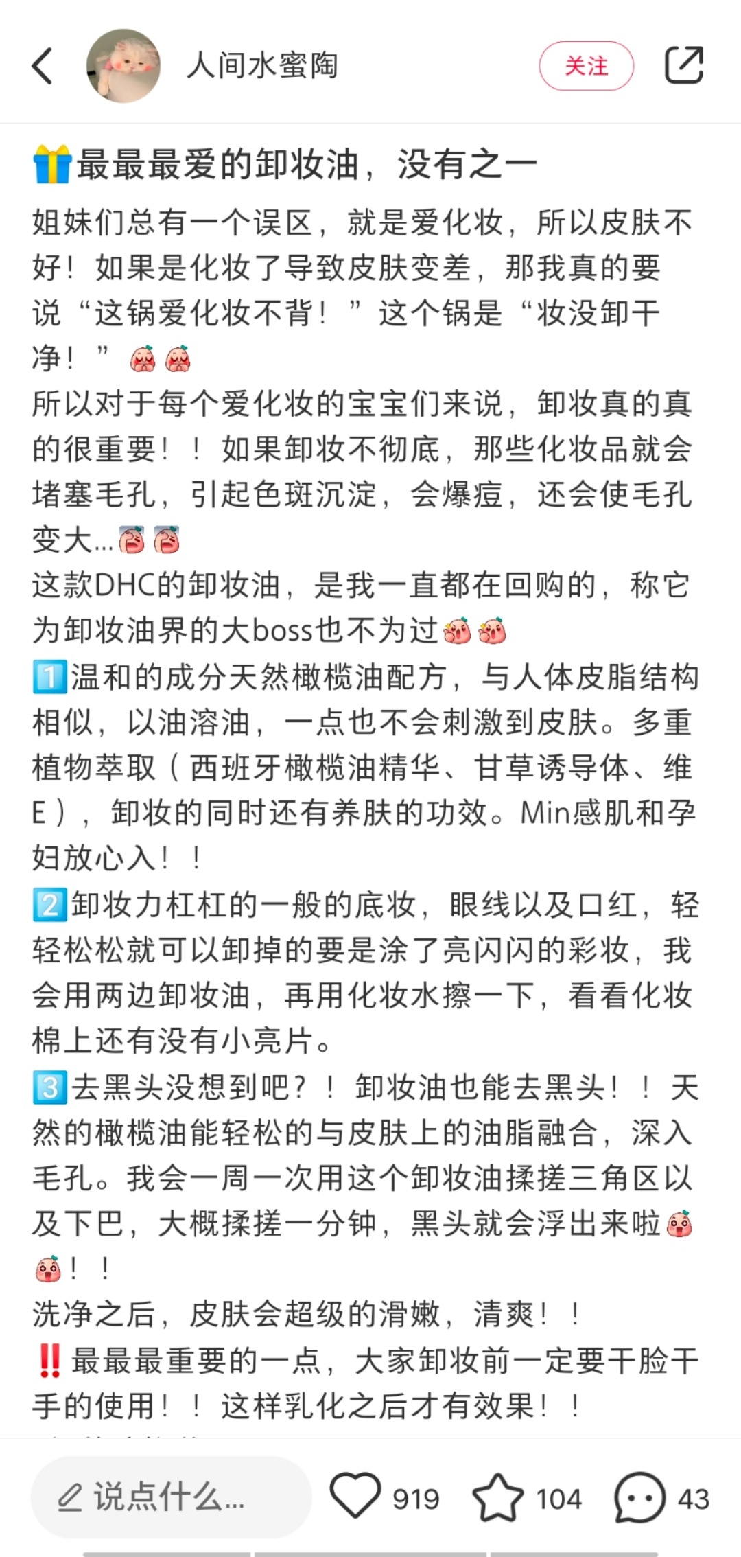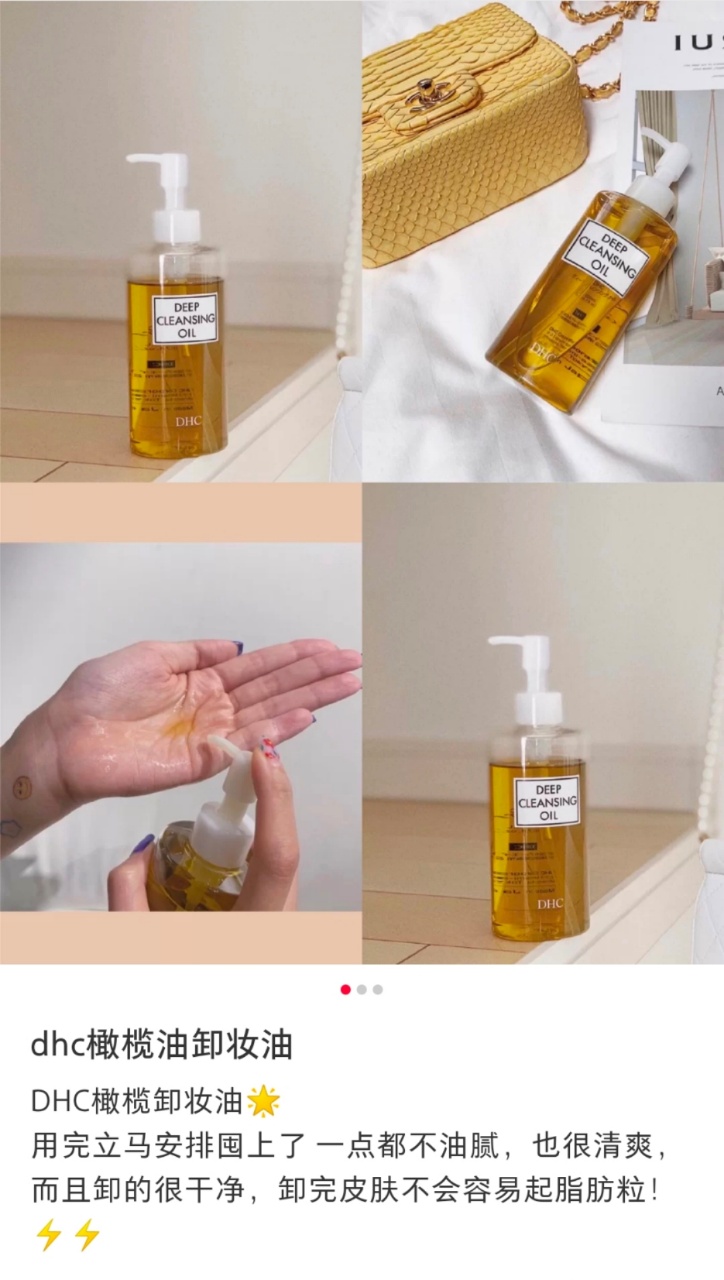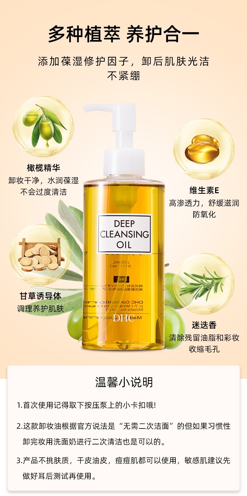 DHC橄榄卸妆油,它主打温和卸妆路线,可以溶解彩妆和毛孔污垢!同时它的成分是天然的植物油,能够改善肌肤粗糙。用的时候一定保持手和脸部的湿润哦,还要充分乳化。