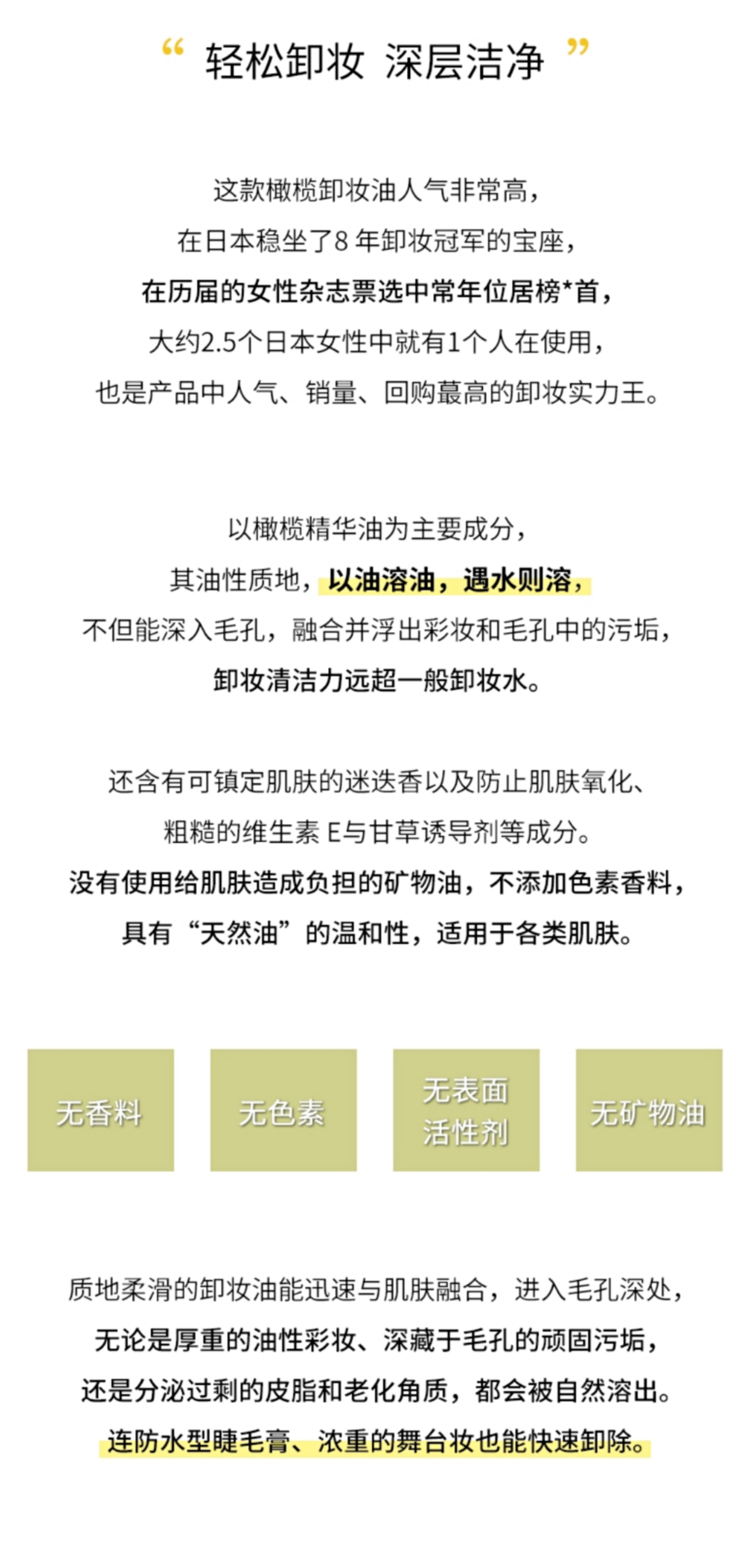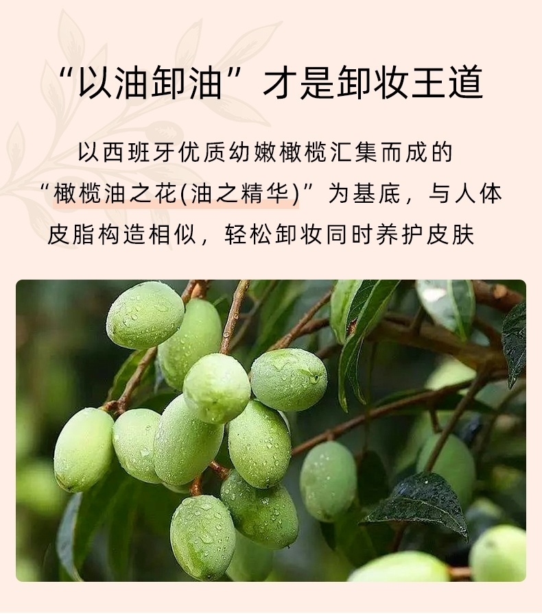 【卖点】本品以橄榄油为主要原料制成,触感爽滑,既可溶解不容易脱落的彩妆,还可以清除毛孔中的污垢,只需稍微按摩后用清水洗净即可,感觉清新爽洁不油腻。
