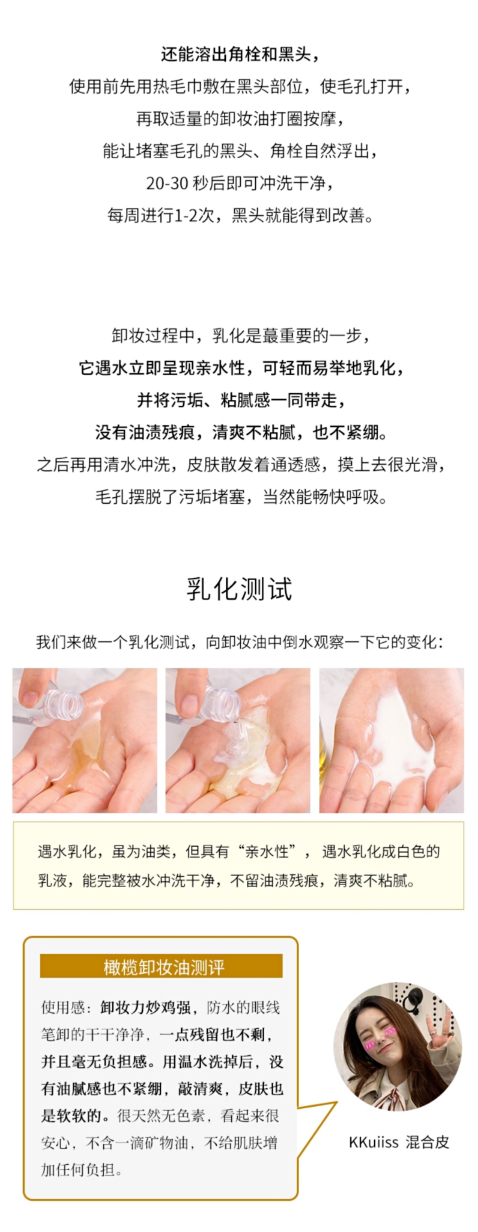 【功效】本品以优质纯橄榄油为主要成分,并配以迷送香叶油和维生素E,在卸妆的同时精心呵护肌肤,可渗入毛孔,不仅可以卸除难脱落的彩妆,还可以使毛孔中的污垢、黑头及老化角质上浮。本品为水洗型卸妆油,溶妆时为亲油性,溶水时则为亲水性。