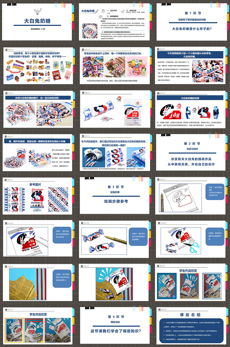 1.通过图片写生的方式表现出大白兔奶糖的外形和包装上的图案细节,并运用水彩笔叠加色彩。