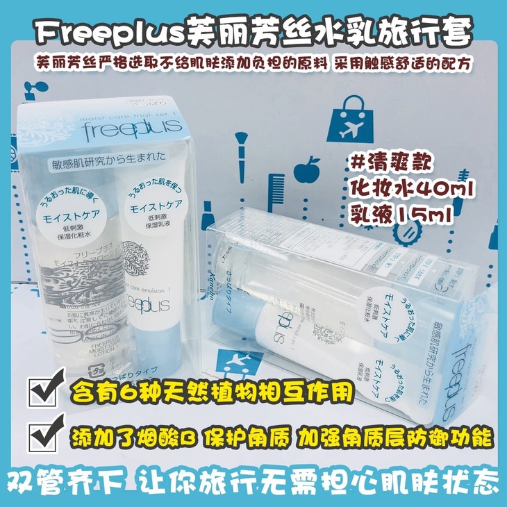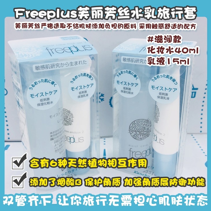 Freeplus芙麗芳絲水乳旅行套👍芙丽芳丝严格选取不给肌肤添加负担的原料,采用触感舒适的配方,含有6️⃣种天然植物相互作用,平衡护理敏感纤弱肌肤,🌱打造不易受到刺激的健康肌肤;添加了烟酸B,保护角质,加强角质层防御功能🛡;还添加了储水丝氨酸120,角质滋养成分,锁住角质层水分💦。 化妆水温和卸妆,保护肌肤,乳液修护干燥肌肤,补充水分💧,滋润肌肤,双管齐下,让你旅行无需担心肌肤状态。☄ 旅行套装包括:化妆水40ml+乳液15ml.