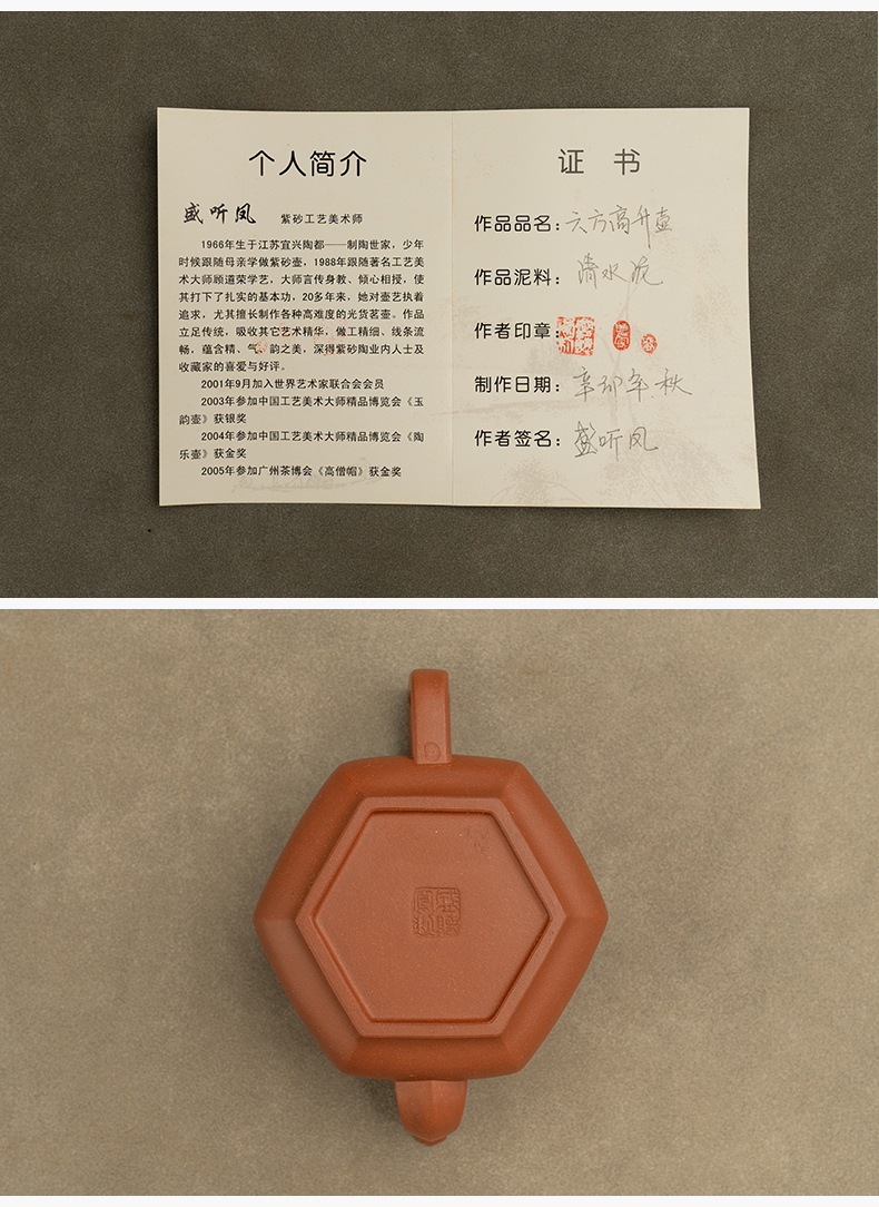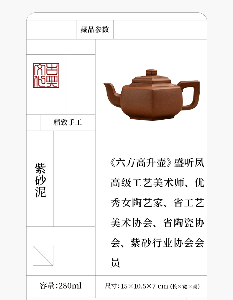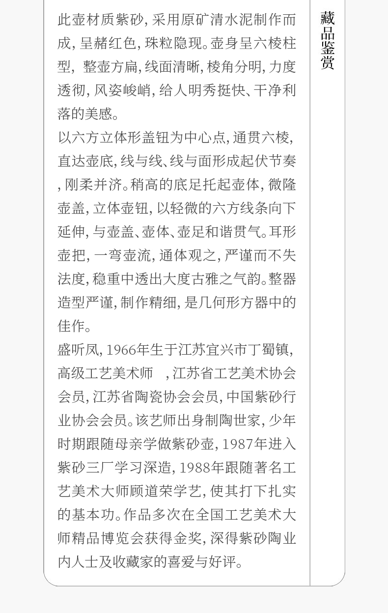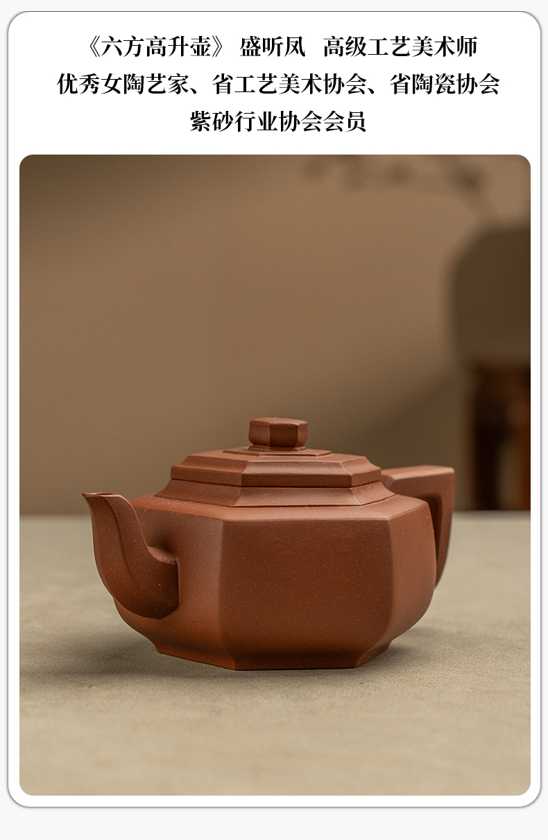 《六方高升壶》 盛听凤 高级工艺美术师、优秀女陶艺家、省工艺美术协会、省陶瓷协会、紫砂行业协会会员