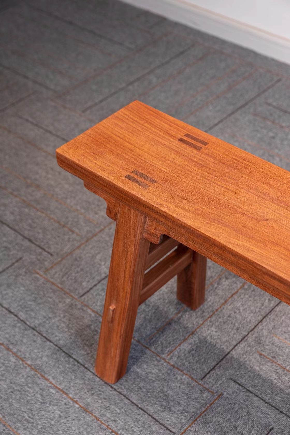 此凳一块玉刀牙做法,长度达到1米1,可容二人定坐,北宋时期即已定型,坐面厚料颇厚,腿足上端开口较深,衔夹宽厚素刀牙牢固稳定,全身仅有细阳线,即下沉的出头作为修饰。