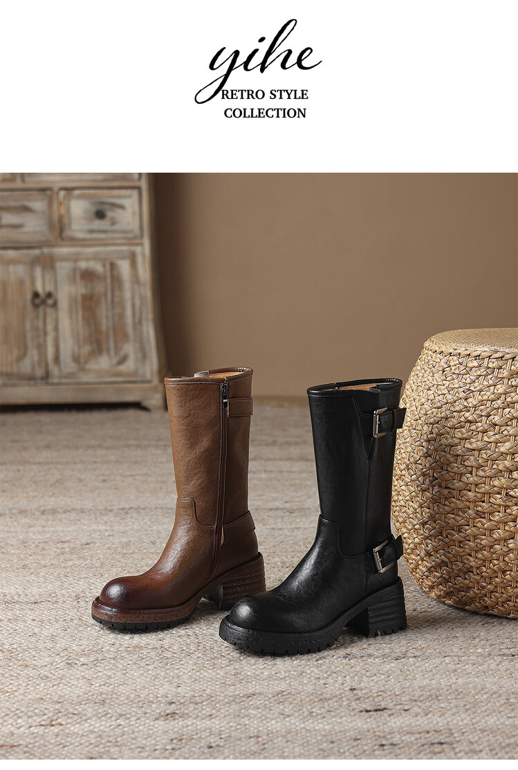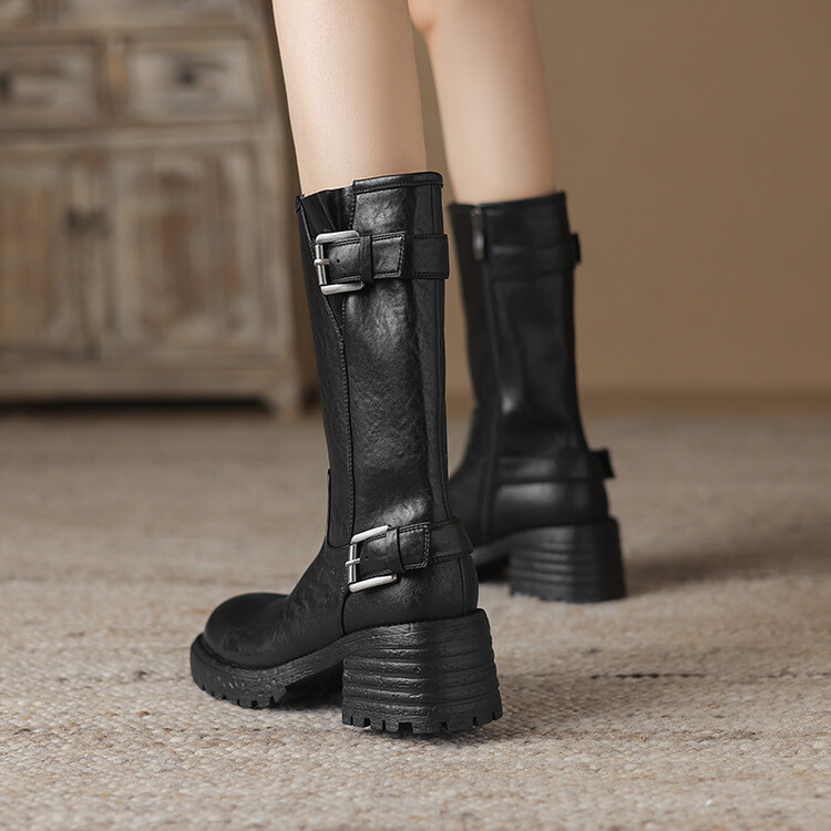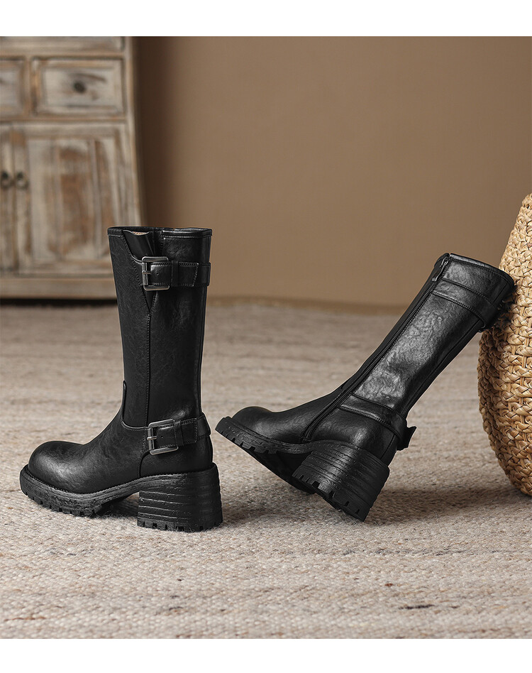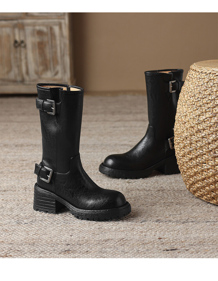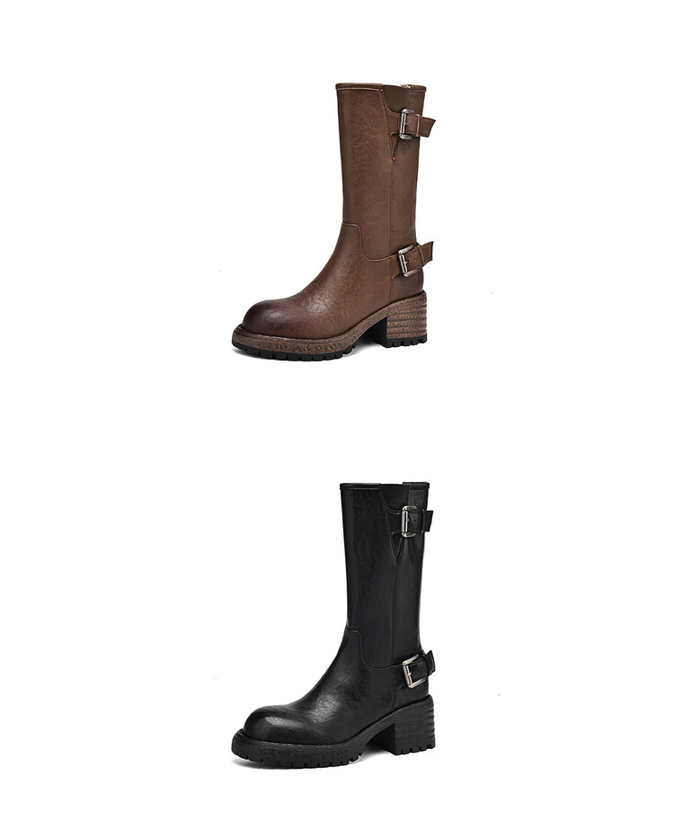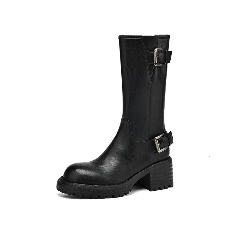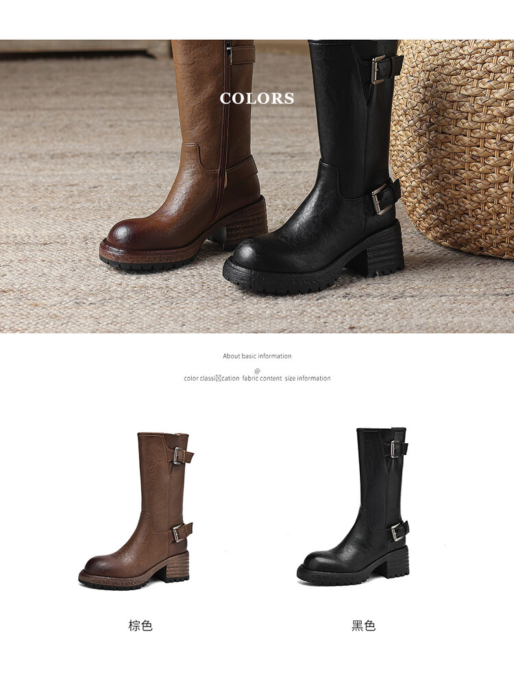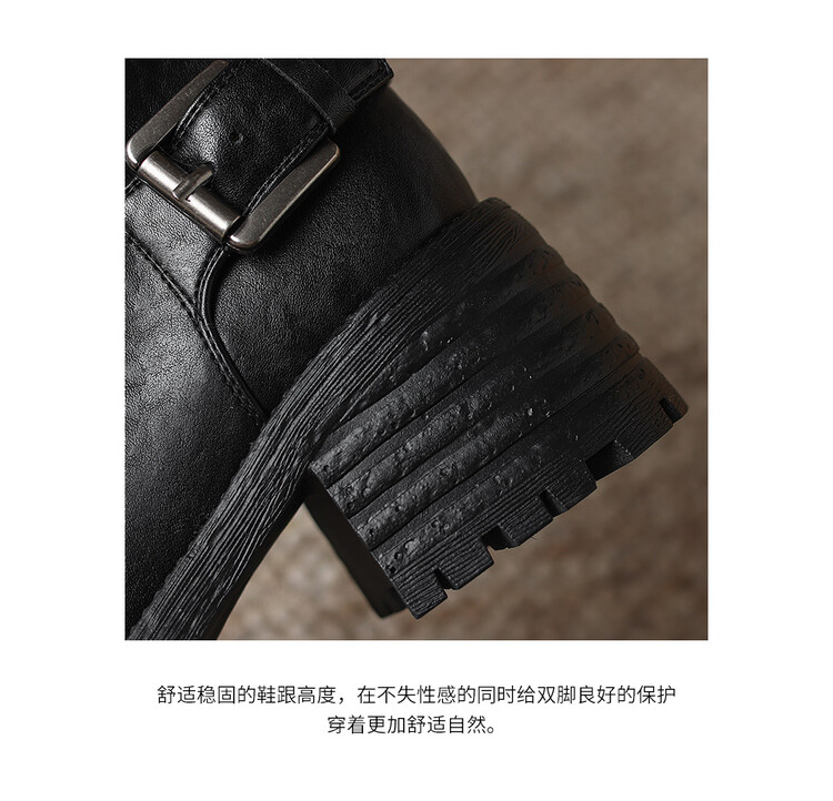 【预售5天】质感满满甜酷帅气皮带扣圆头中筒靴秋冬季新款牛皮复古百搭皮靴MDY&M215-1