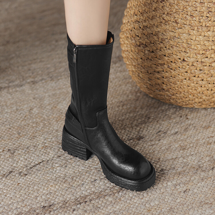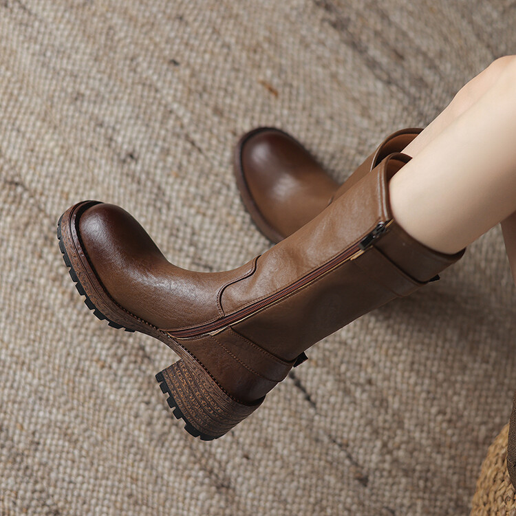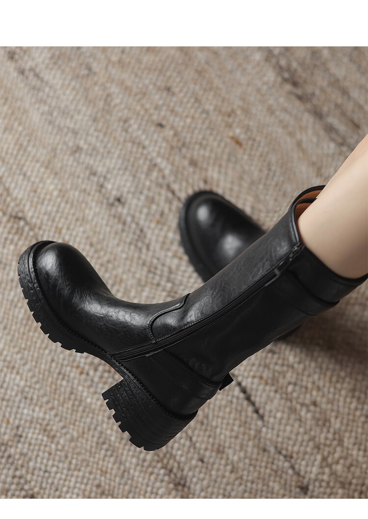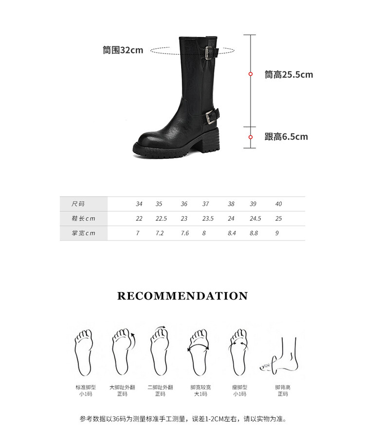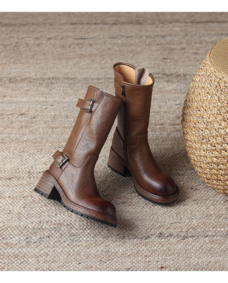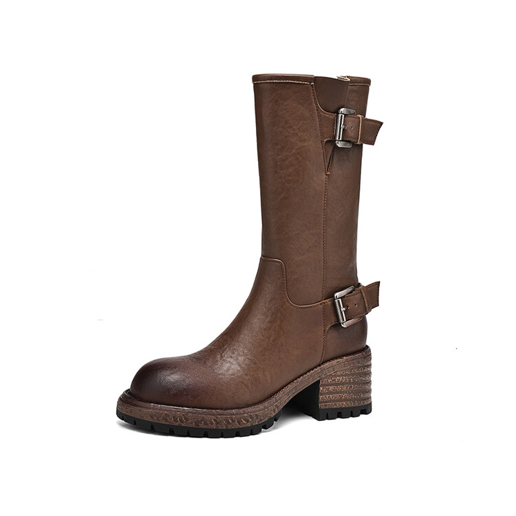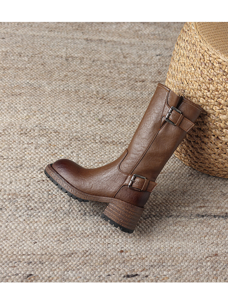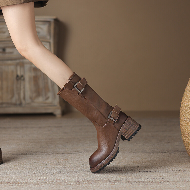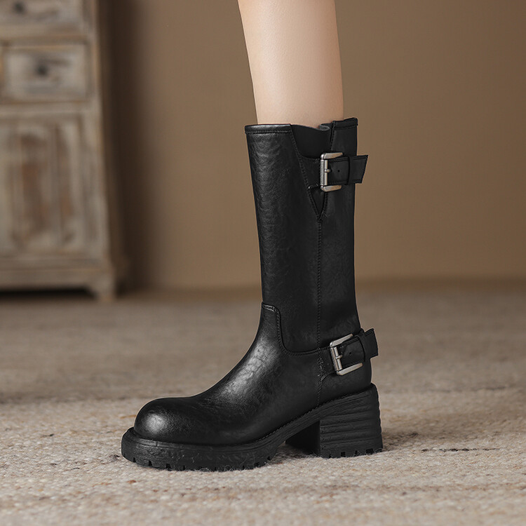 【预售5天】质感满满甜酷帅气皮带扣圆头中筒靴秋冬季新款牛皮复古百搭皮靴MDY&M215-1