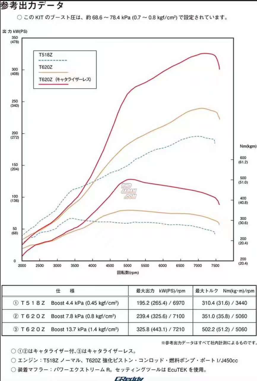 【GReddy T518Z涡轮套件】86/BRZ最稳定效率最高的一套涡轮套件,无需降低压缩比无需腹内强化,设定官方建议的0.48bar压力可实现100匹马力涨幅。套件包含T518Z涡轮本体,Type40E中冷器,不锈钢EX芭蕉,不锈钢Front Pipe,AIRINX空滤以及进气管路等附件。