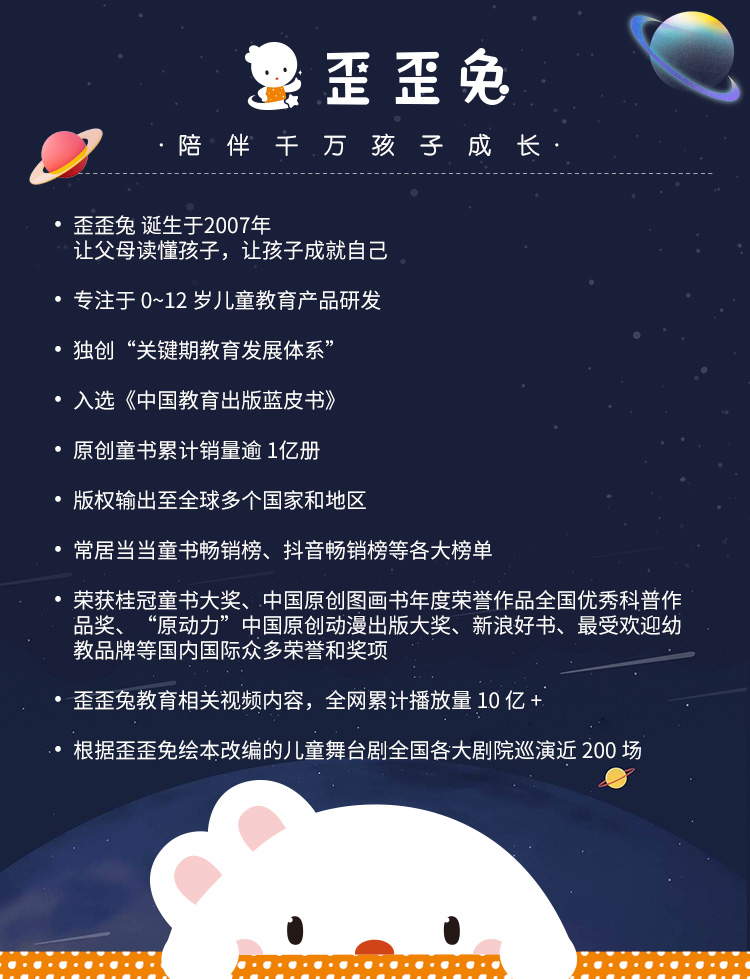- 歪歪兔,诞生于2007年,专注0-12岁儿童教育产品研发。原创童书销量逾1亿册,音视频播放总量10亿+。