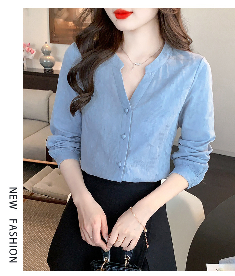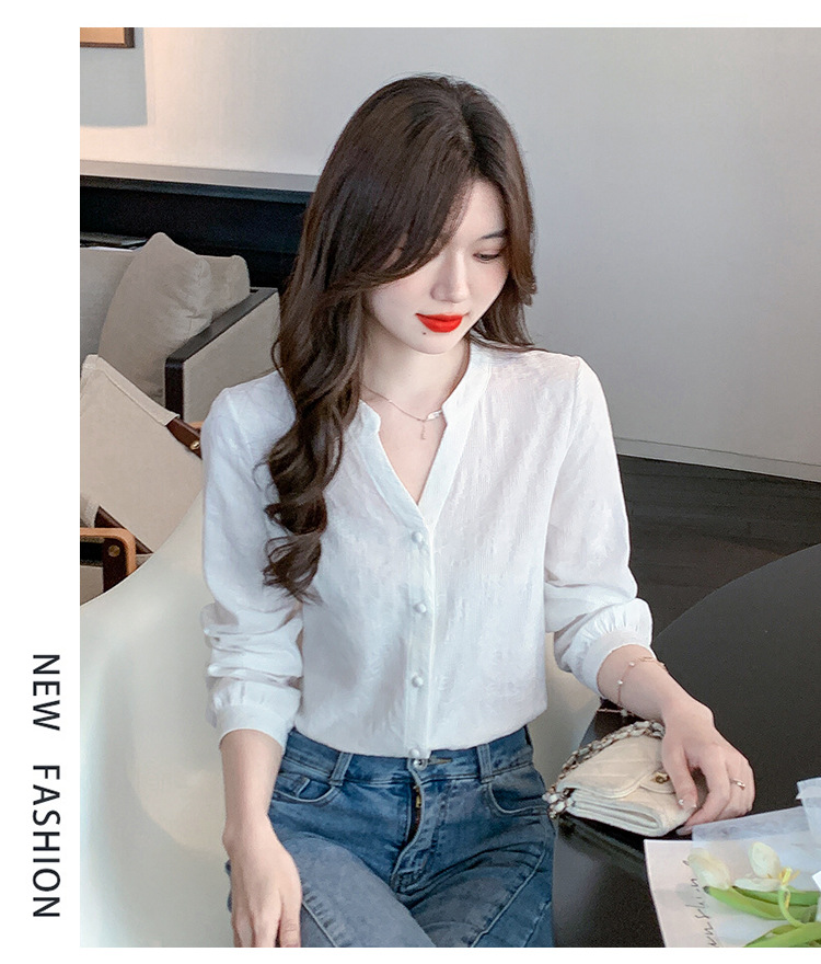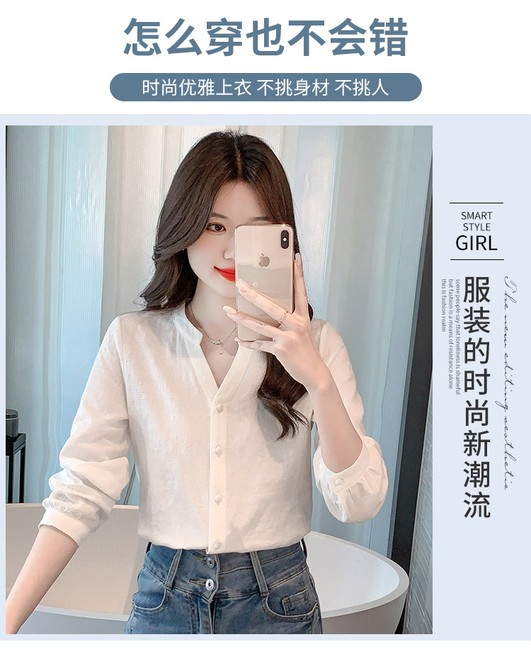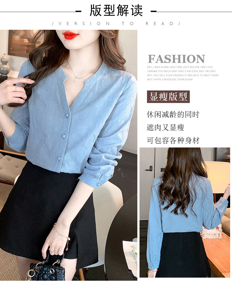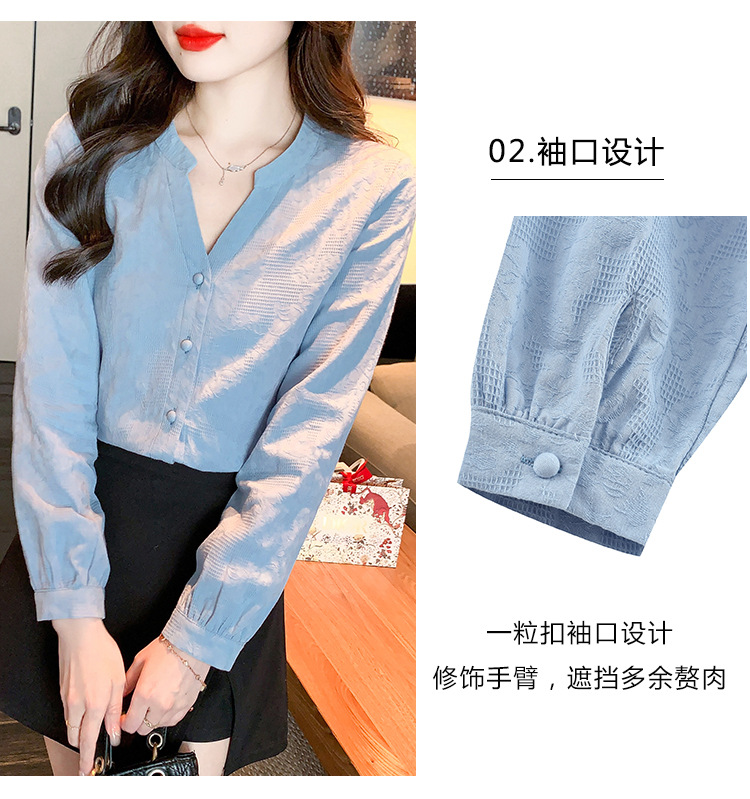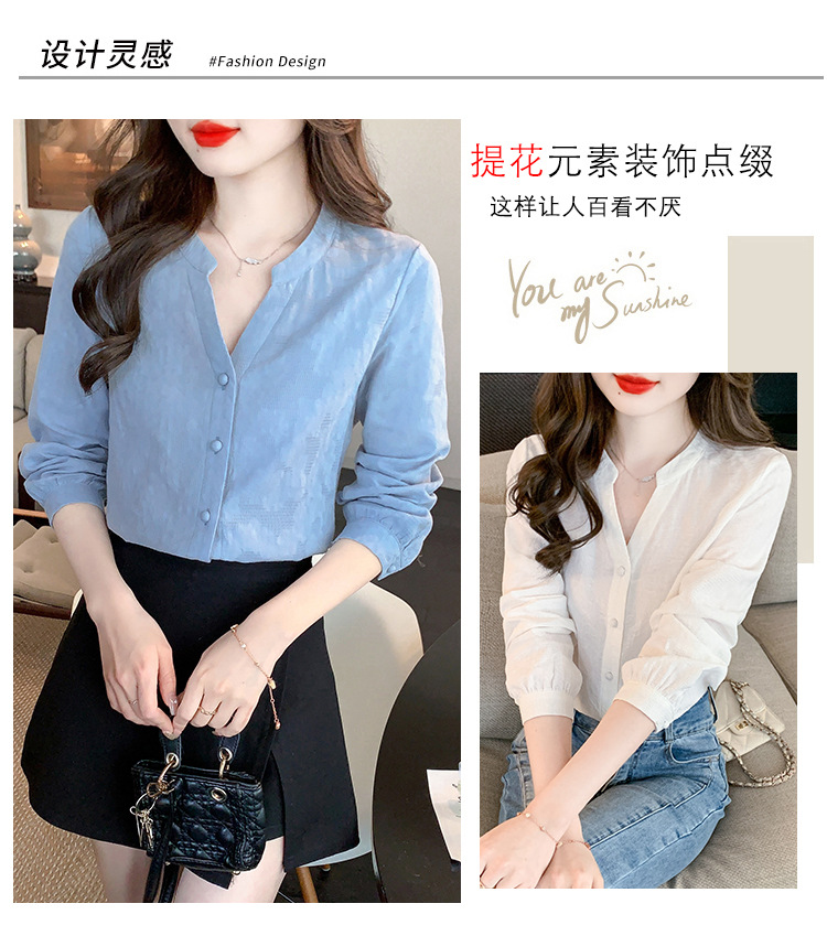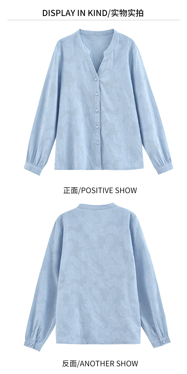 棉布提花v领长袖衬衫,春季新款休闲简约气质百搭小衫上衣KQL-E318N9069
