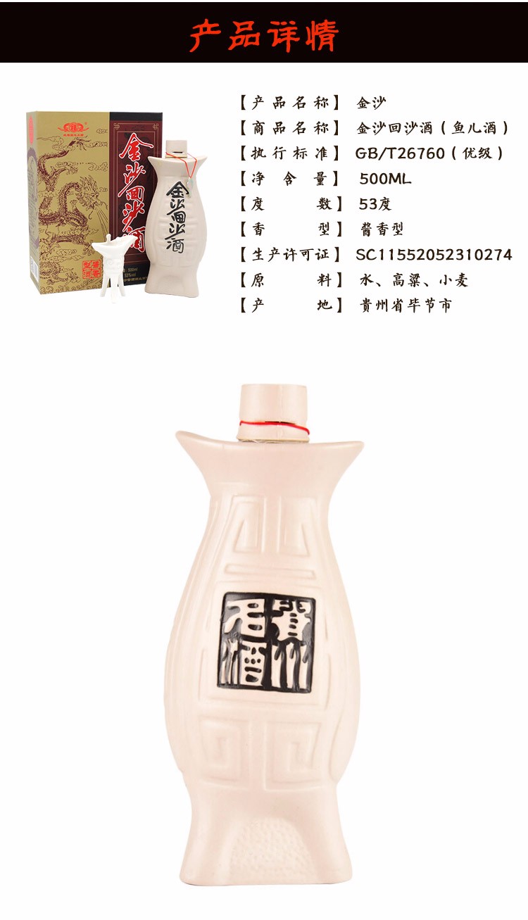 【推荐】(预售一周发出)金沙 回沙酒 鱼儿酒 53度 酱香型白酒 贵州高度酒水 礼盒装 500ml*6瓶 整箱装
