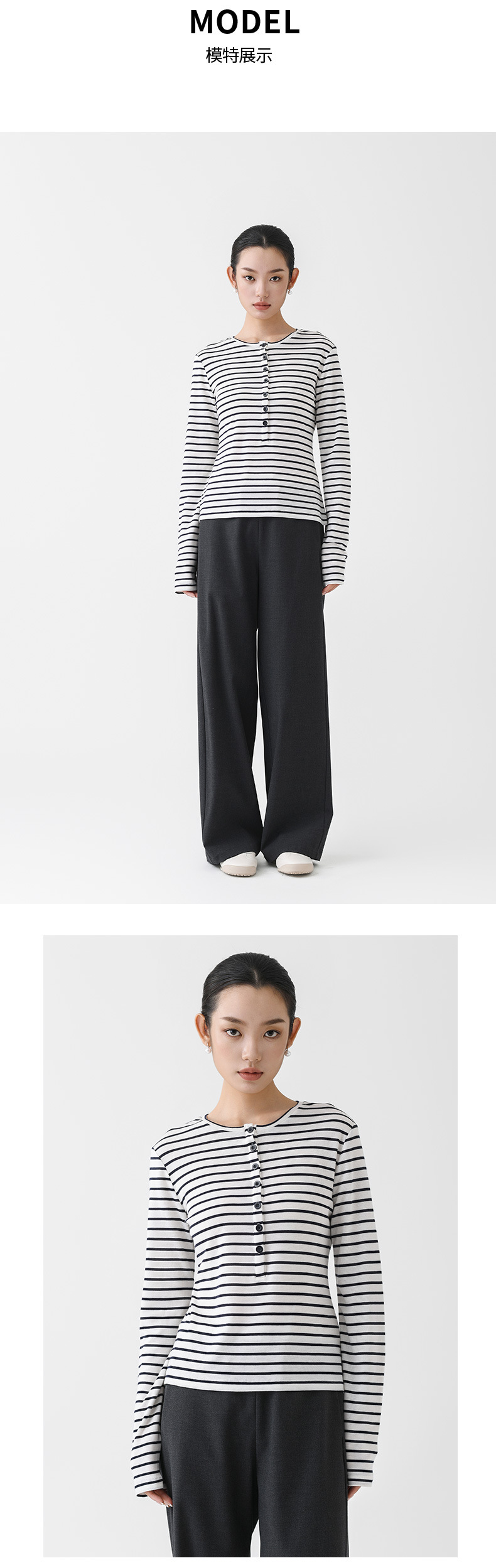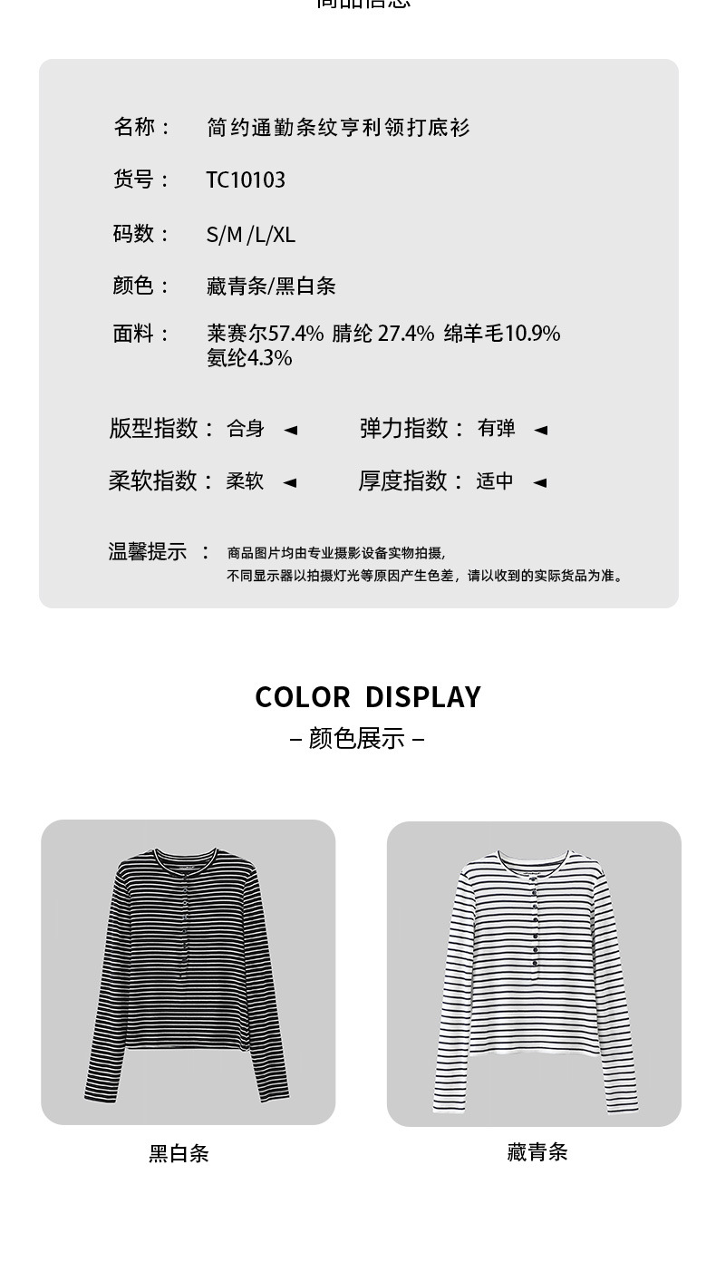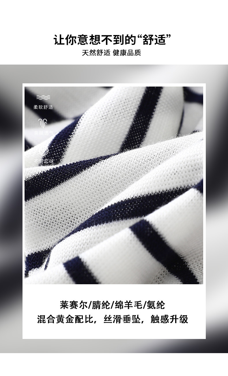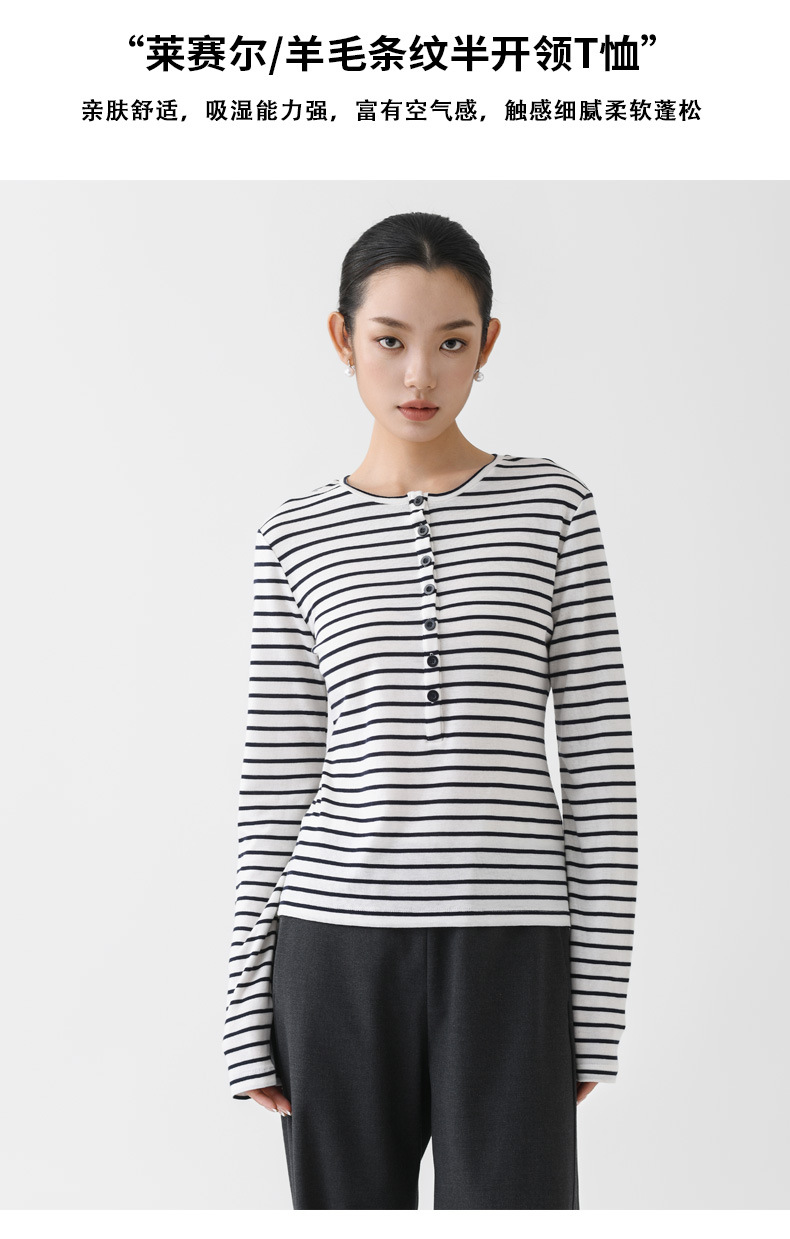 丁摩 【莱赛尔+绵羊毛】打底衫女高级感秋款条纹系扣半开领长袖T修身显瘦内搭上衣5ZF-10103