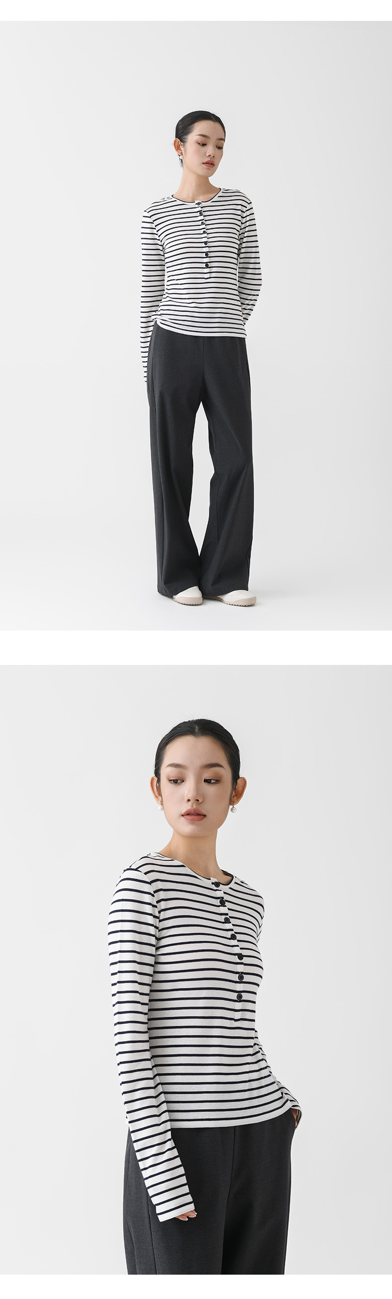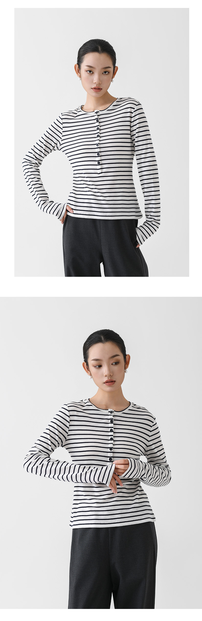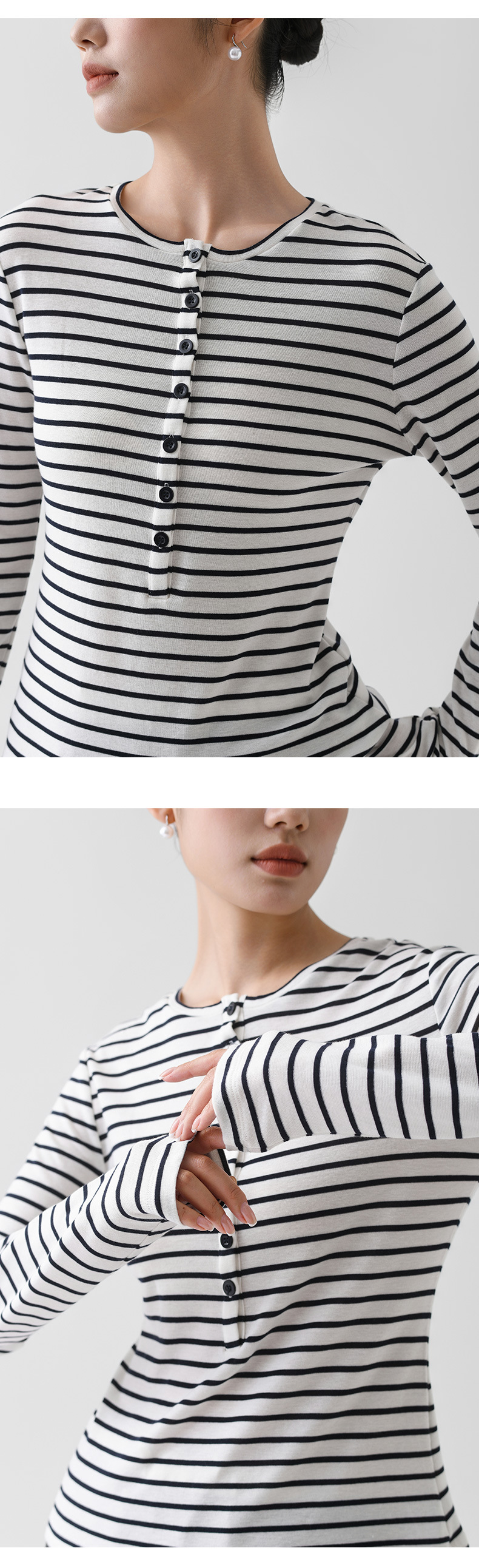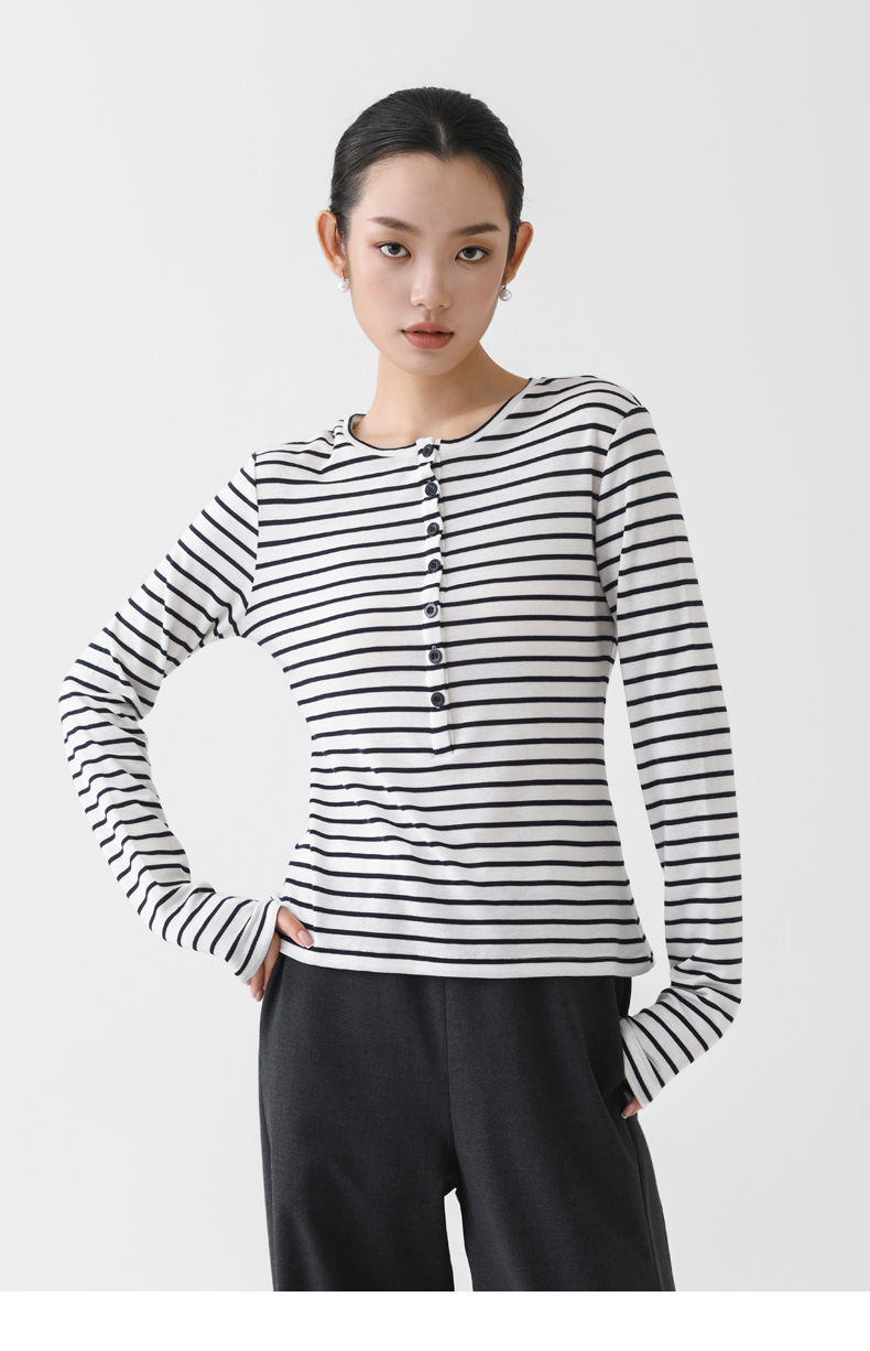 丁摩 【莱赛尔+绵羊毛】打底衫女高级感秋款条纹系扣半开领长袖T修身显瘦内搭上衣5ZF-10103