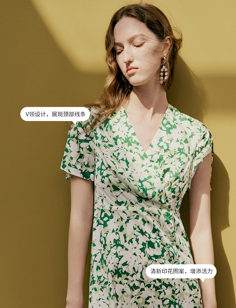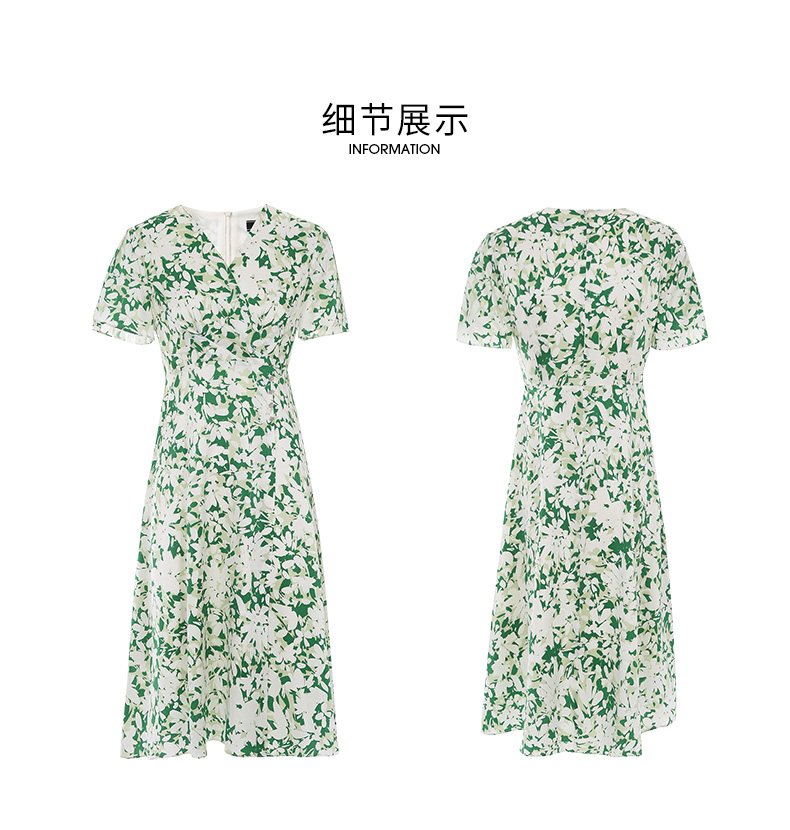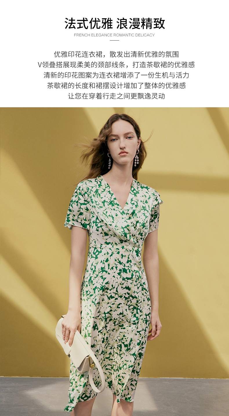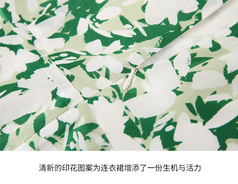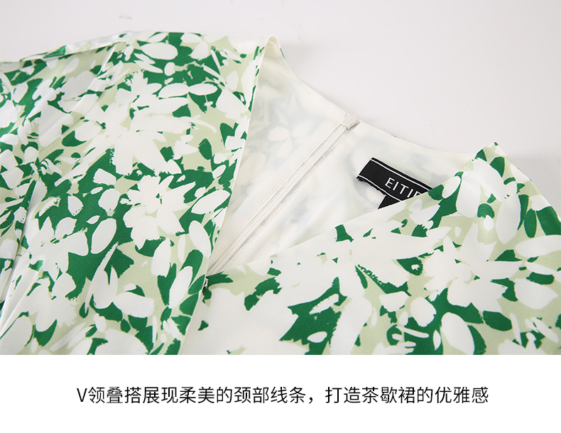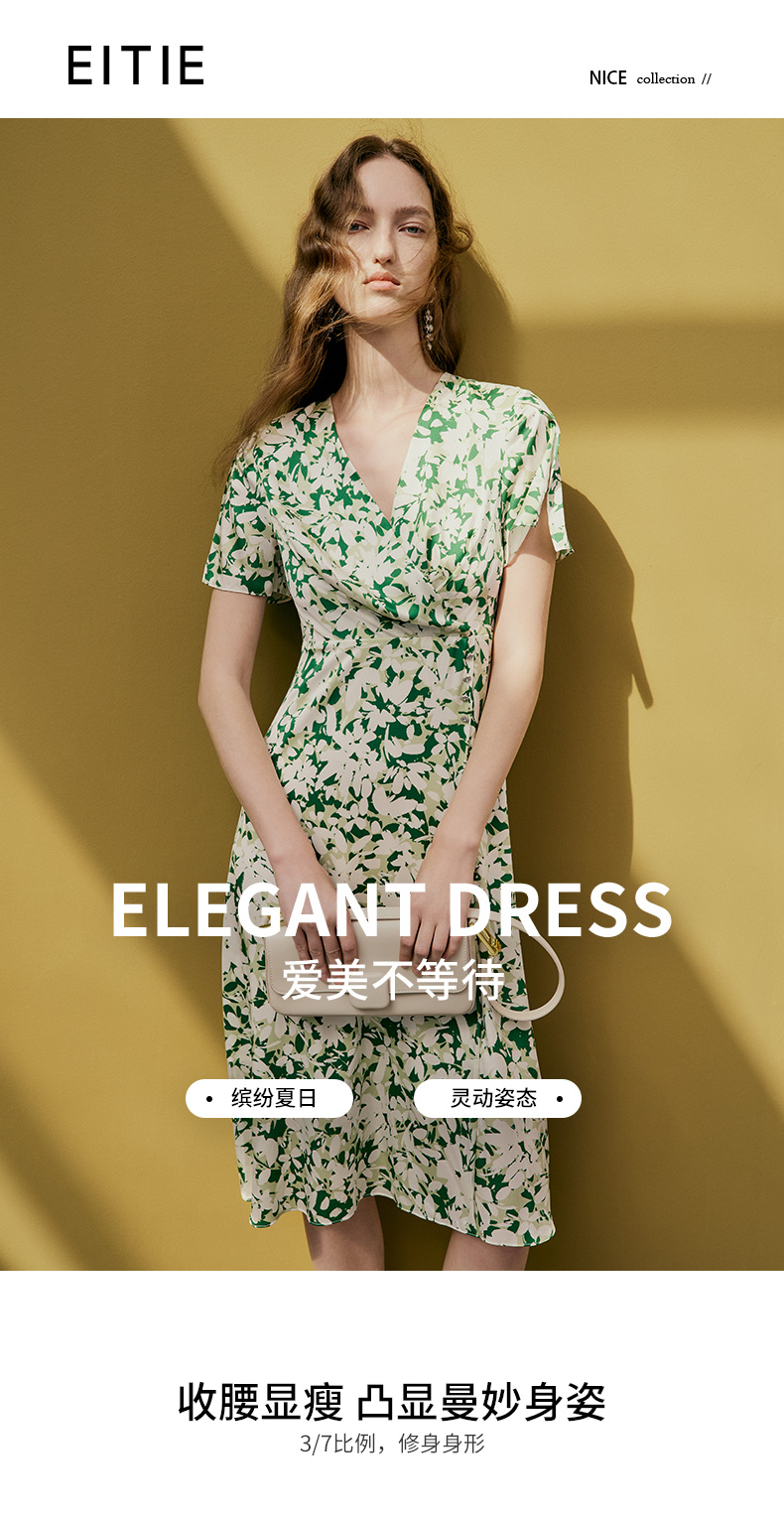 EITIE爱特爱夏季新款印花时尚气质V领显瘦高腰连衣裙7407107