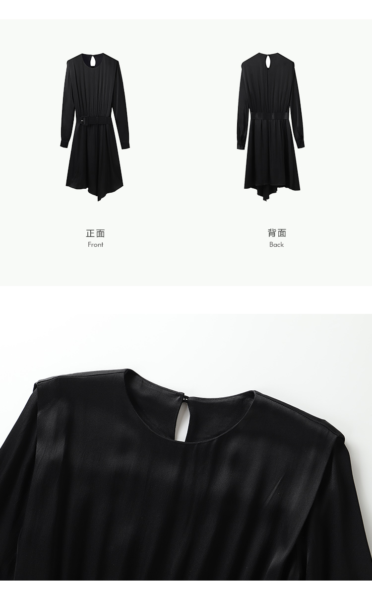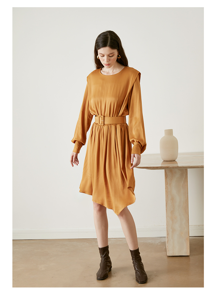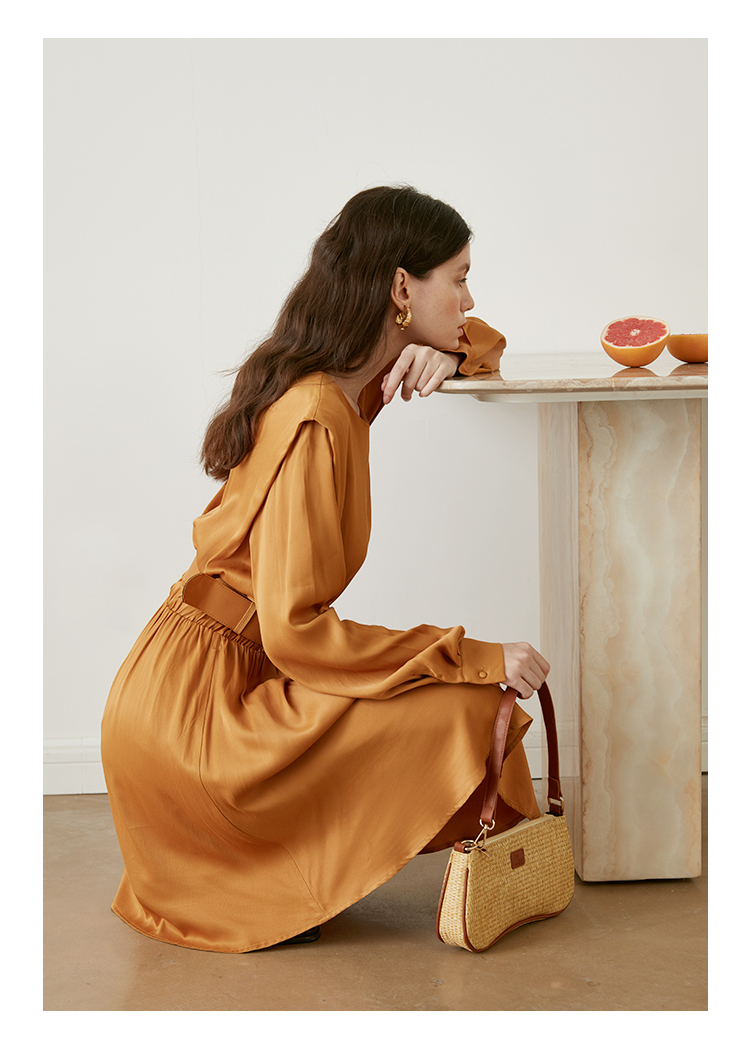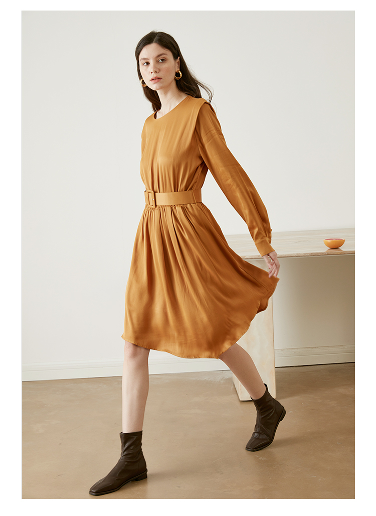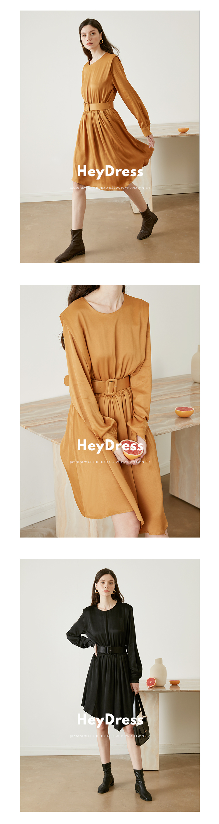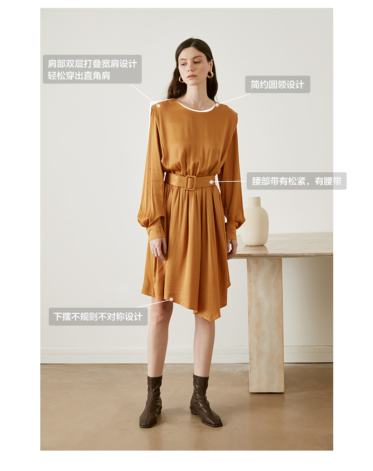 从设计选料,到成衣打板制作 这条裙子承载了我对金色秋日的全部的爱 姜黄是秋日限定浪漫 黑色是四季通用高级 众所周知光泽的缎面材质因其天然华丽感 穿上身总是让人联想到高级、昂贵、规则气质 身材不好颜值不高的MM从气场上就敬而远之 所以HEYDRESS想让缎面连衣裙呈现“日常华丽感” 毕竟每个朝九晚五的日子 更加需要些高光时刻 毕竟每个普通女孩子,也都值得被精致以待—— 所以在设计上增添几处休闲元素: 肩部折叠层次、松紧腰、软皮腰带、A摆型摆量 版型上X型是第一眼廓形 腰部宽腰带(软包皮的)的硬朗 与缎面柔软量感鲜明对比 绝对是粗腰星人的终极救星!!! 下摆A型基础上做不对称裁剪 打破对称的优雅 多一丝帅气—— 可以配精致高跟 也能配平地短靴 日常精致感esay get PS:缎面面料质感类似于人丝/真丝那种材质, 会有轻微起皱的现象, 收到后熨烫后再试穿,不穿的时候挂装。 完美主义者不能接受一点皱的,可以考虑其他款。