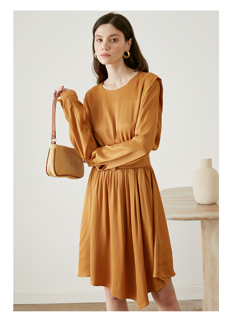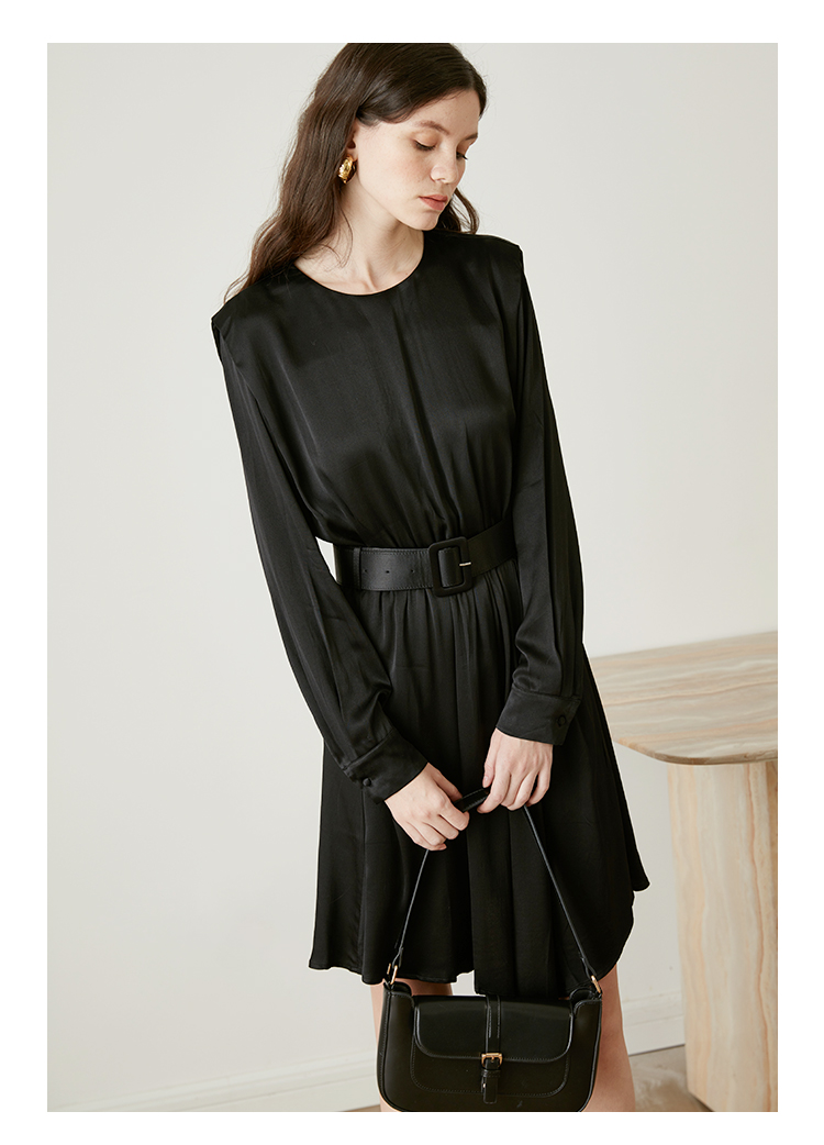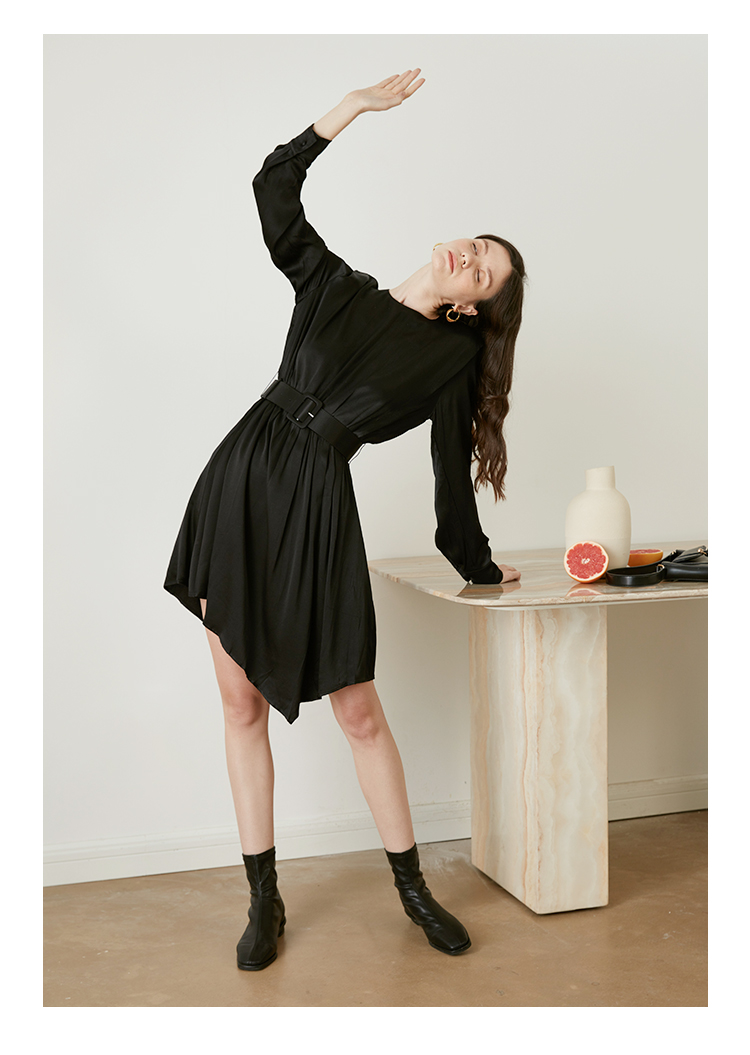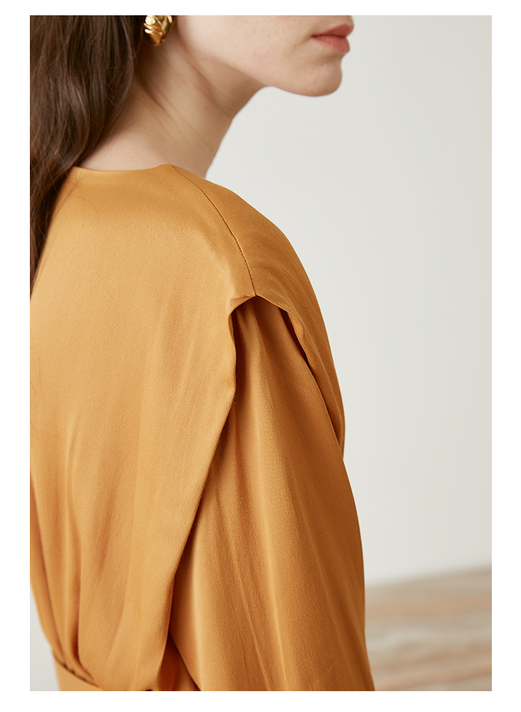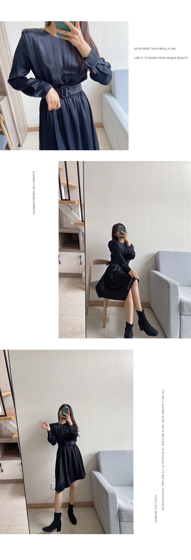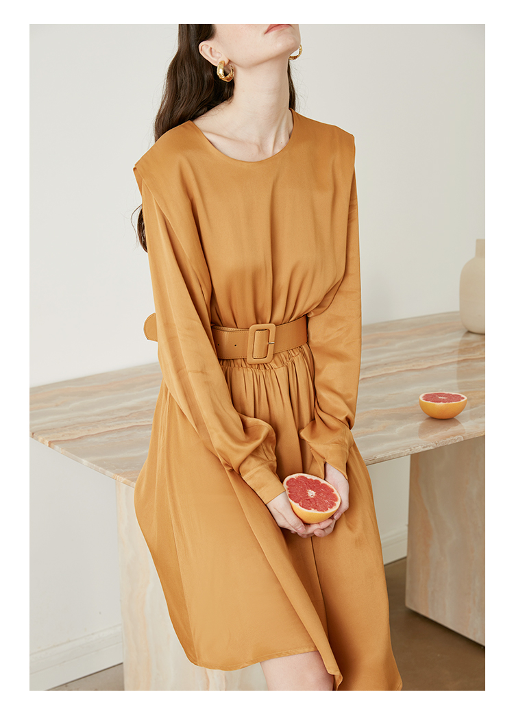 从设计选料,到成衣打板制作 这条裙子承载了我对金色秋日的全部的爱 姜黄是秋日限定浪漫 黑色是四季通用高级 众所周知光泽的缎面材质因其天然华丽感 穿上身总是让人联想到高级、昂贵、规则气质 身材不好颜值不高的MM从气场上就敬而远之 所以HEYDRESS想让缎面连衣裙呈现“日常华丽感” 毕竟每个朝九晚五的日子 更加需要些高光时刻 毕竟每个普通女孩子,也都值得被精致以待—— 所以在设计上增添几处休闲元素: 肩部折叠层次、松紧腰、软皮腰带、A摆型摆量 版型上X型是第一眼廓形 腰部宽腰带(软包皮的)的硬朗 与缎面柔软量感鲜明对比 绝对是粗腰星人的终极救星!!! 下摆A型基础上做不对称裁剪 打破对称的优雅 多一丝帅气—— 可以配精致高跟 也能配平地短靴 日常精致感esay get PS:缎面面料质感类似于人丝/真丝那种材质, 会有轻微起皱的现象, 收到后熨烫后再试穿,不穿的时候挂装。 完美主义者不能接受一点皱的,可以考虑其他款。