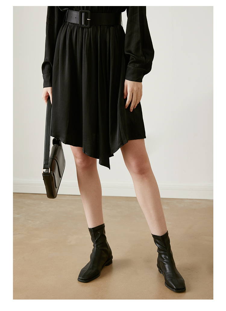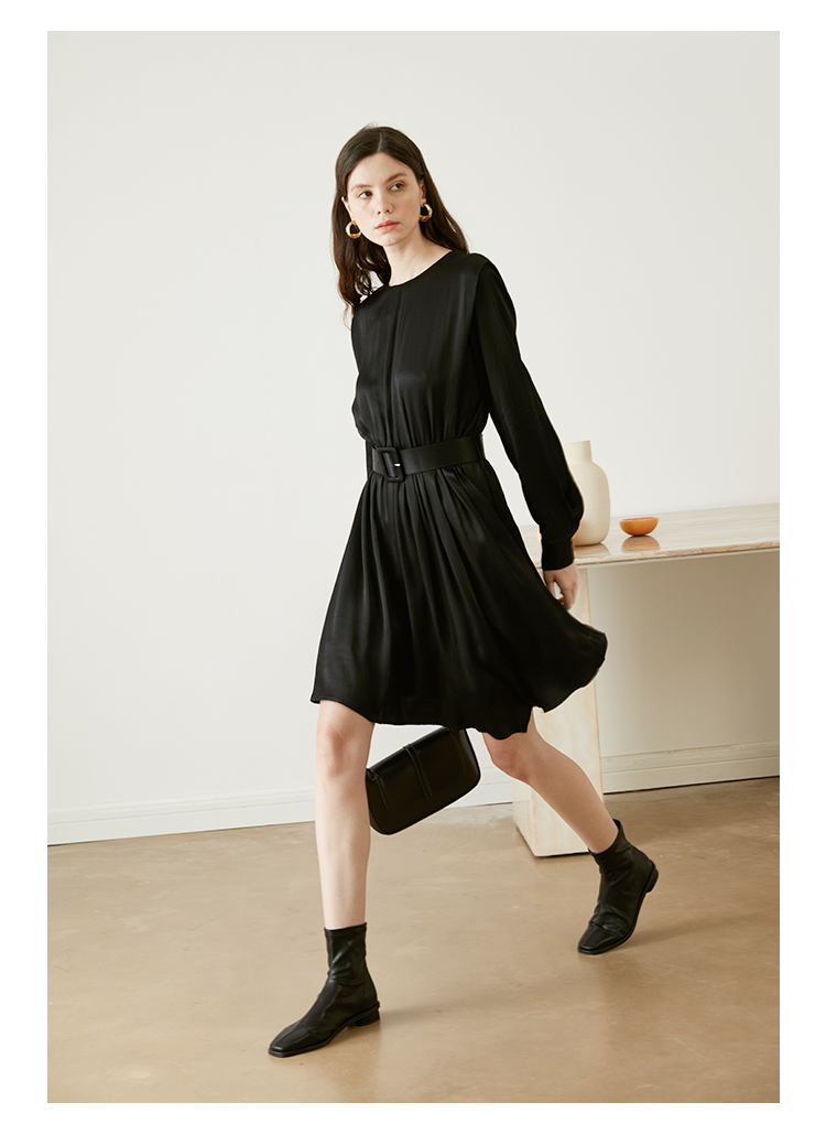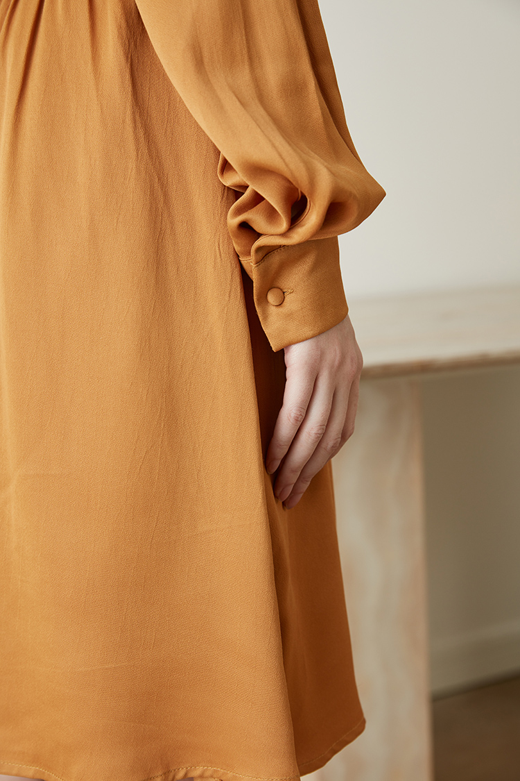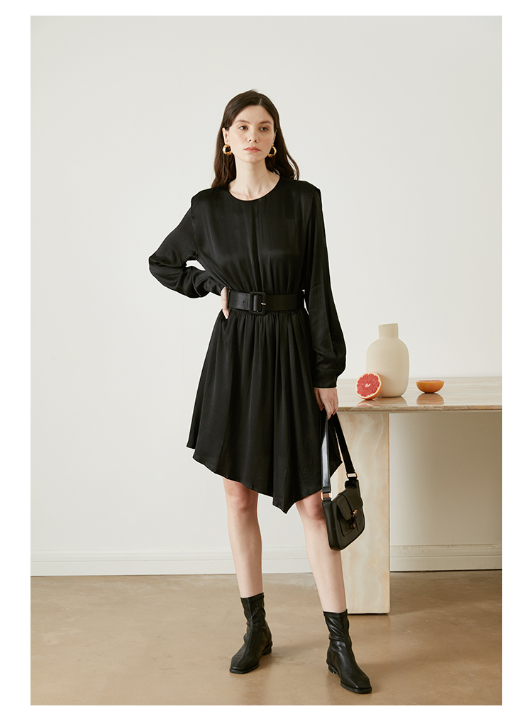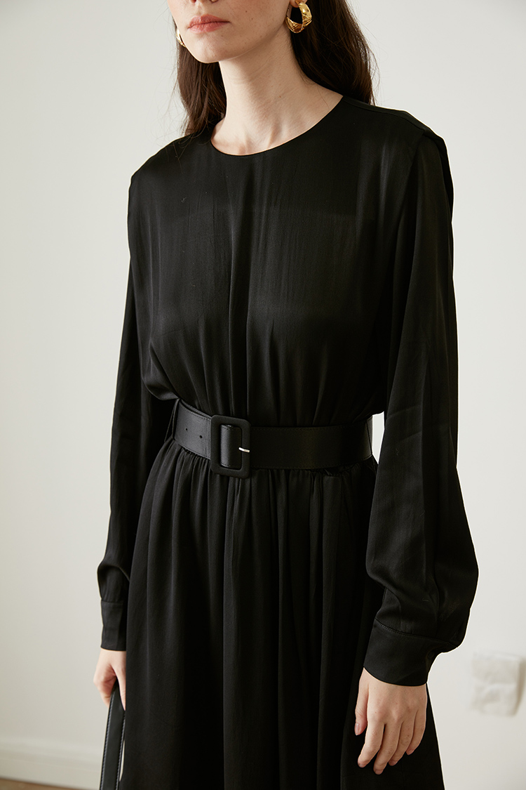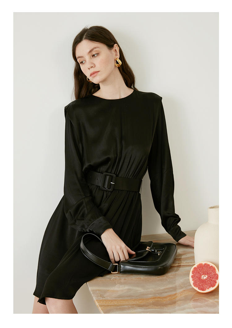 从设计选料,到成衣打板制作 这条裙子承载了我对金色秋日的全部的爱 姜黄是秋日限定浪漫 黑色是四季通用高级 众所周知光泽的缎面材质因其天然华丽感 穿上身总是让人联想到高级、昂贵、规则气质 身材不好颜值不高的MM从气场上就敬而远之 所以HEYDRESS想让缎面连衣裙呈现“日常华丽感” 毕竟每个朝九晚五的日子 更加需要些高光时刻 毕竟每个普通女孩子,也都值得被精致以待—— 所以在设计上增添几处休闲元素: 肩部折叠层次、松紧腰、软皮腰带、A摆型摆量 版型上X型是第一眼廓形 腰部宽腰带(软包皮的)的硬朗 与缎面柔软量感鲜明对比 绝对是粗腰星人的终极救星!!! 下摆A型基础上做不对称裁剪 打破对称的优雅 多一丝帅气—— 可以配精致高跟 也能配平地短靴 日常精致感esay get PS:缎面面料质感类似于人丝/真丝那种材质, 会有轻微起皱的现象, 收到后熨烫后再试穿,不穿的时候挂装。 完美主义者不能接受一点皱的,可以考虑其他款。