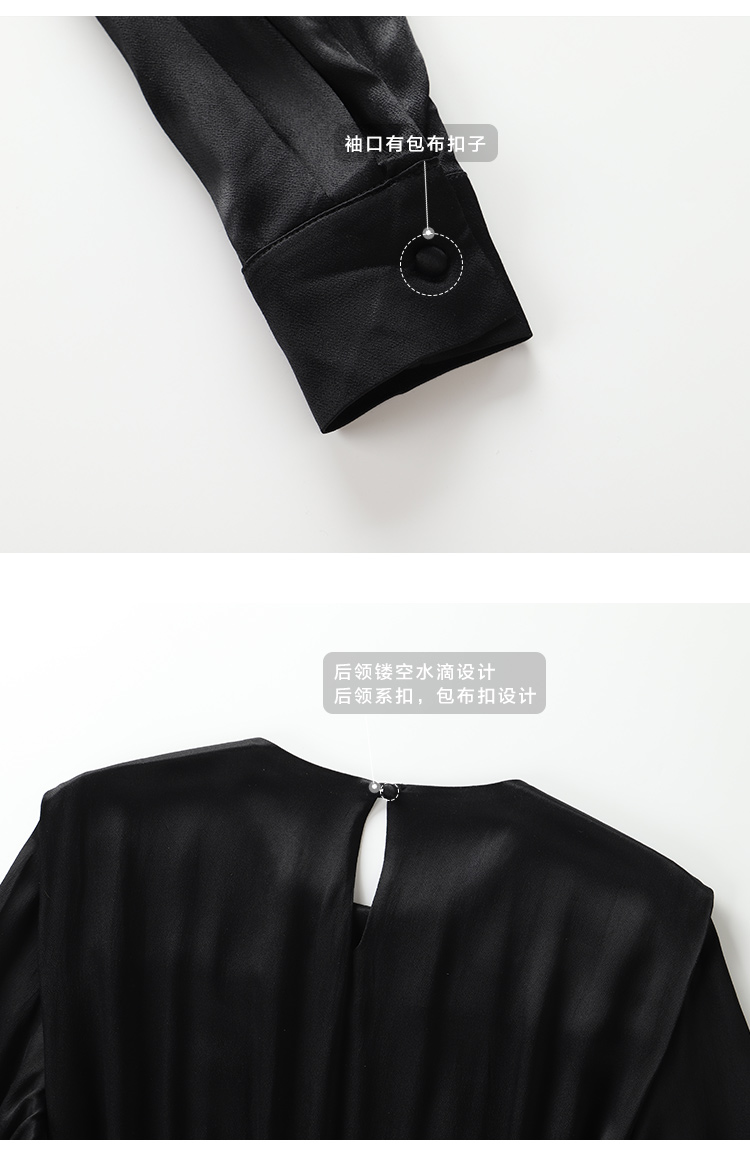面料成分/Composition 面料名称:丝滑质感缎面面料 面料成分:面料:100%粘纤 里料:89%聚酯纤维11%氨纶 面料说明:面料带有光泽感,手感柔软顺滑,穿着舒适透气,带有垂坠质感