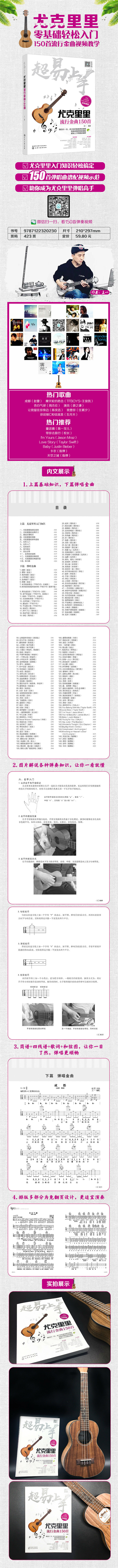 《超易上手——尤克里里流行金曲150首》上篇用简单易懂,层次分明的语言将学习尤克里里将会涉及到的乐理知识讲述;在下篇的金曲弹唱部分选了年轻人们传唱度很高的150首曲目,很多歌曲都是娱乐节目中歌星经常唱的,曲目新,旋律有亲和感,作者将150首歌曲均录制了视频,封面印刷二维码示范,能让读者更加直观的弹唱尤克里里。