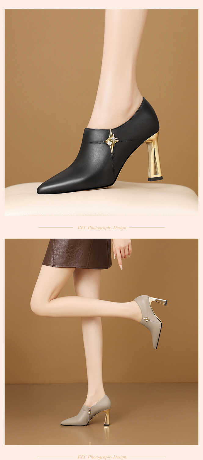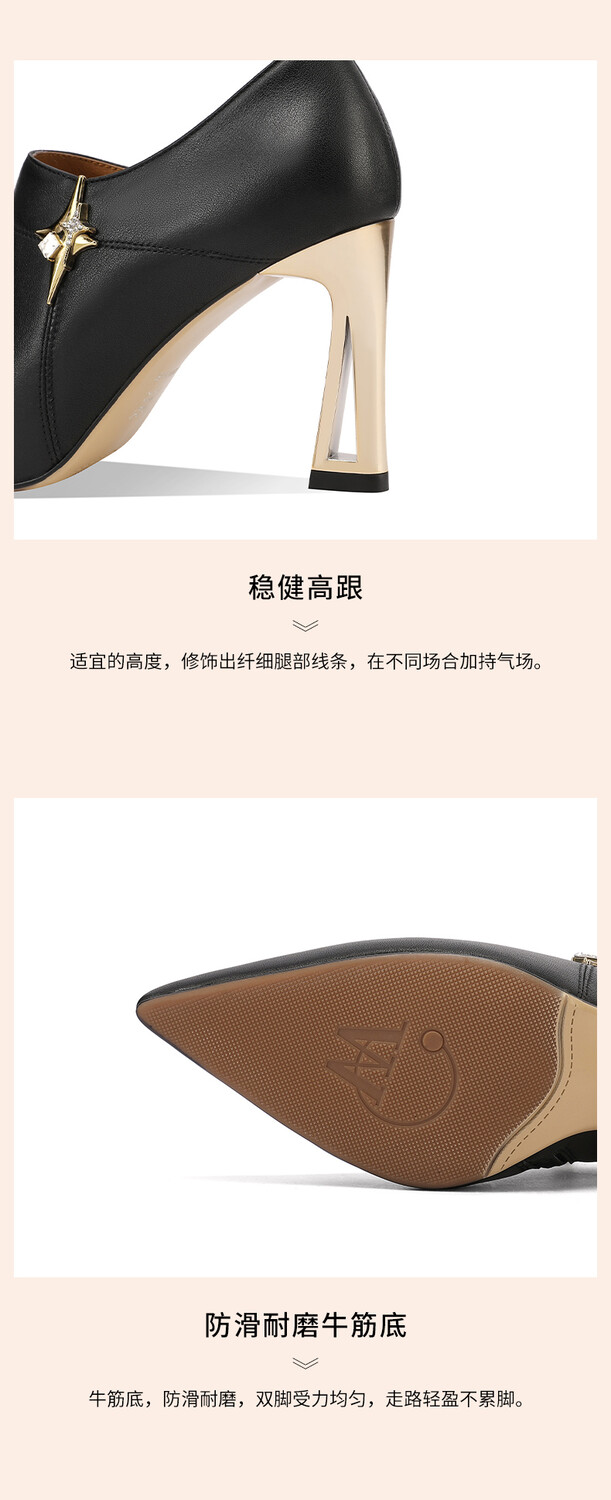 【预售5天】水钻黑色真皮单鞋女春秋季新款深口粗跟小皮鞋时尚尖头高跟鞋HY&H3491