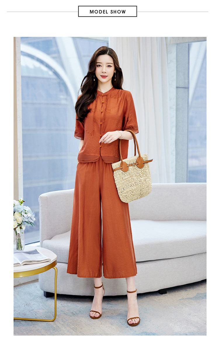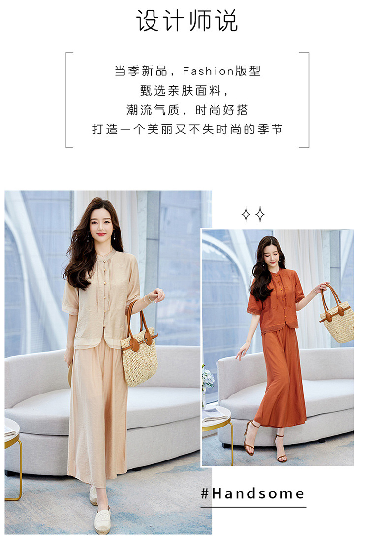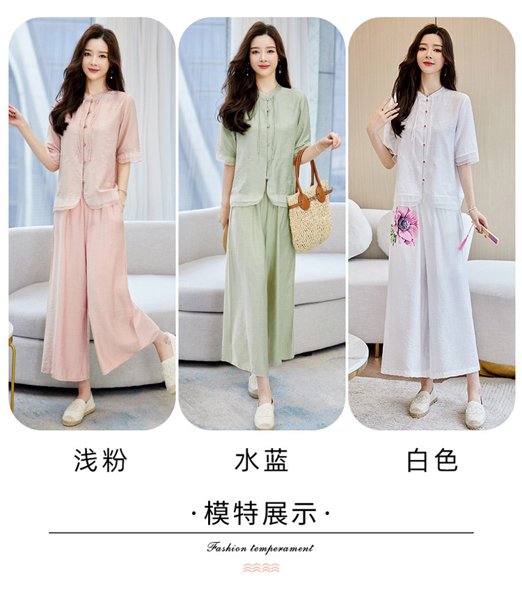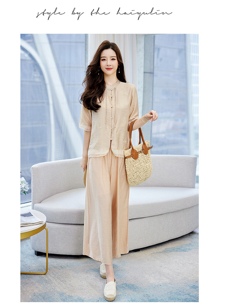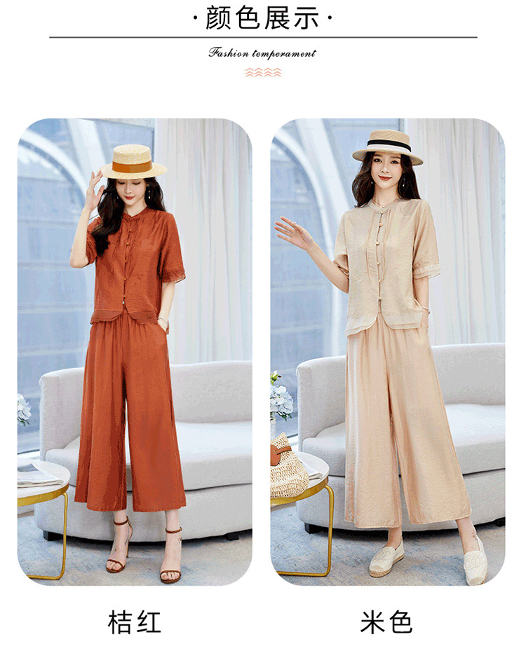 HR WY89099套装复古民族风薄款纯色拼接阔腿裤两件套