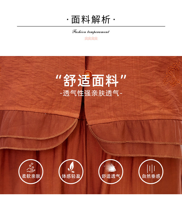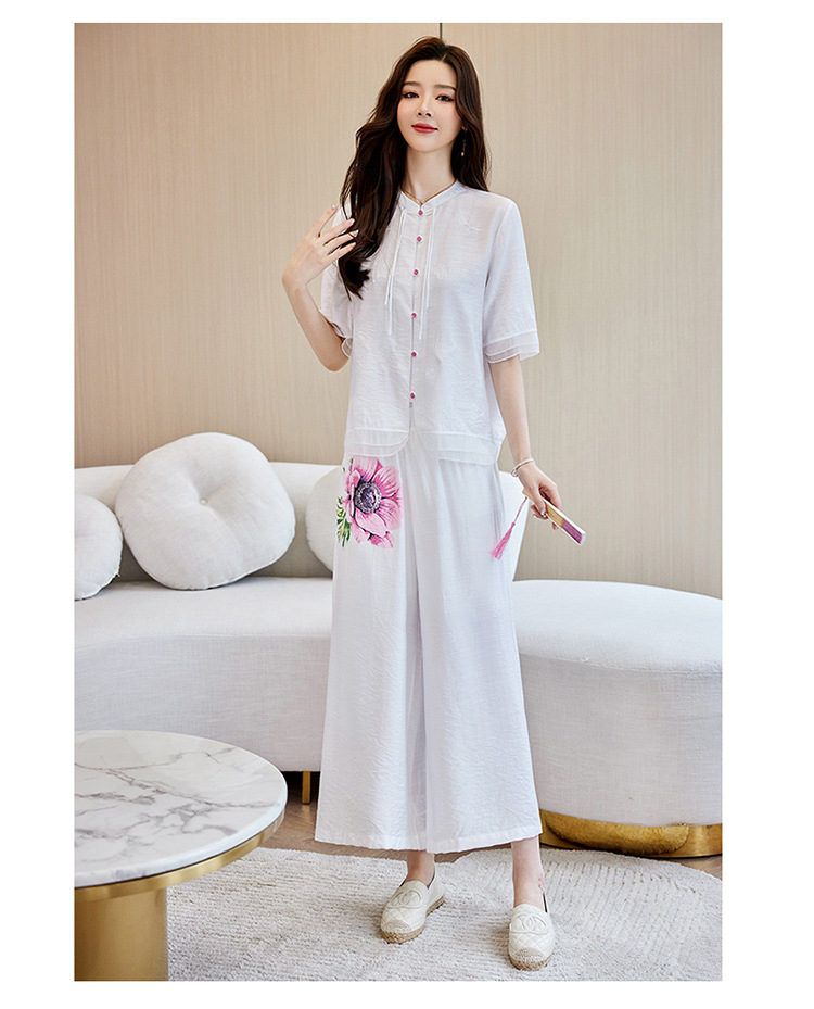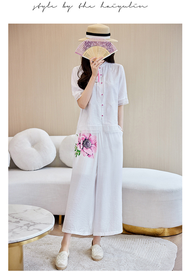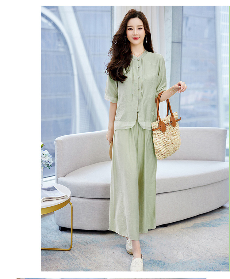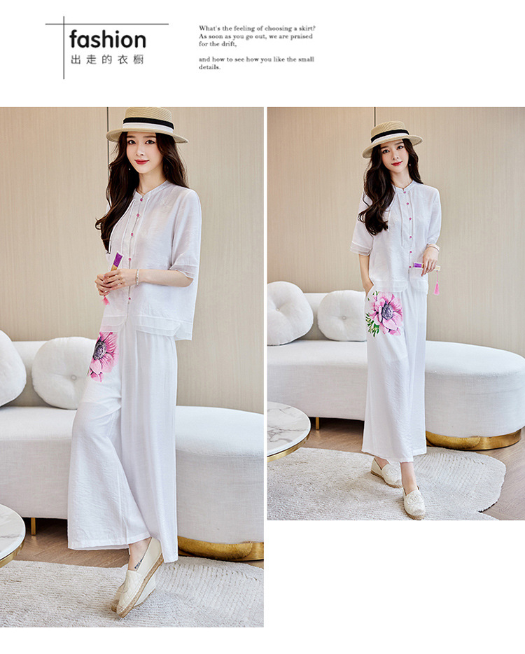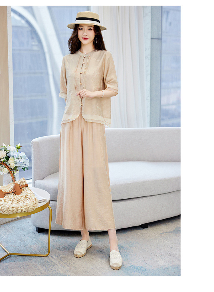 HR WY89099套装复古民族风薄款纯色拼接阔腿裤两件套