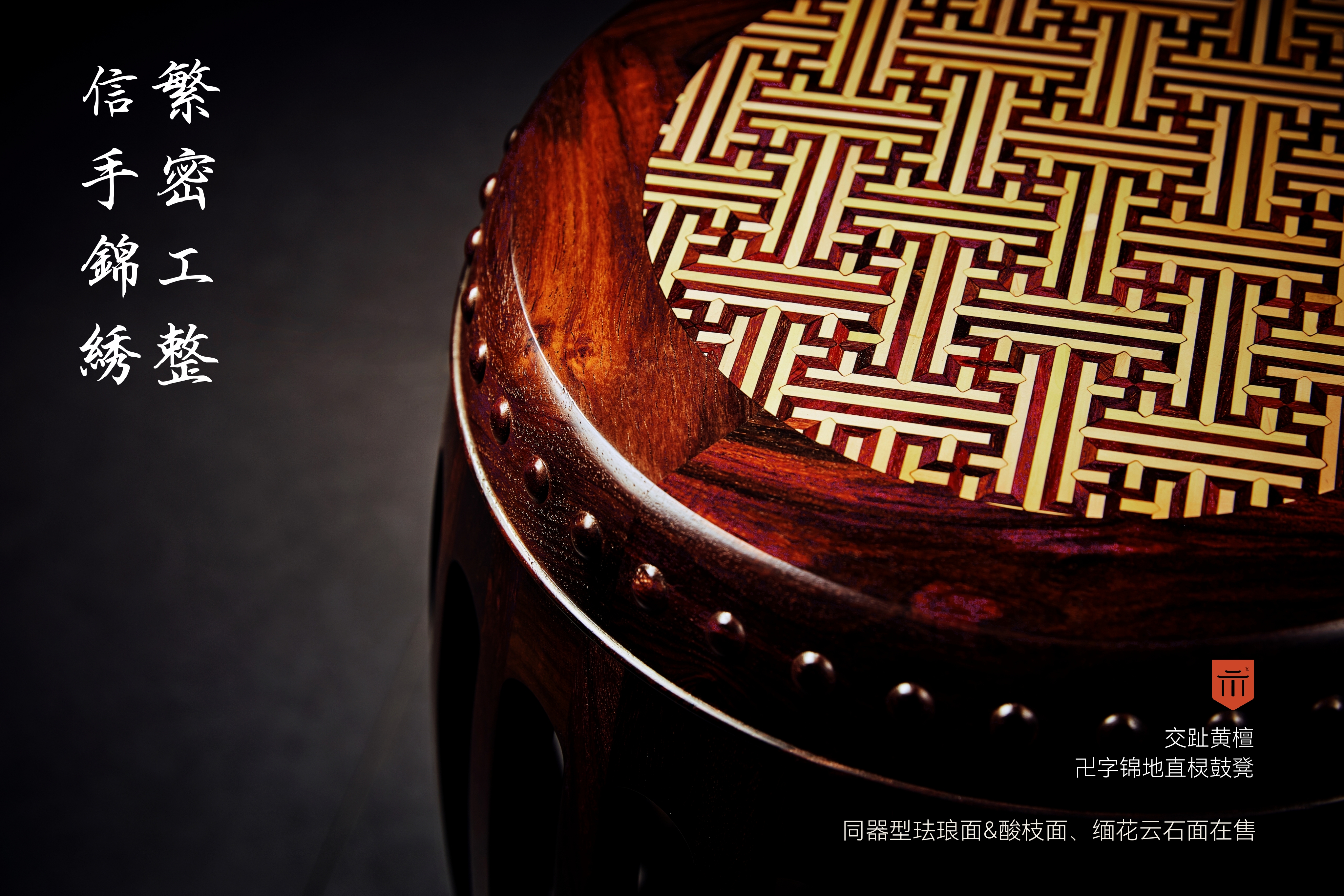 此墩原型为清·紫檀直棂式坐墩,外形仿鼓造型,坐面攒框嵌黄杨木卍字锦地纹,繁密工整,卍字纹为太阳与火之徽,释伽牟尼胸部万德吉祥之形,武则天长寿二年定音读“萬”,寓意福寿延绵,万代千秋。上下两排鼓钉柔和隐起乃铲地而做,弦纹简朴甚精颇费刮磨之姿,造型细高文雅;直棂式腔壁,木条夹短材,系取直棂窗及鸟笼的造法,允为王世襄先生著作类目基本型,底部装六足,平稳而美观,造型别致,十分少见。