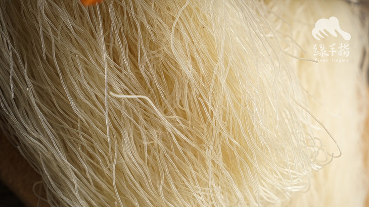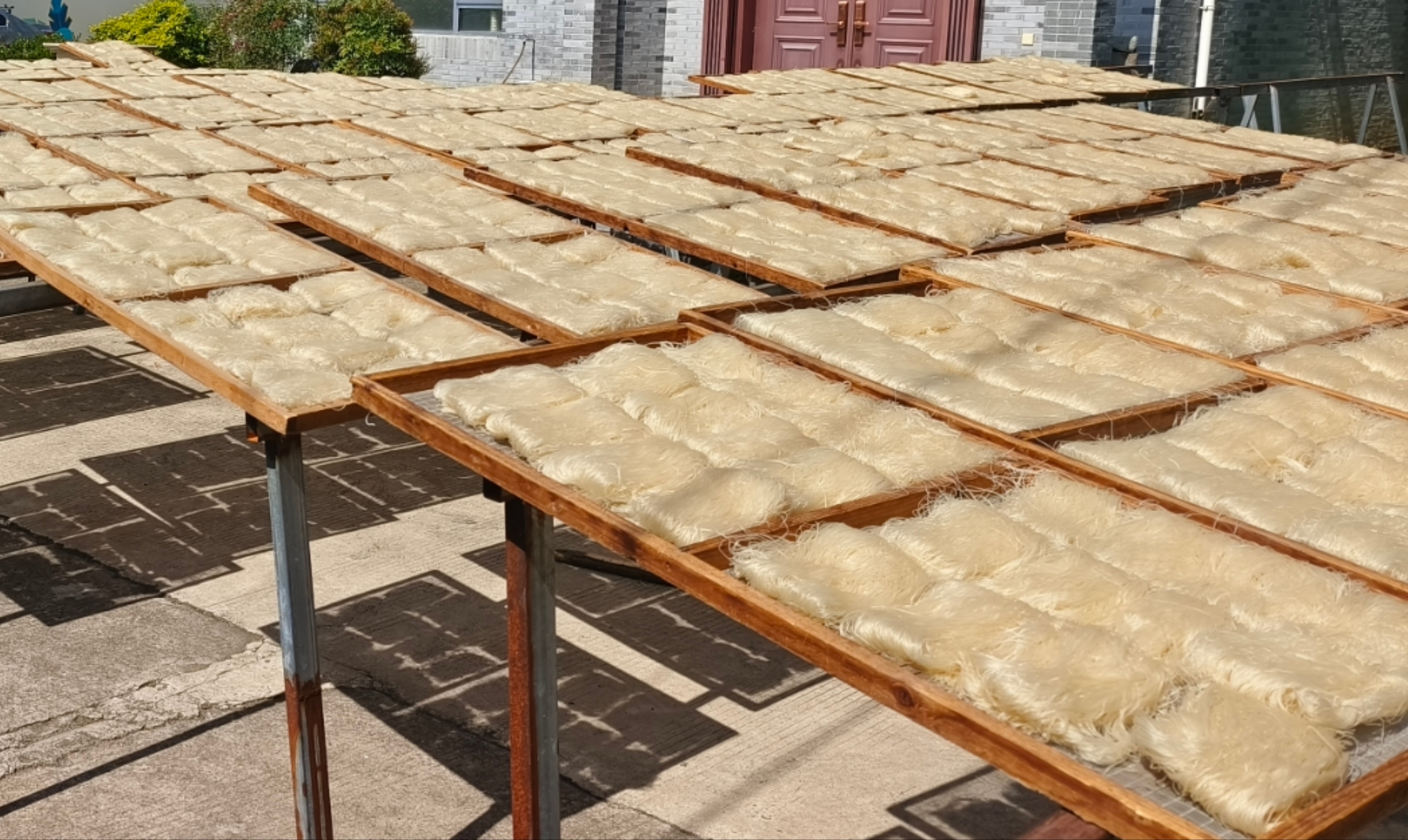 蒸熟与晒干:将老化好的粉丝入蒸汽柜彻底蒸熟后,挂起冷却后,入清水中浸泡散开后太阳下自然晒干。