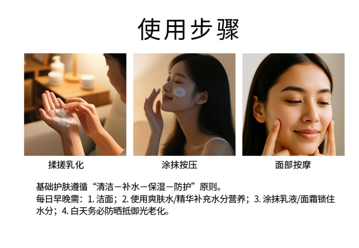 使⽤⽅法:取适量本品,均匀涂抹于面部肌肤,按摩吸收即可