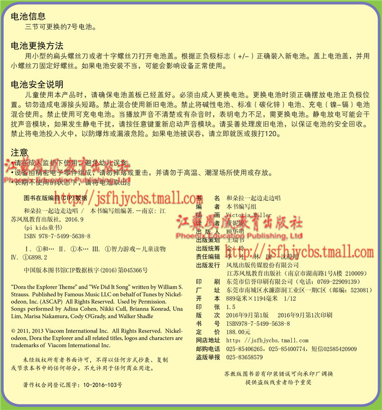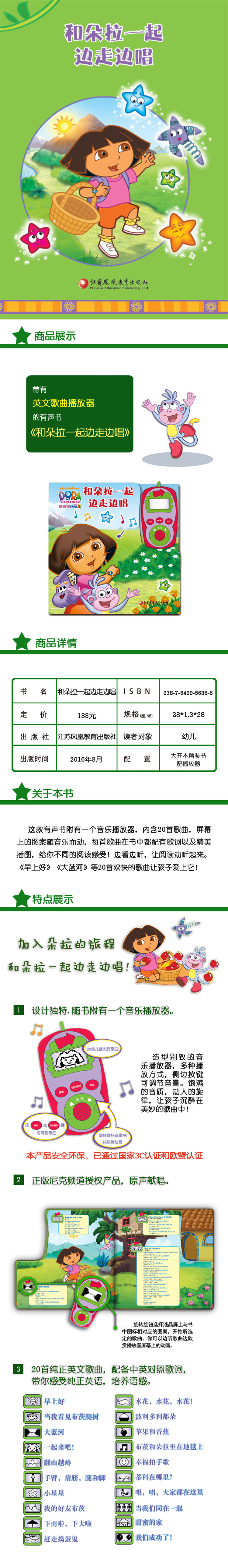 内含20首动画片《爱探险的朵拉》的歌曲,图书部分呈现歌词,并配以专门的音乐播放器,音乐播放器有显示屏幕,小巧方便幼儿可单独使用,也可配合图书,选定指定曲目播放。