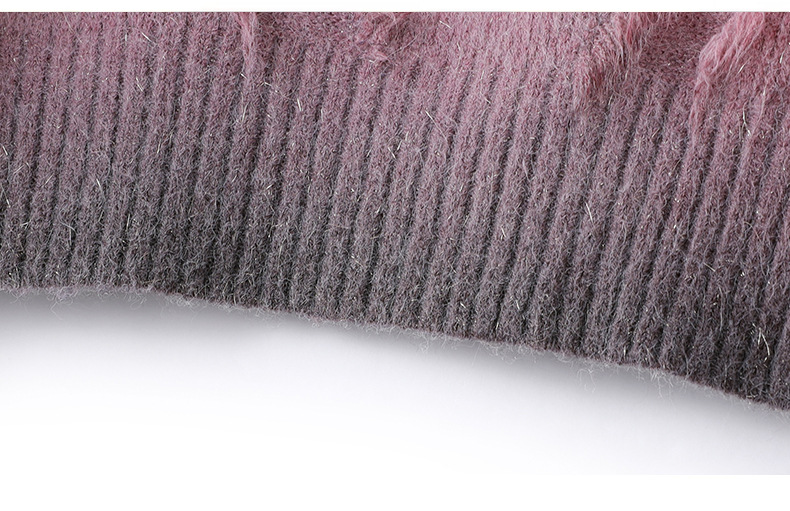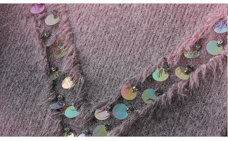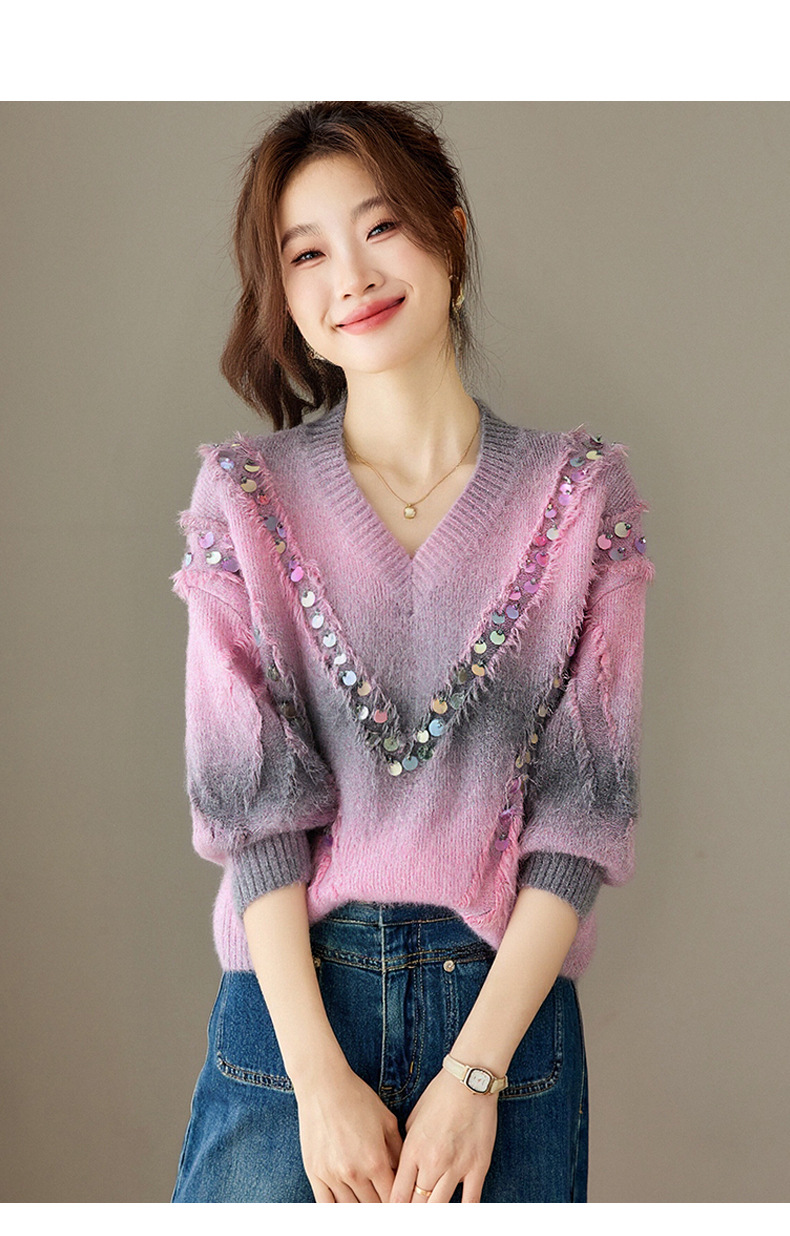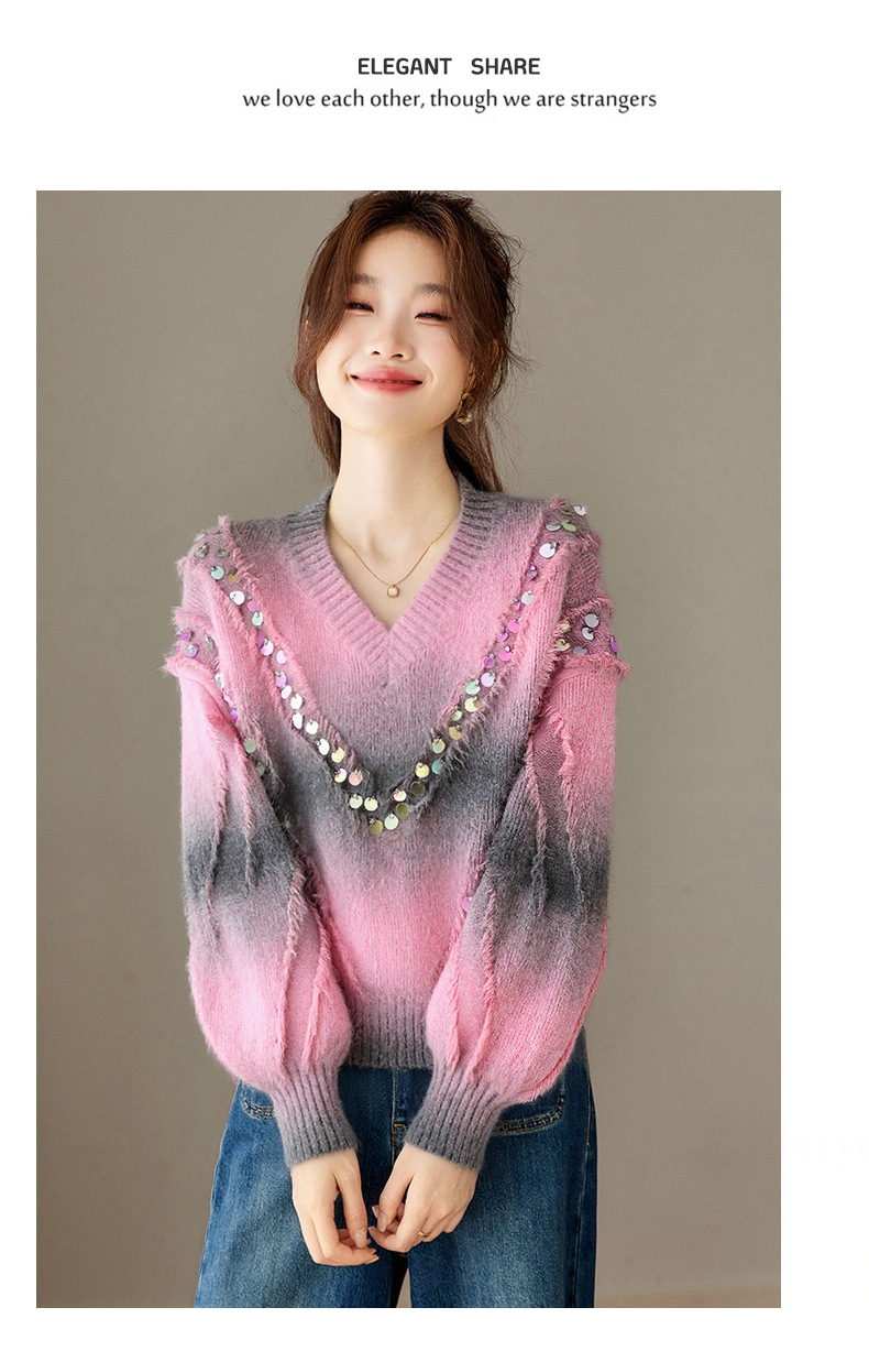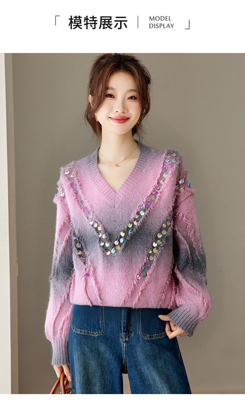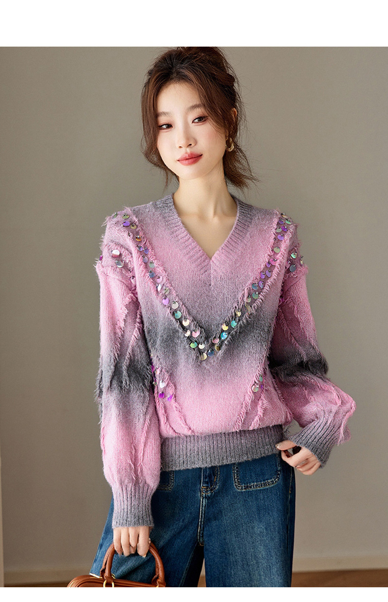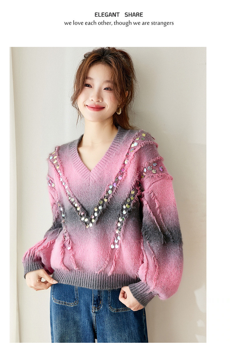 CC 2222复古渐变色V领亮片针织衫宽松毛衣遮肚流苏上衣