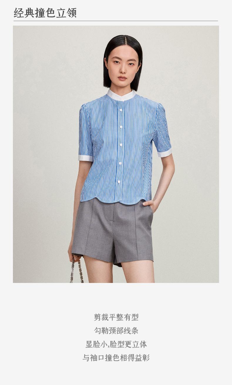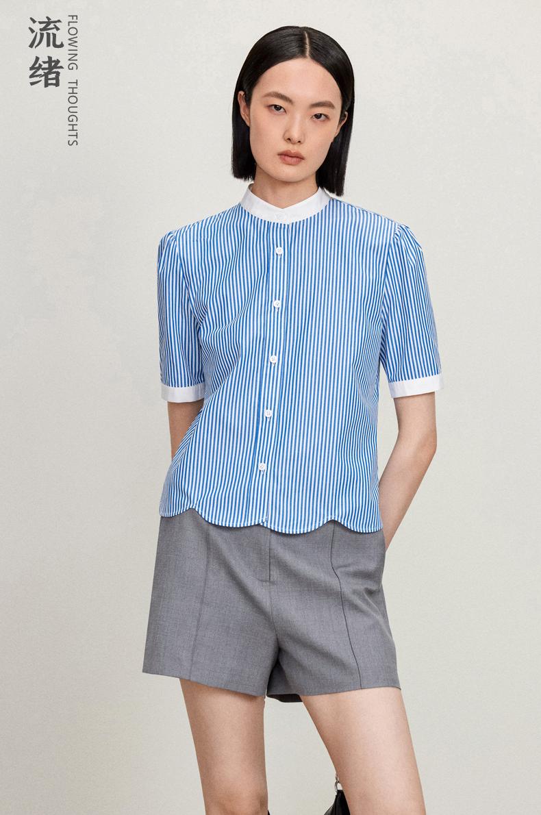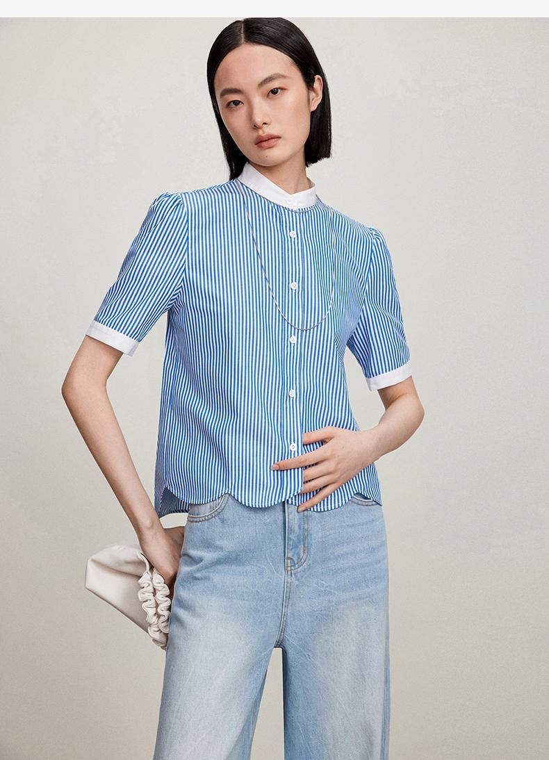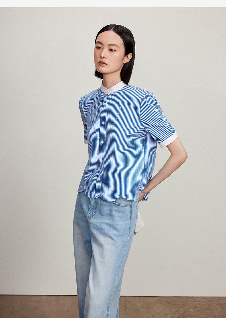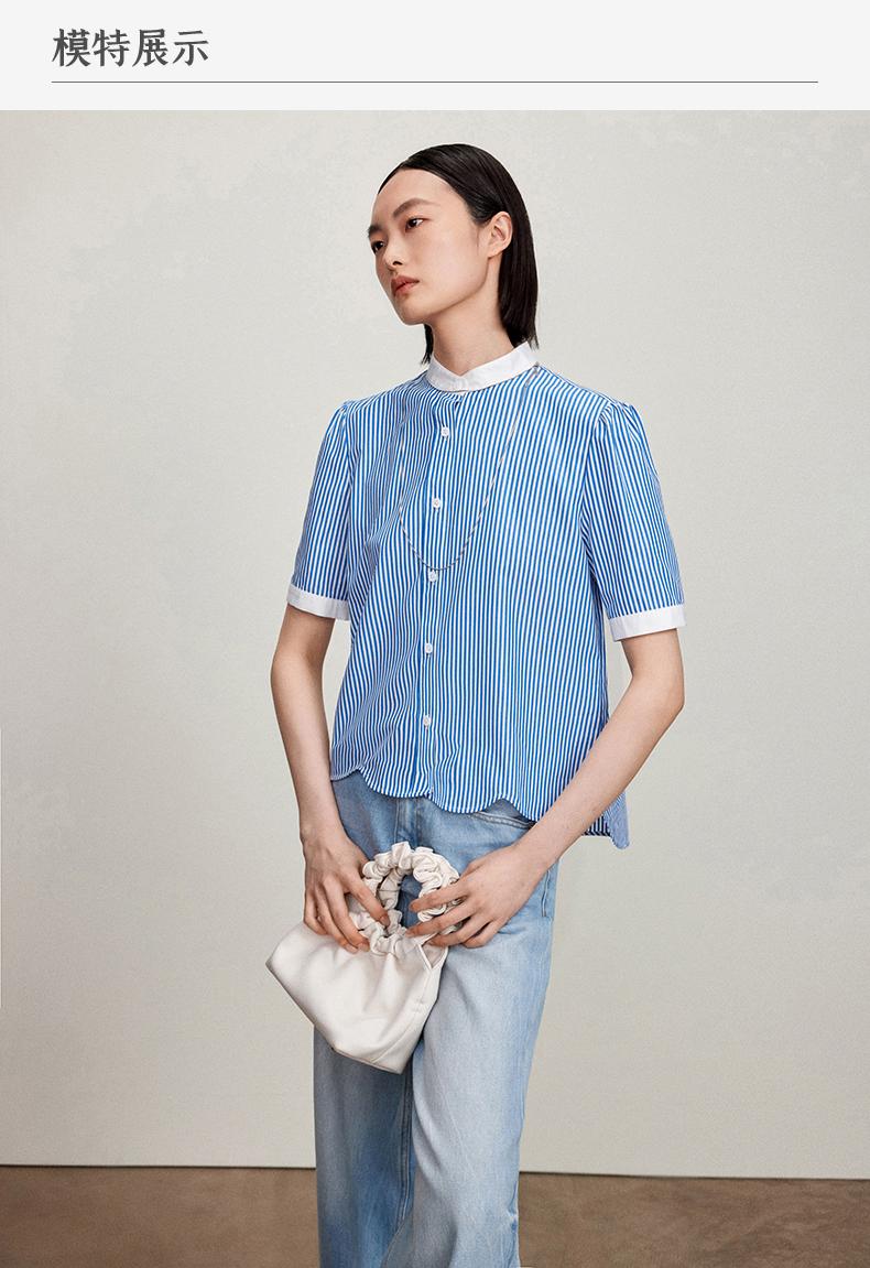 西嘉C+IMPRESS/西嘉立领花瓣下摆设计短袖竖条纹衬衫女撞色长绒棉上衣CS2402015