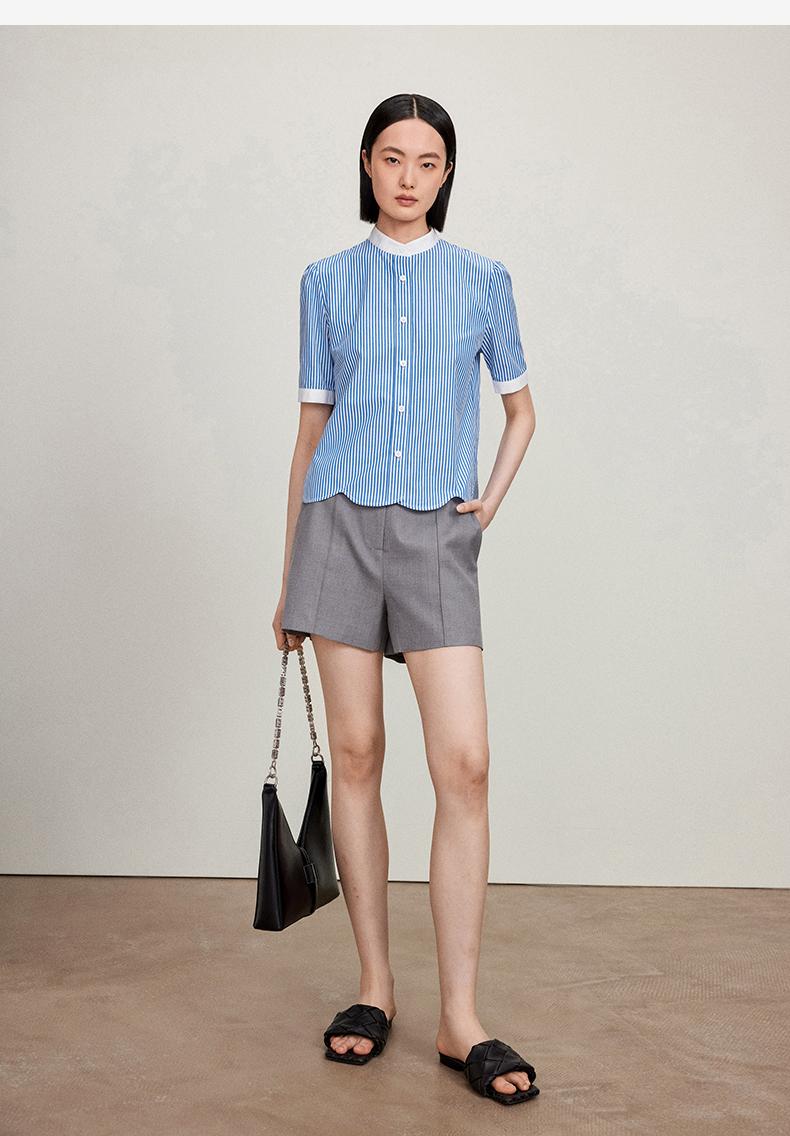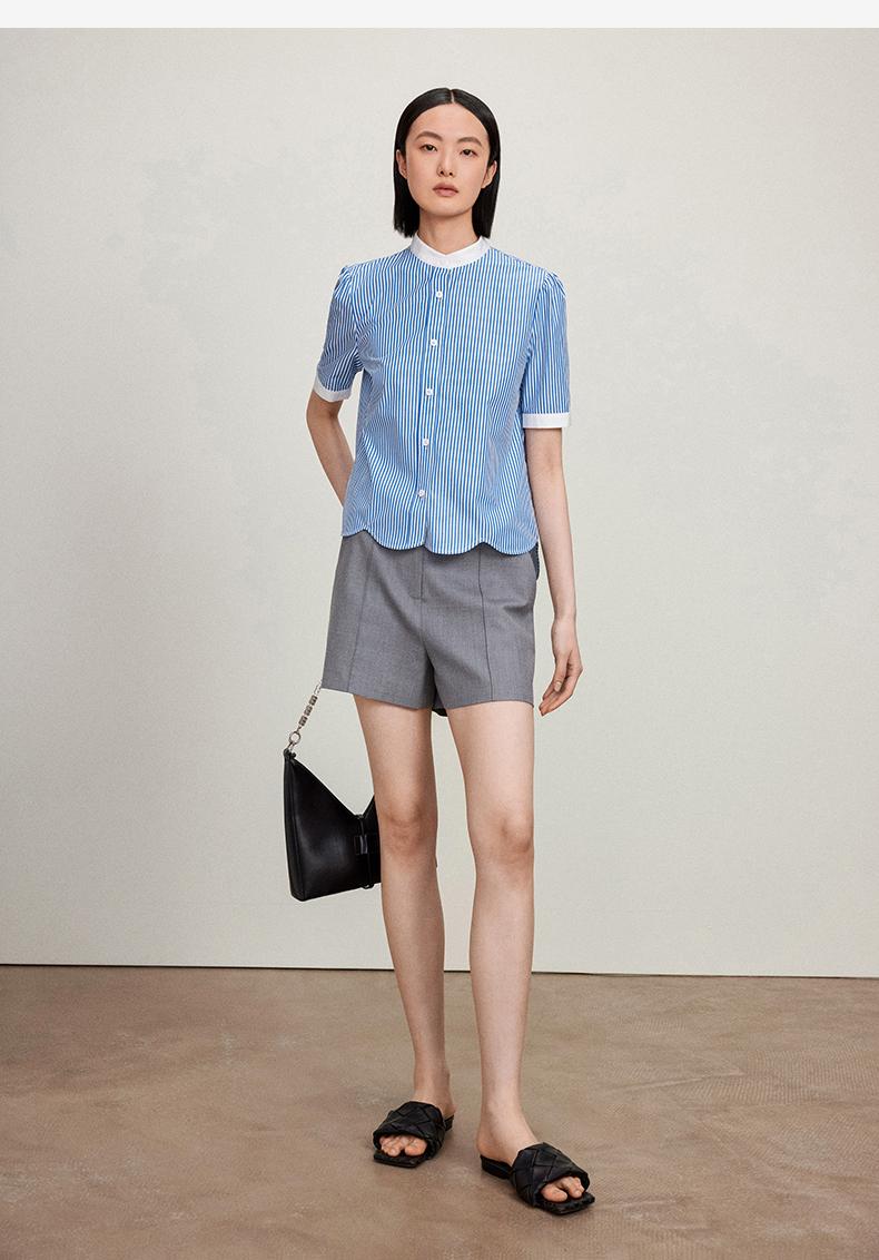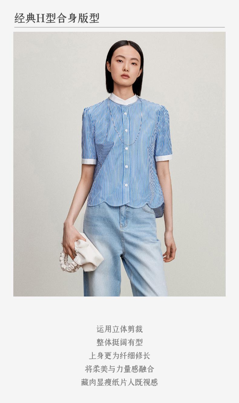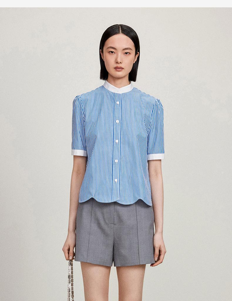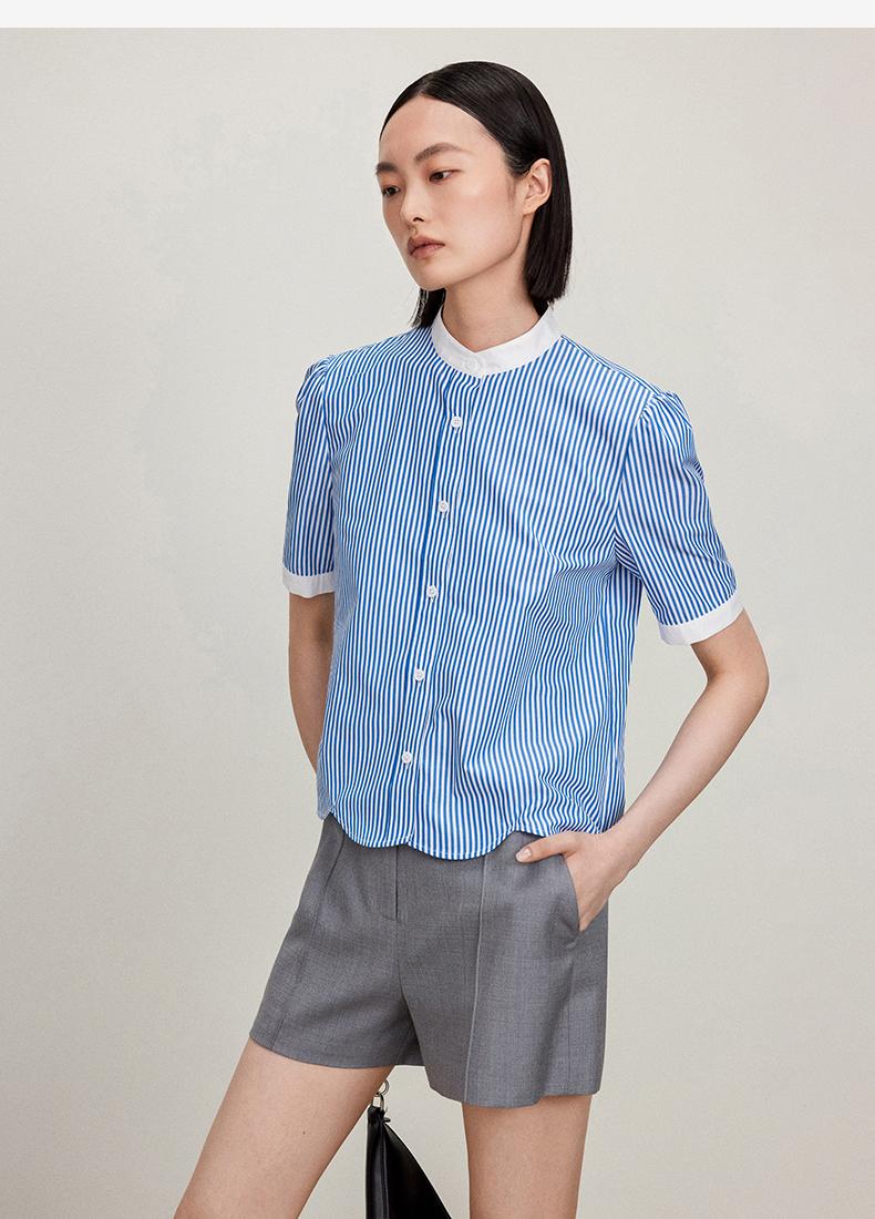 西嘉C+IMPRESS/西嘉立领花瓣下摆设计短袖竖条纹衬衫女撞色长绒棉上衣CS2402015