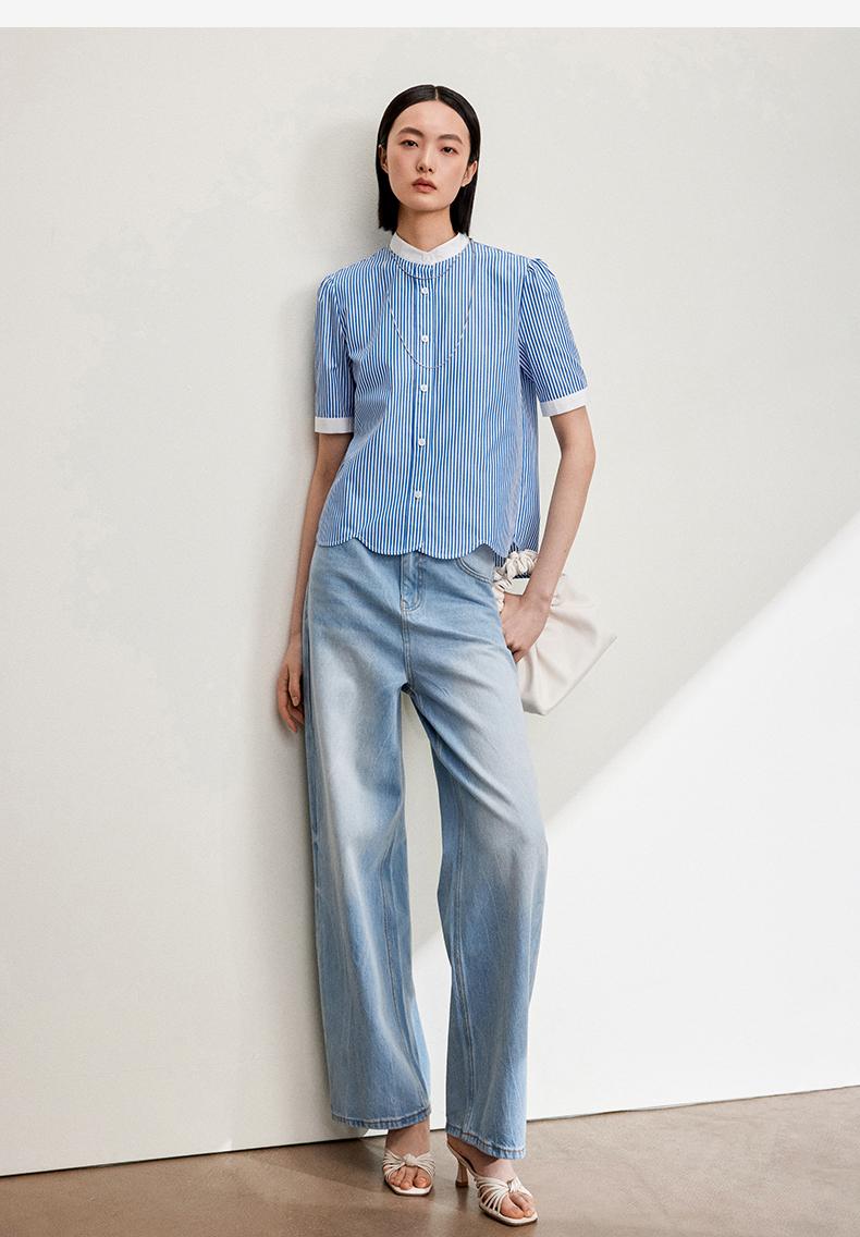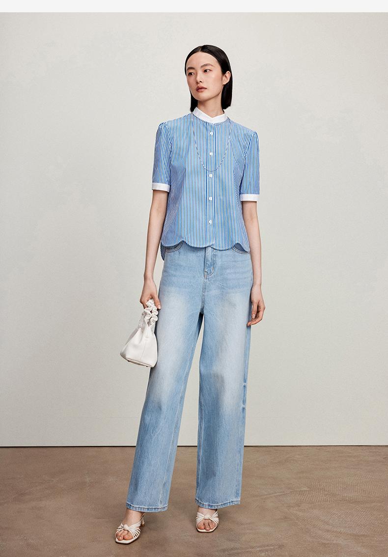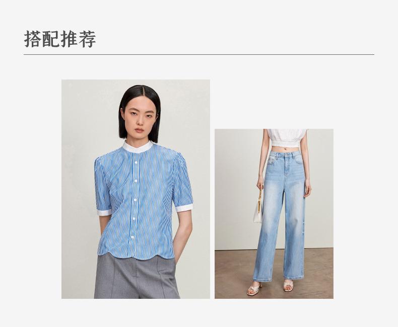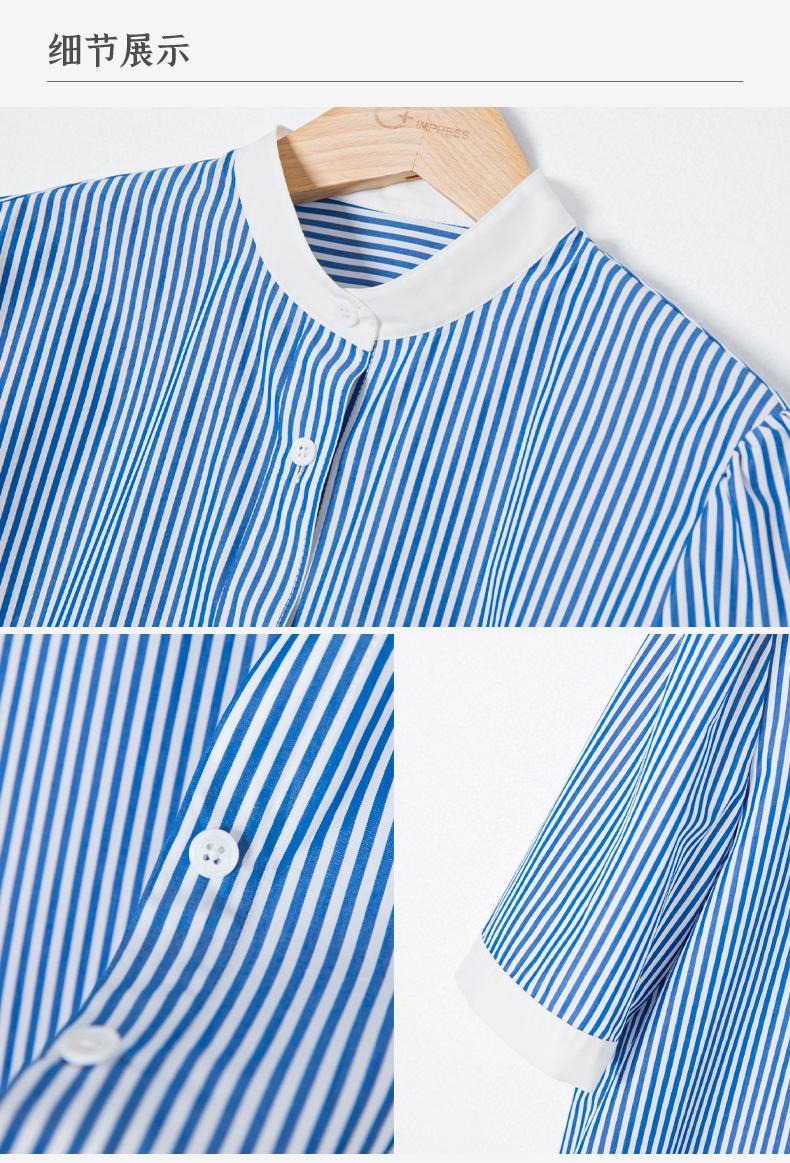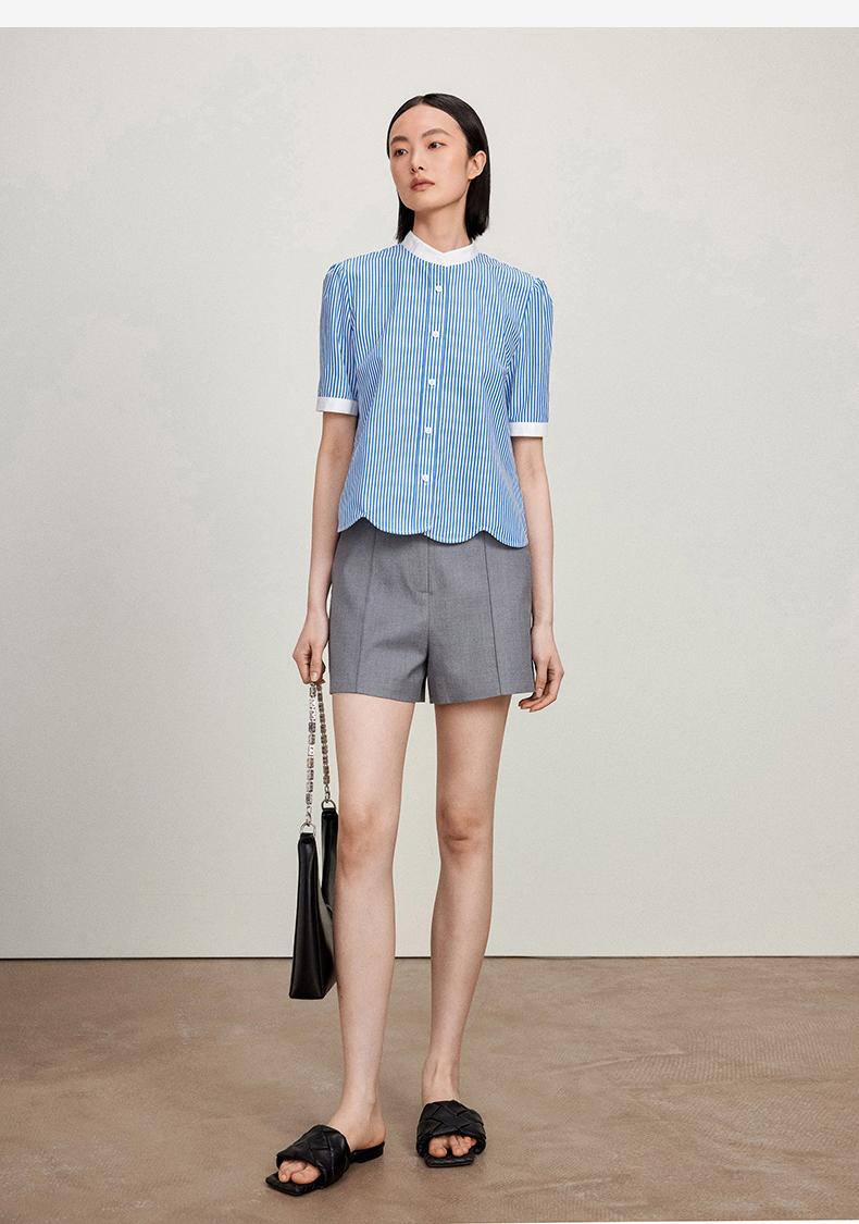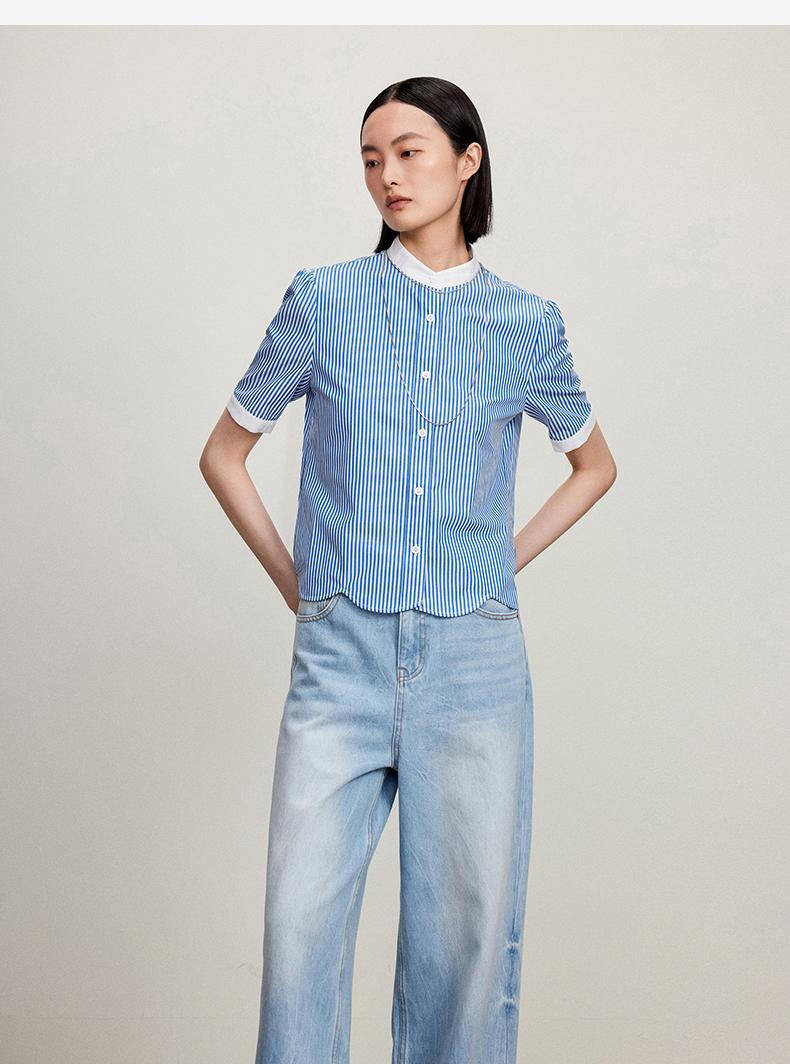 西嘉C+IMPRESS/西嘉立领花瓣下摆设计短袖竖条纹衬衫女撞色长绒棉上衣CS2402015