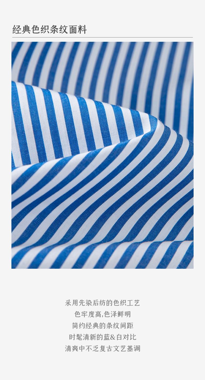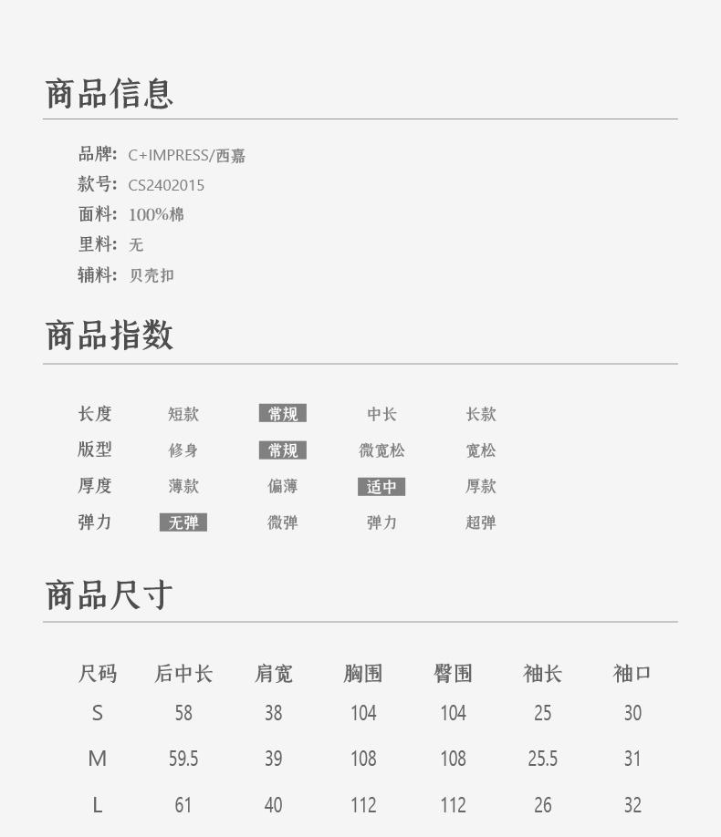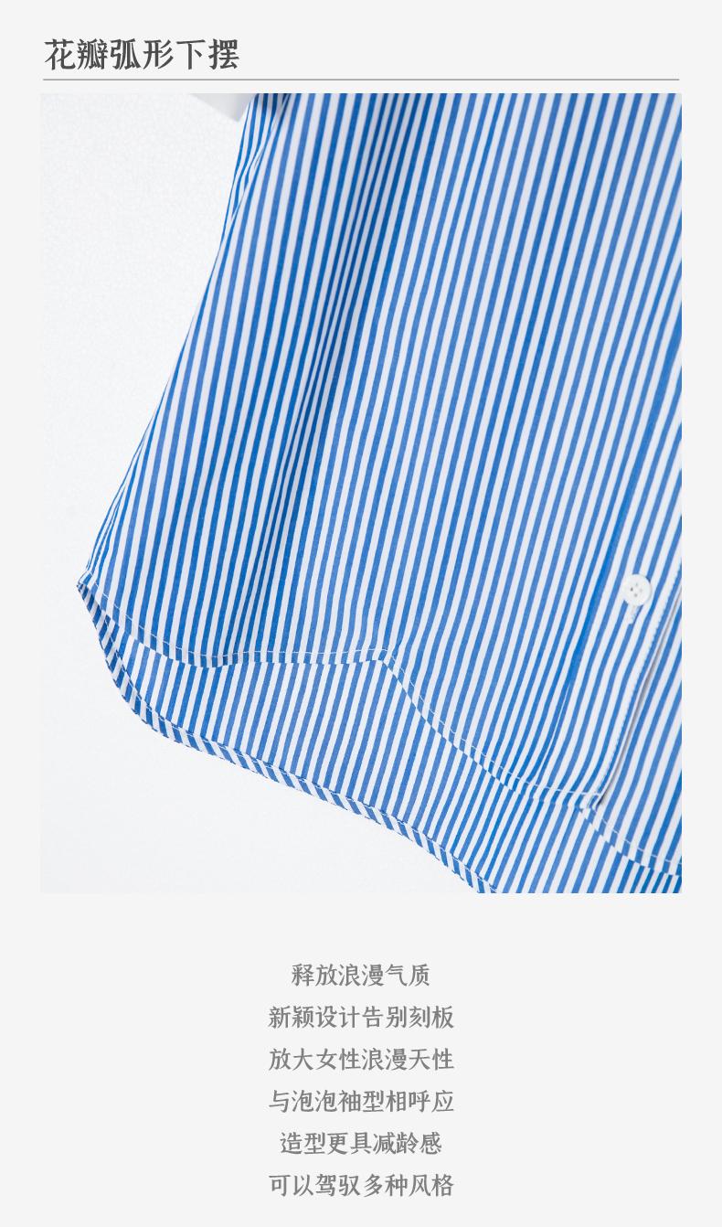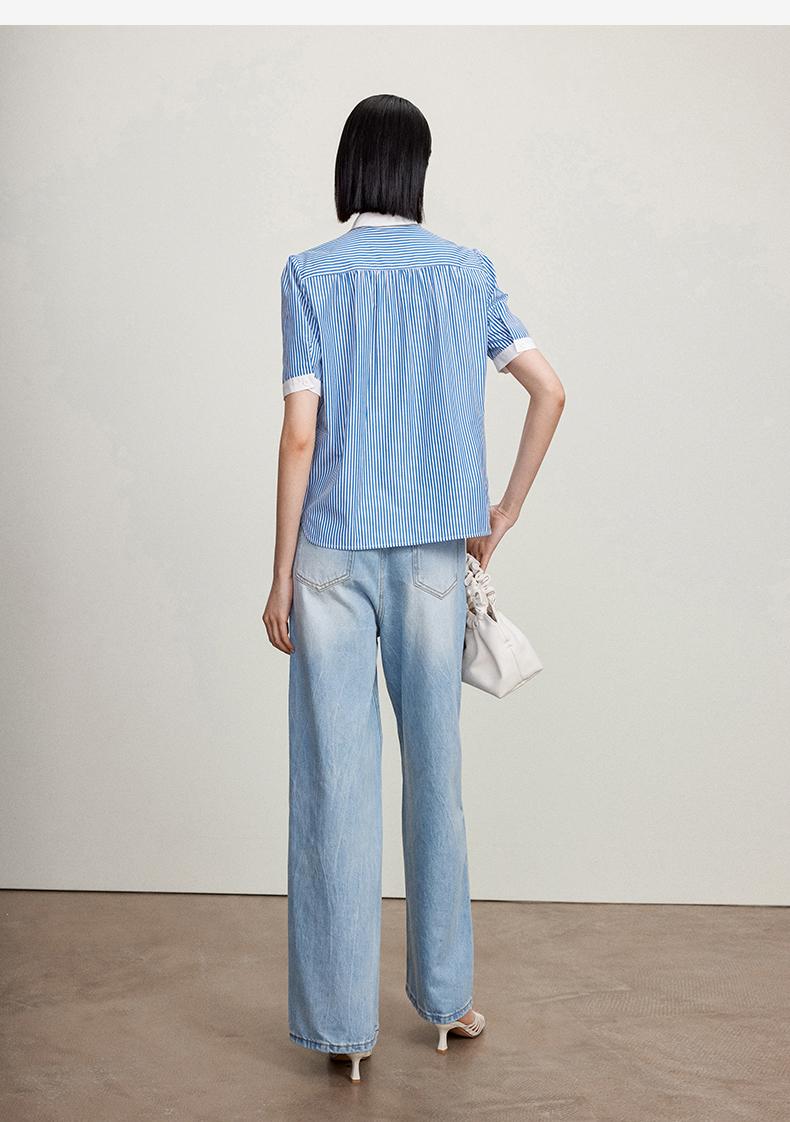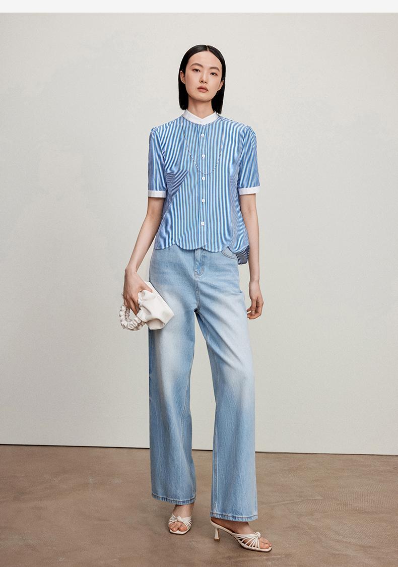 西嘉C+IMPRESS/西嘉立领花瓣下摆设计短袖竖条纹衬衫女撞色长绒棉上衣CS2402015