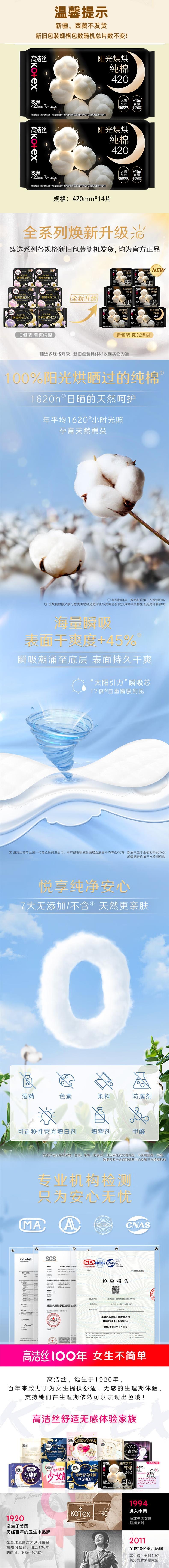 高洁丝 全新阳光烘烘纯棉夜用卫生巾420mm7片*2包 JGSOHY7P2B