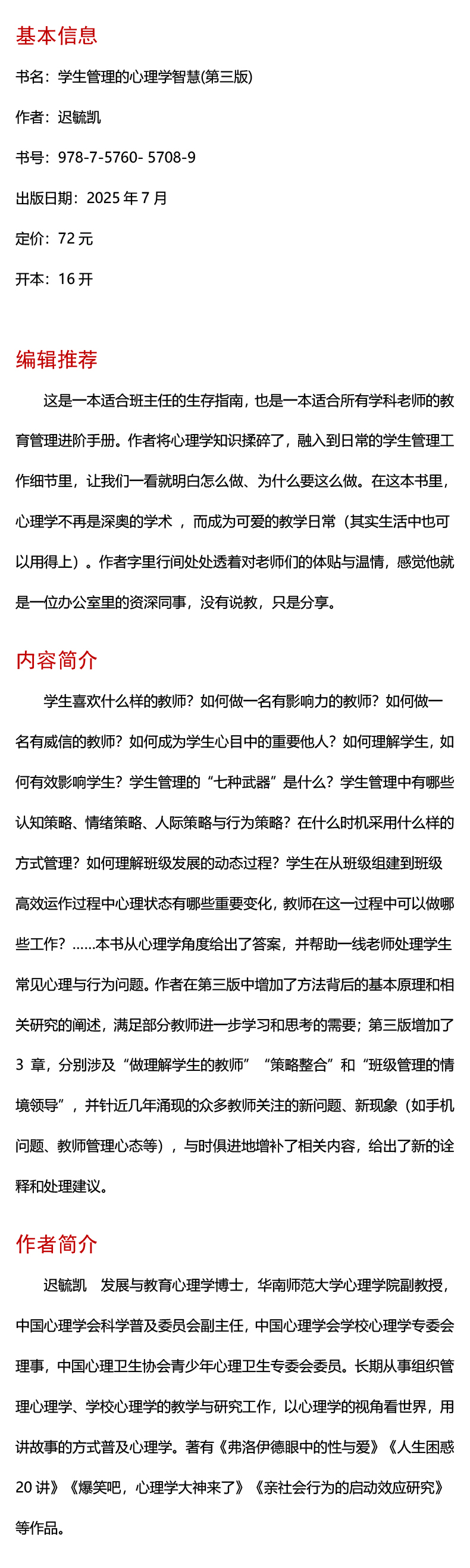 学生管理的心理学智慧 第三版 迟毓凯 班主任生存指南 学校订购电话/微信15080035301
