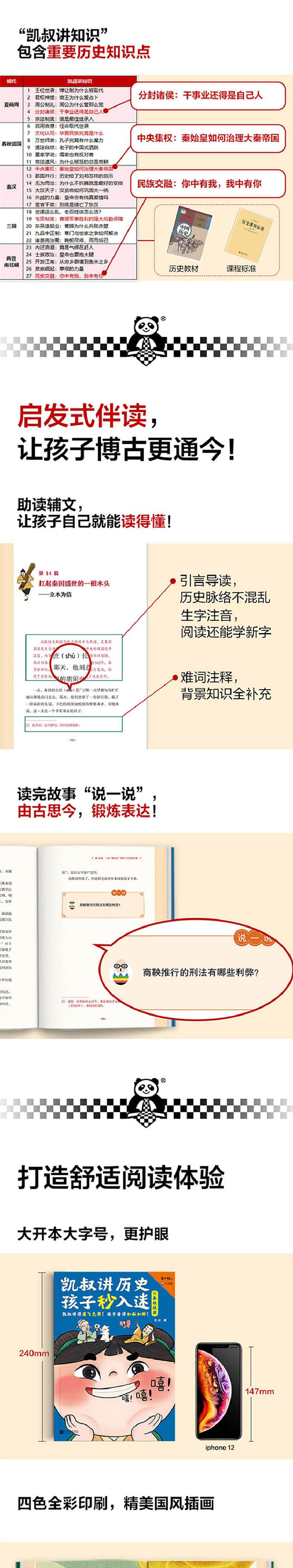 6大特色版块:朝代综述、大事年表、历史故事、观复猫讲文物、凯叔讲知识、说一说,让历史变得清晰、直观,让孩子结合自身思考历史问题!