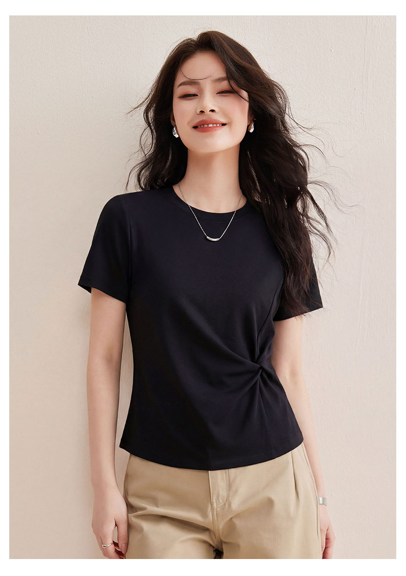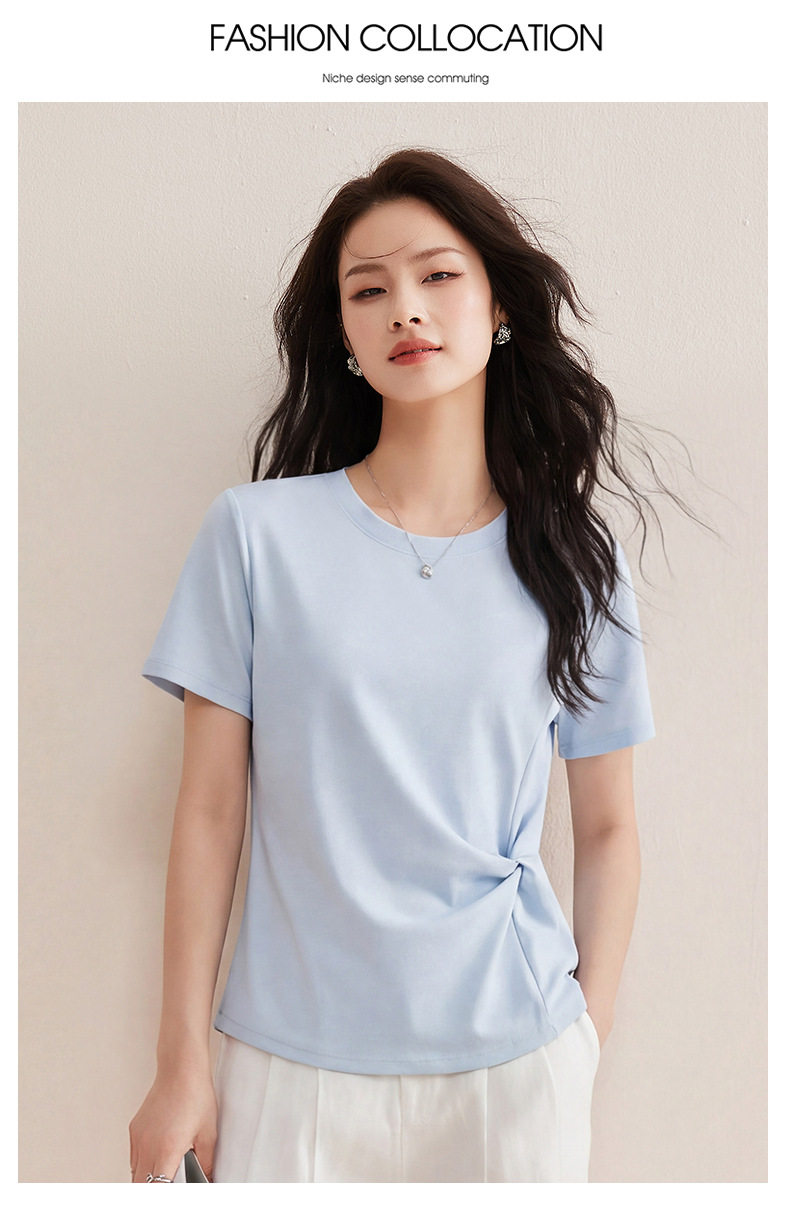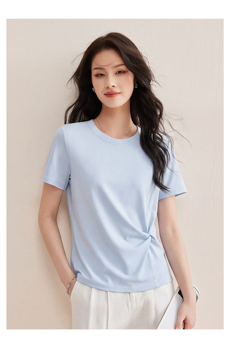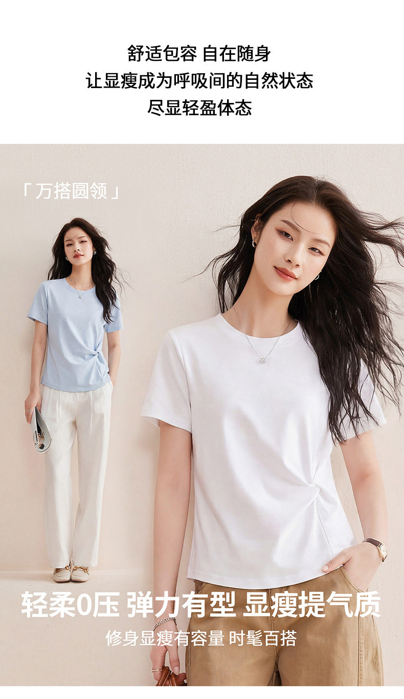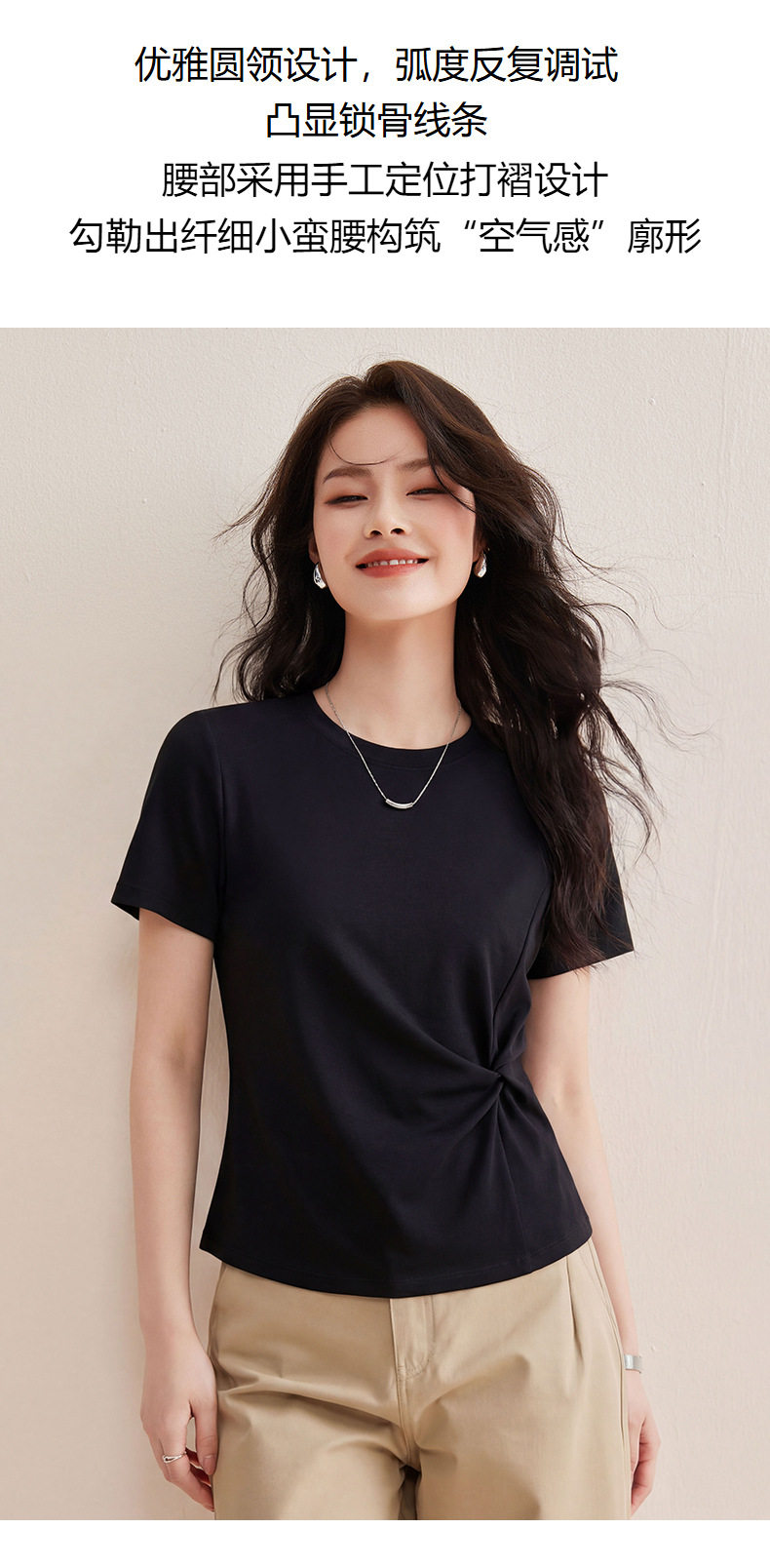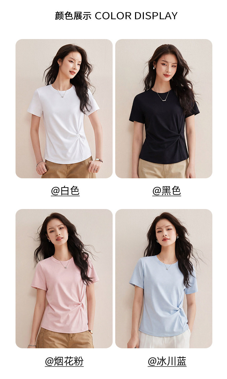 「自」全新升级【铂金会员128/天猫169/差价41】(05756)洛诗琳气质小蛮腰丝光棉T恤女2026夏季正肩纯色修身扭结上衣