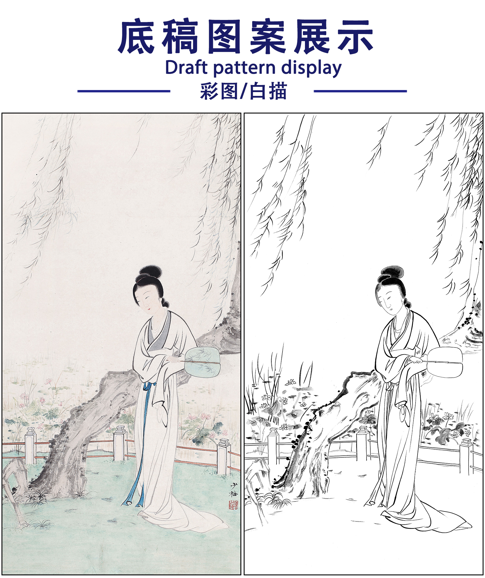 陈少梅人物仕女工笔画白描底稿《纨扇仕女图》临摹勾线高清打印稿SM64