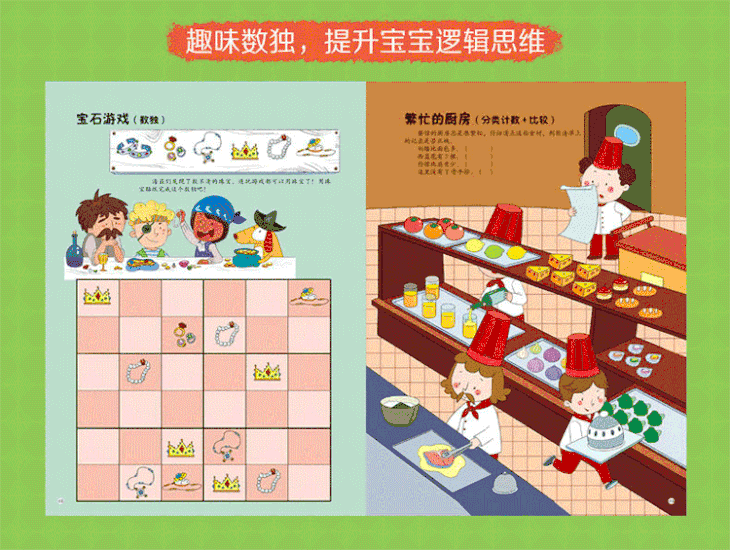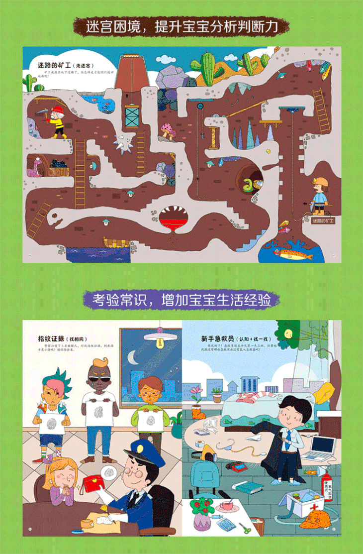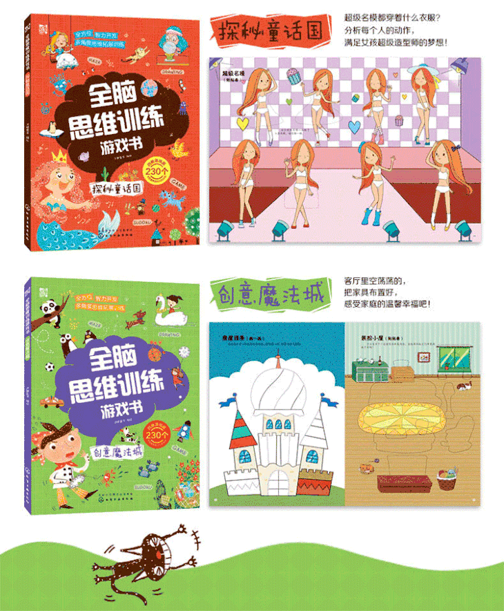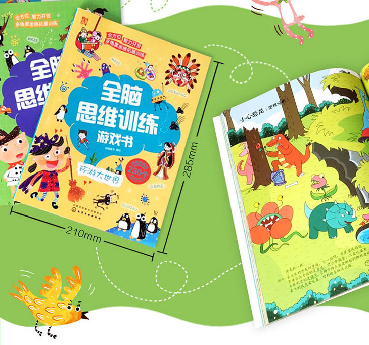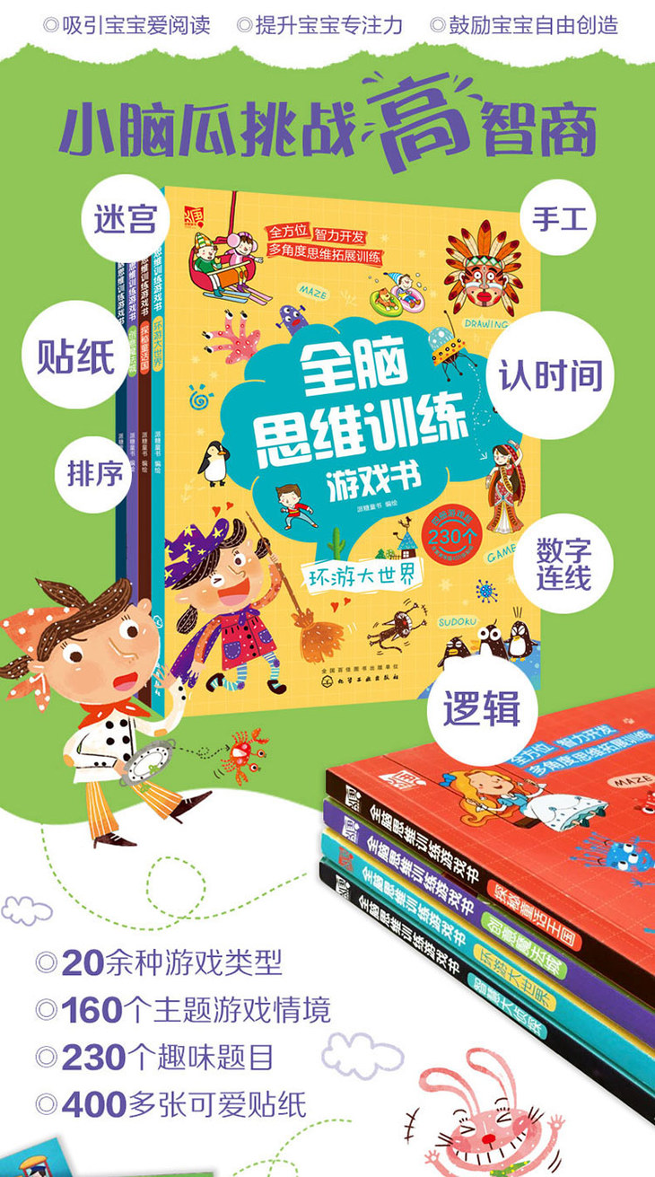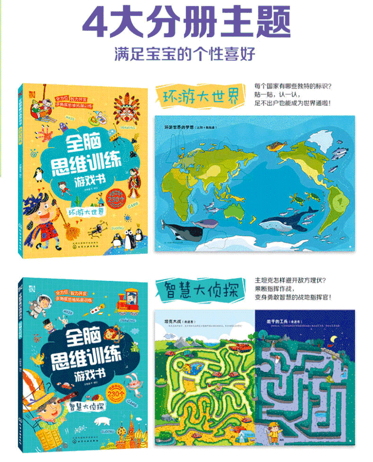 1.全脑思维训练游戏书主题有智慧大侦探、创意魔法城、环游大世界、探秘童话王国,增加孩子们话题感,让孩子脑洞大开;