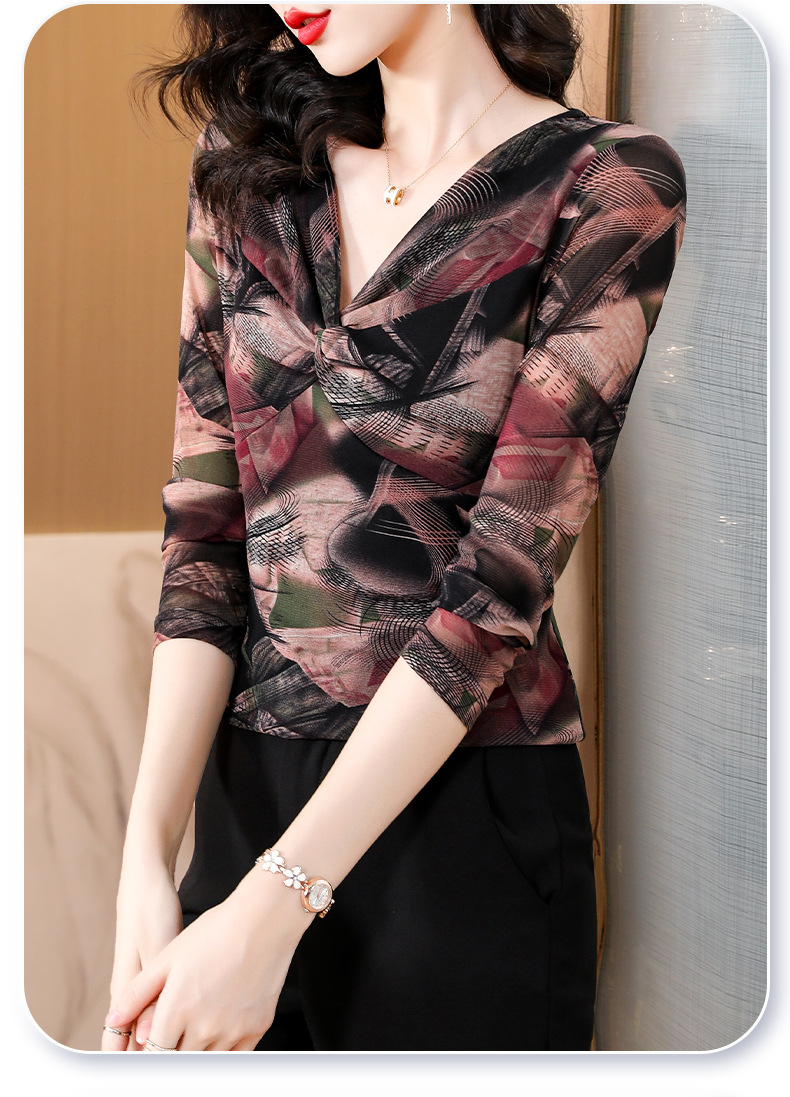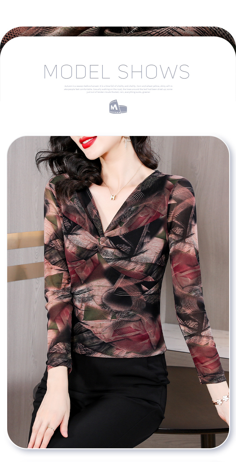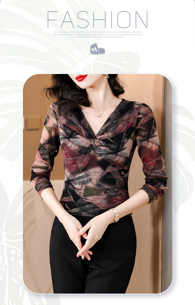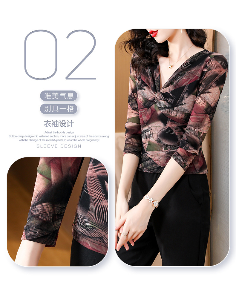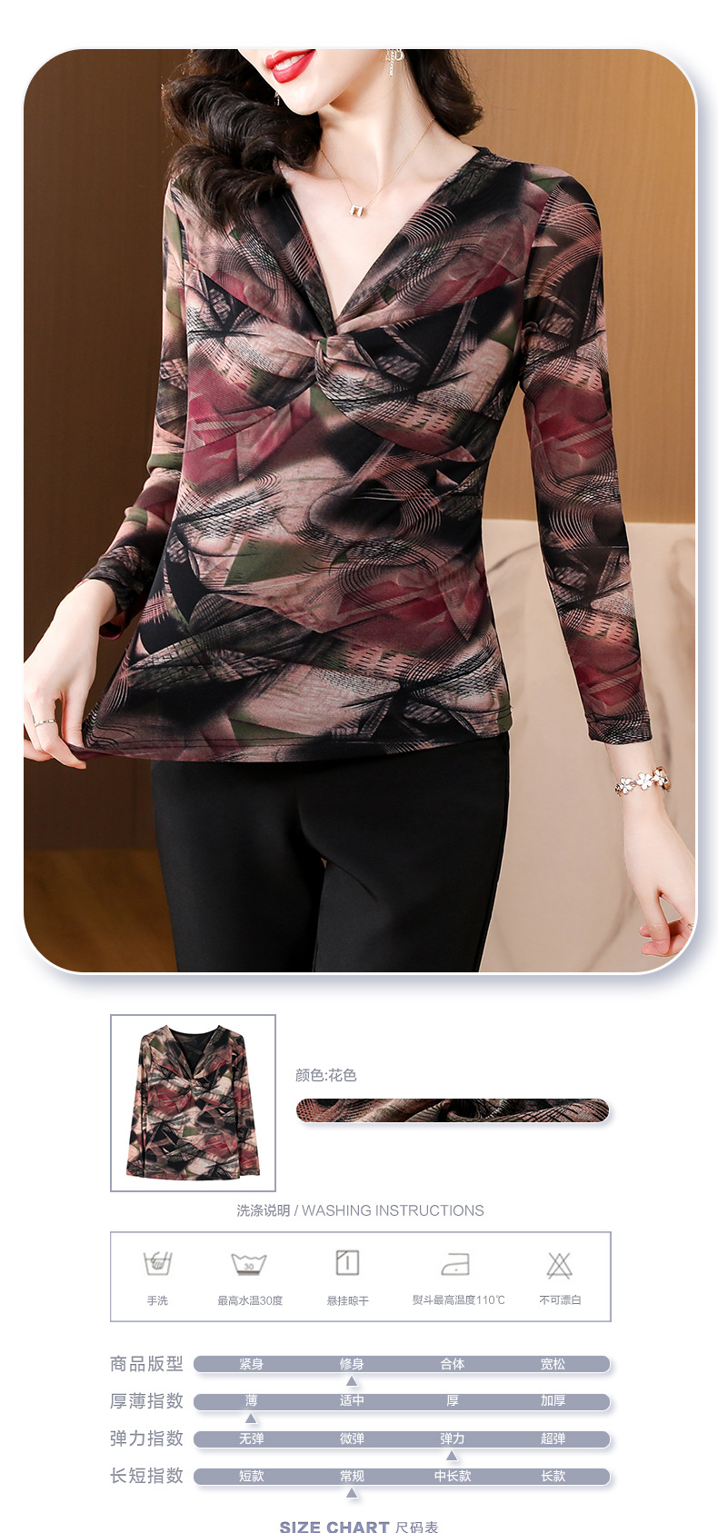 KQLA12N2202 2023秋冬新款网纱上衣印花洋气大码女士打底上衣长袖弹力小衫