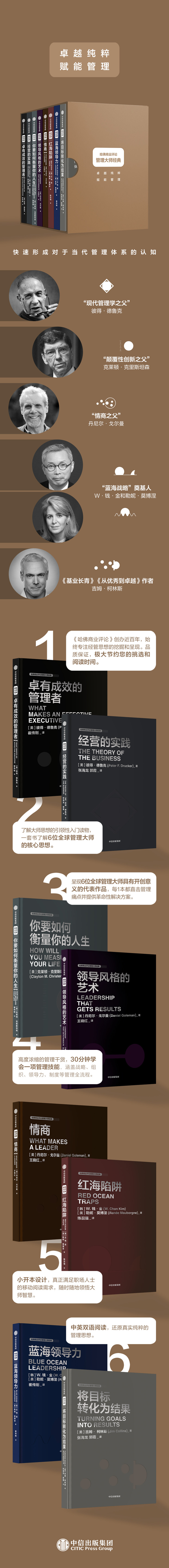 一套8本,了解6位管理大师思想的入门读物;“现代管理学之父”彼得·德鲁克 ;“颠覆性创新之父”克莱顿·克里斯坦森;“之父”丹尼尔·戈尔曼;“蓝海战略”奠基人W.钱·金、勒妮·莫博涅;《基业长青》作者吉姆·柯林斯