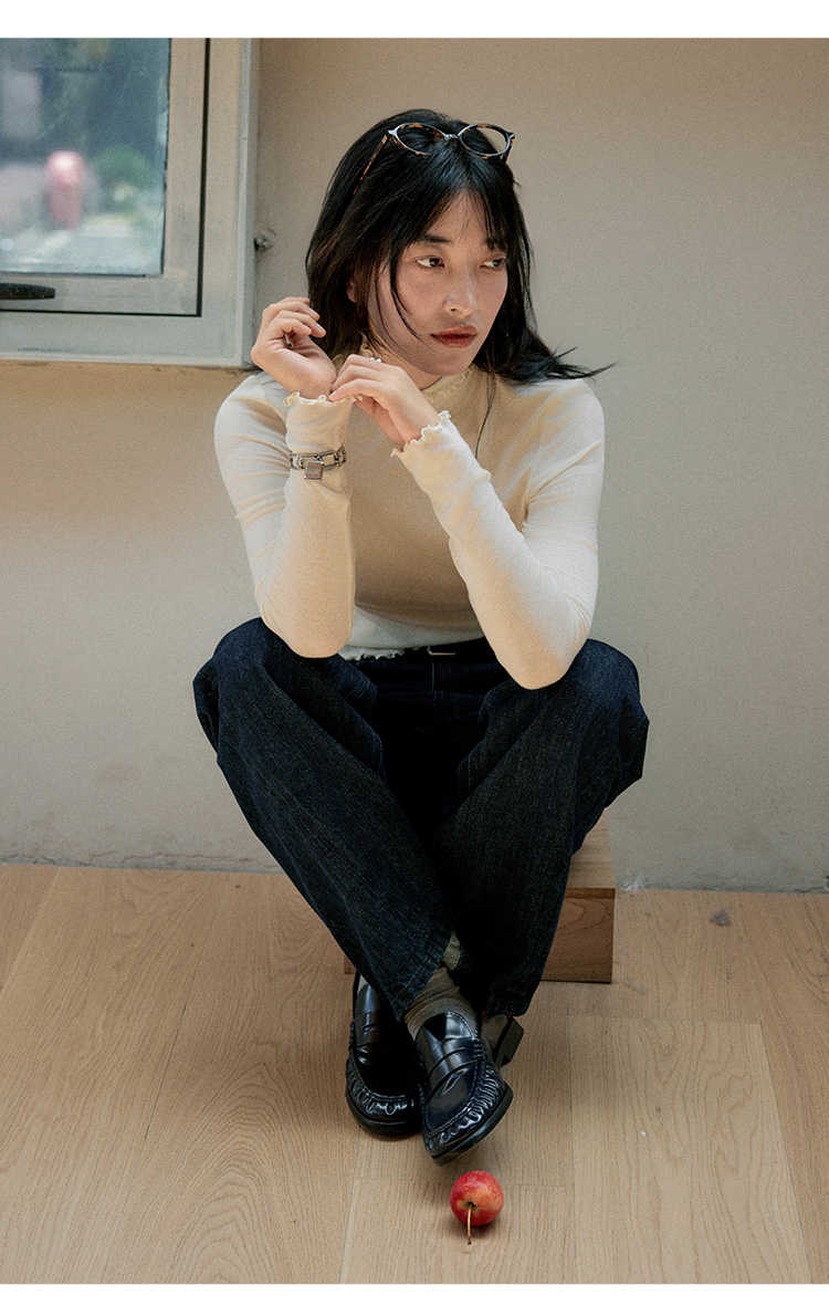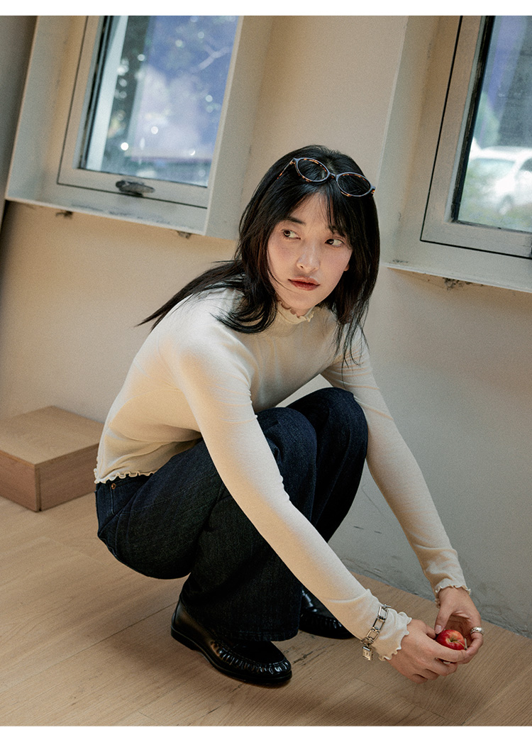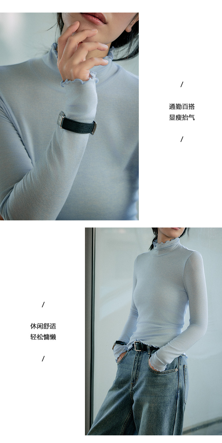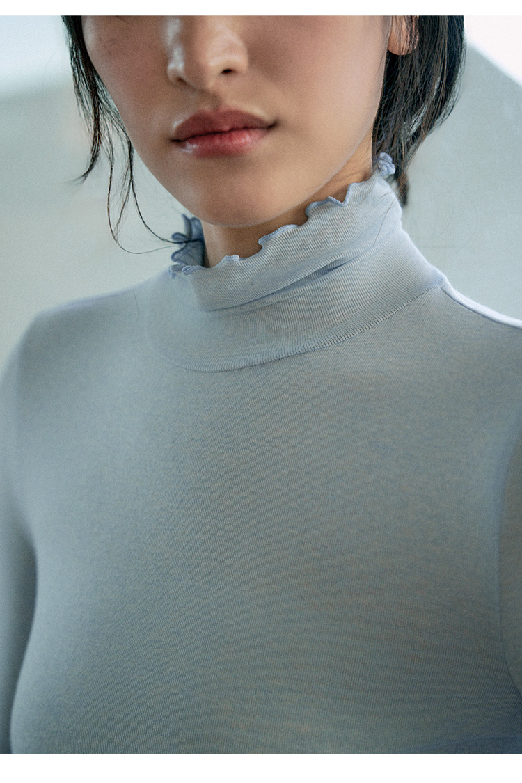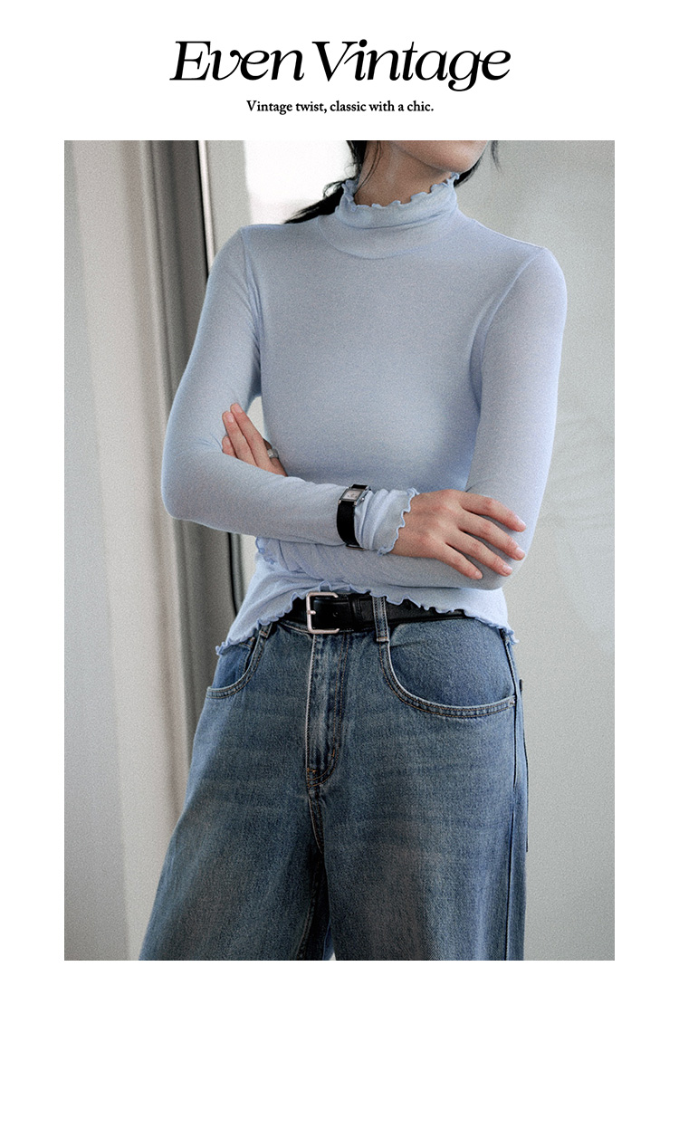 Even Vintage|天丝羊毛混纺 木耳边堆堆领修身微透高领针织打底衫