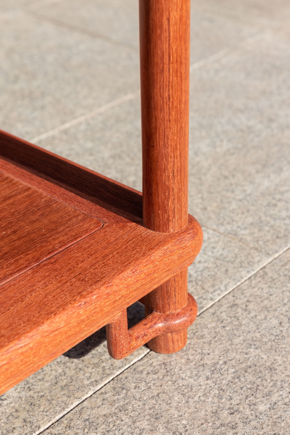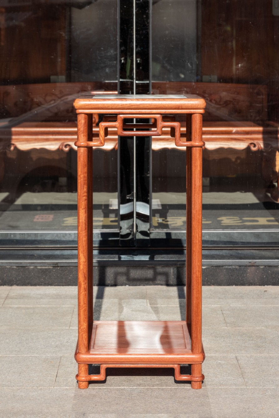这款颐和园花架,圆包圆双层式样,均有穿带,裹腿攒直角高拱罗锅枨结构,原型曾收藏于颐和园,并收录于田家青先生的《颐和园藏明清家具》一书中,方几面镶嵌云石,通体圆材,几面方形,四边攒框镶心,面侧沿呈泥鳅背式素混面,面下为圆棍攒框呈变形裹腿式罗锅枨,罗锅枨与腿足交圈圆包圆,四腿下装有素面屉板,板下装有圆棍攒直角高拱罗锅枨,亦与腿足交圈圆包圆。