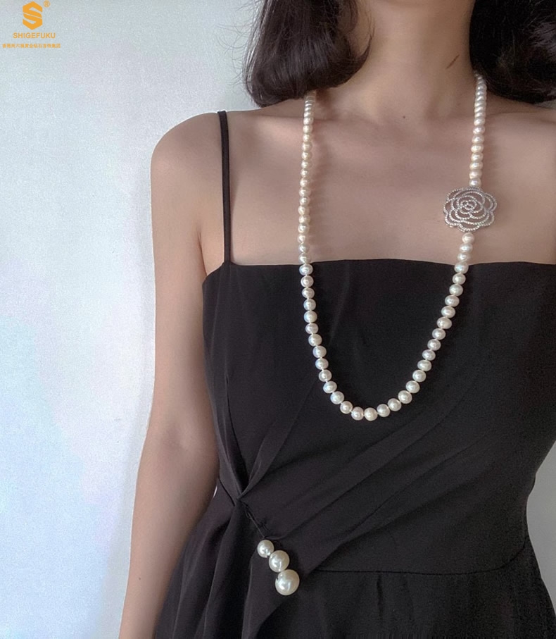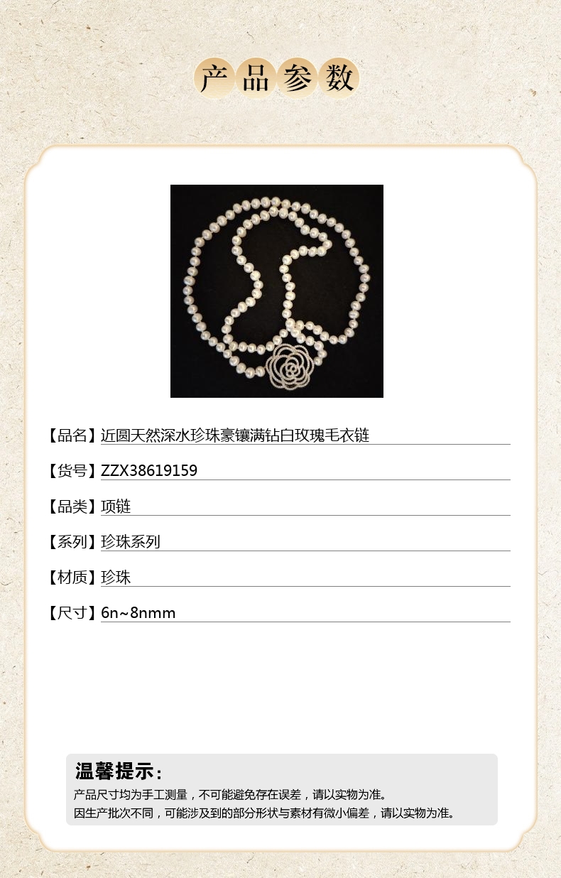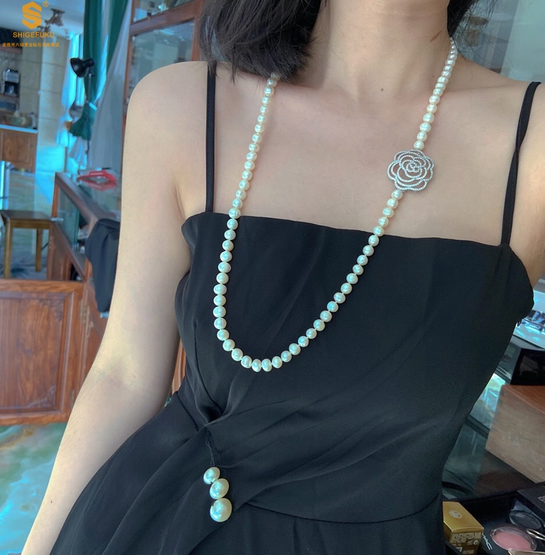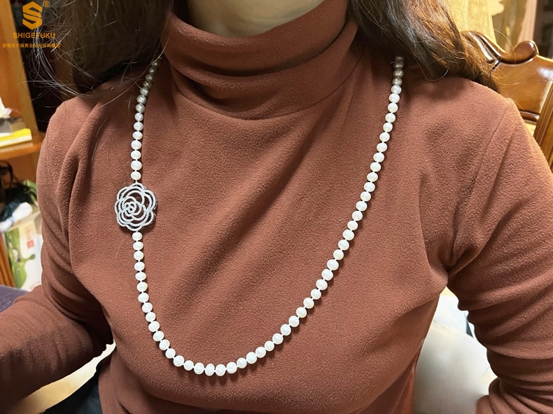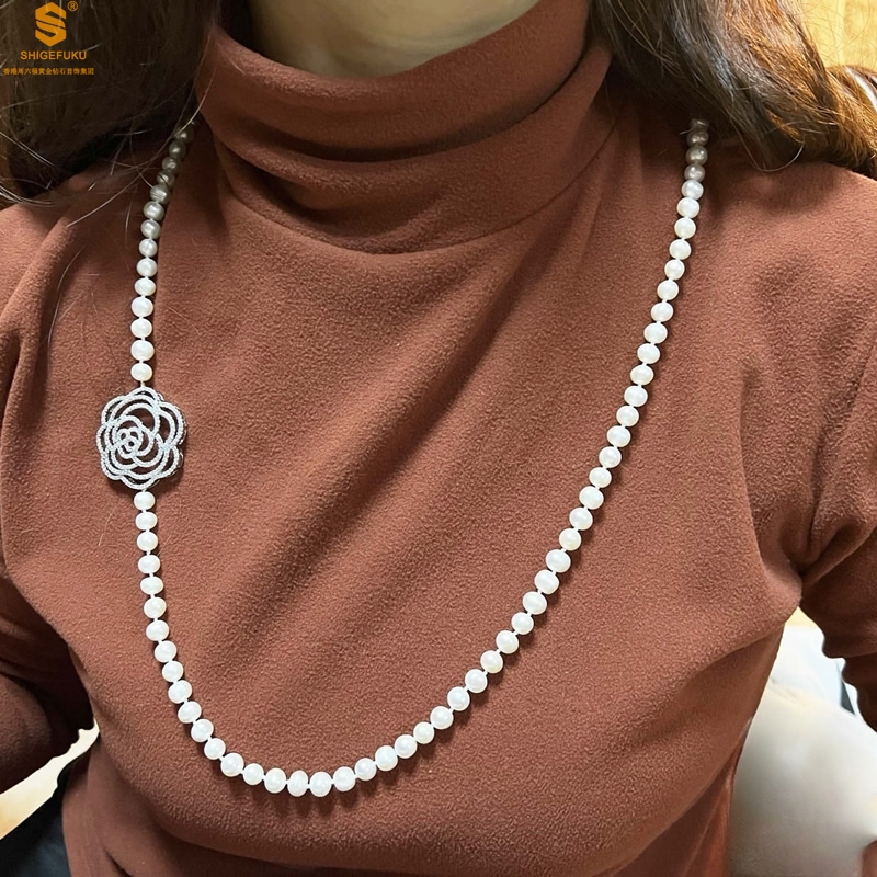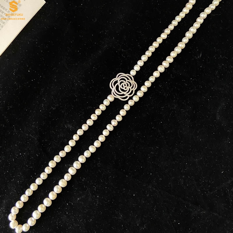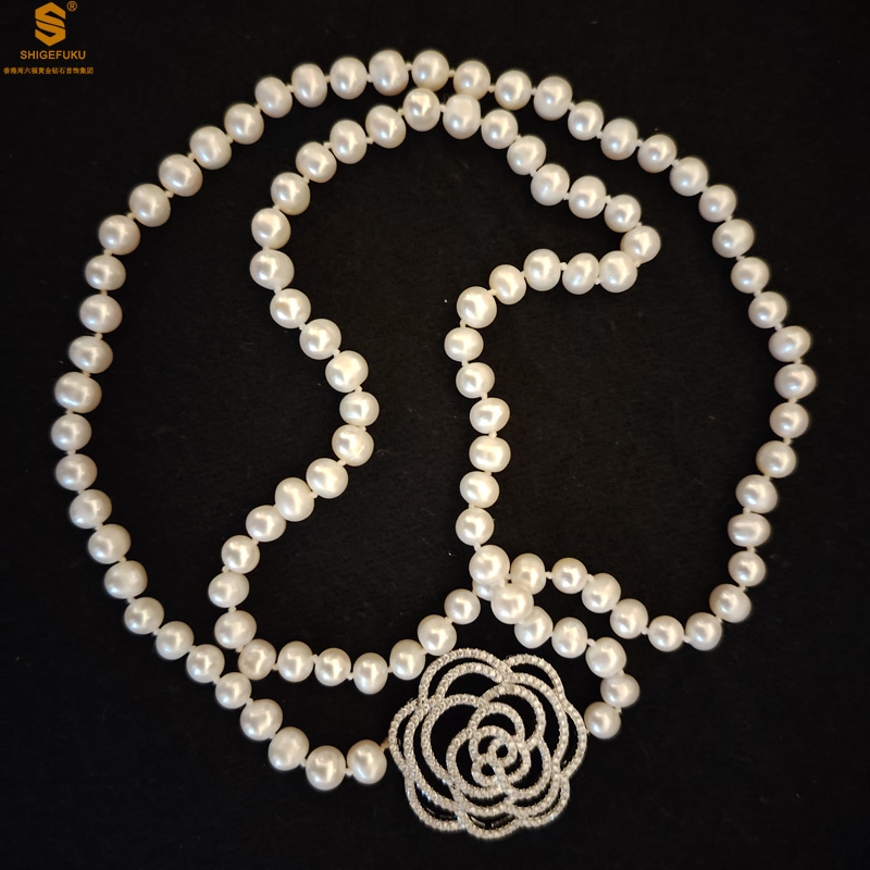 【品名】近圆天然深水珍珠豪镶满钻白玫瑰毛衣链