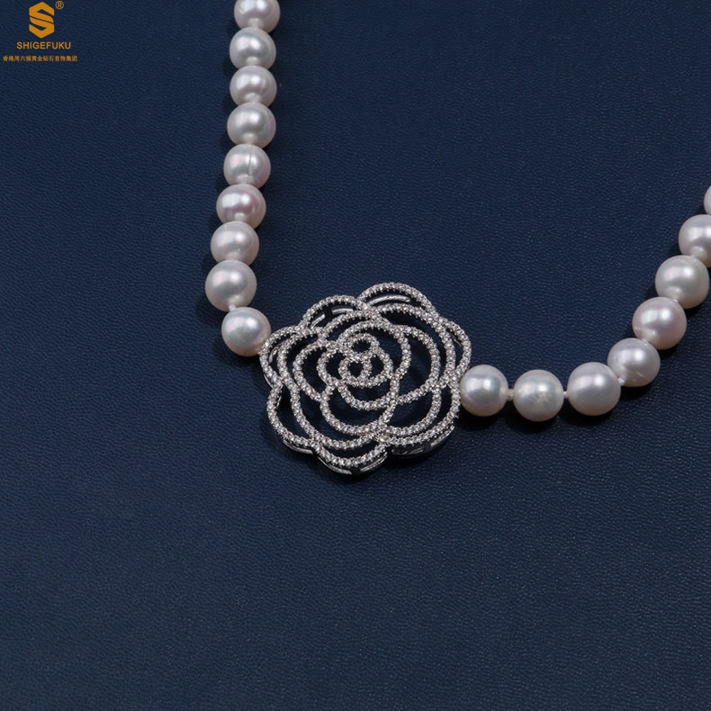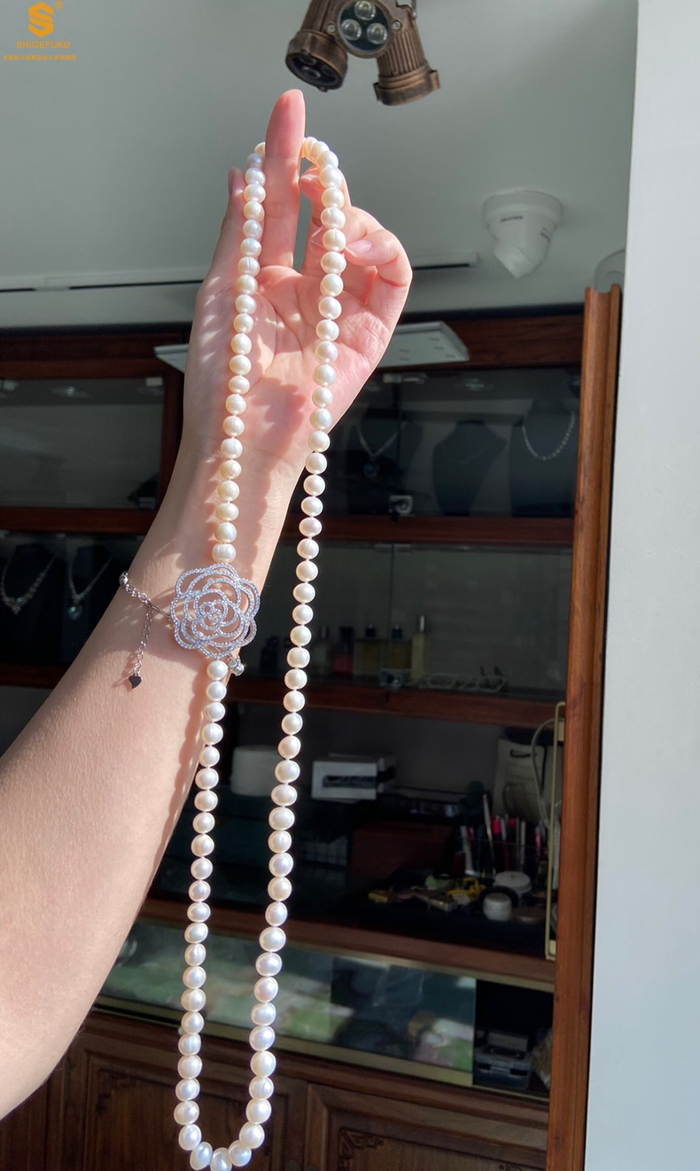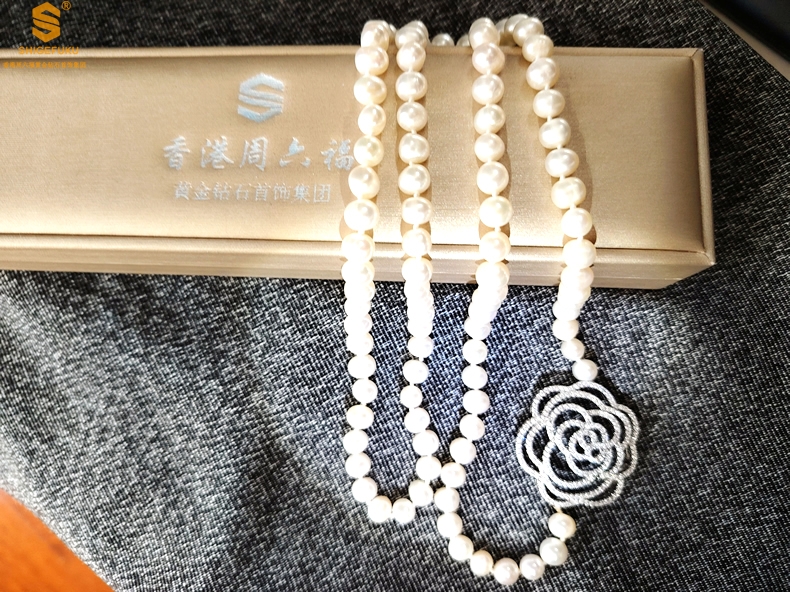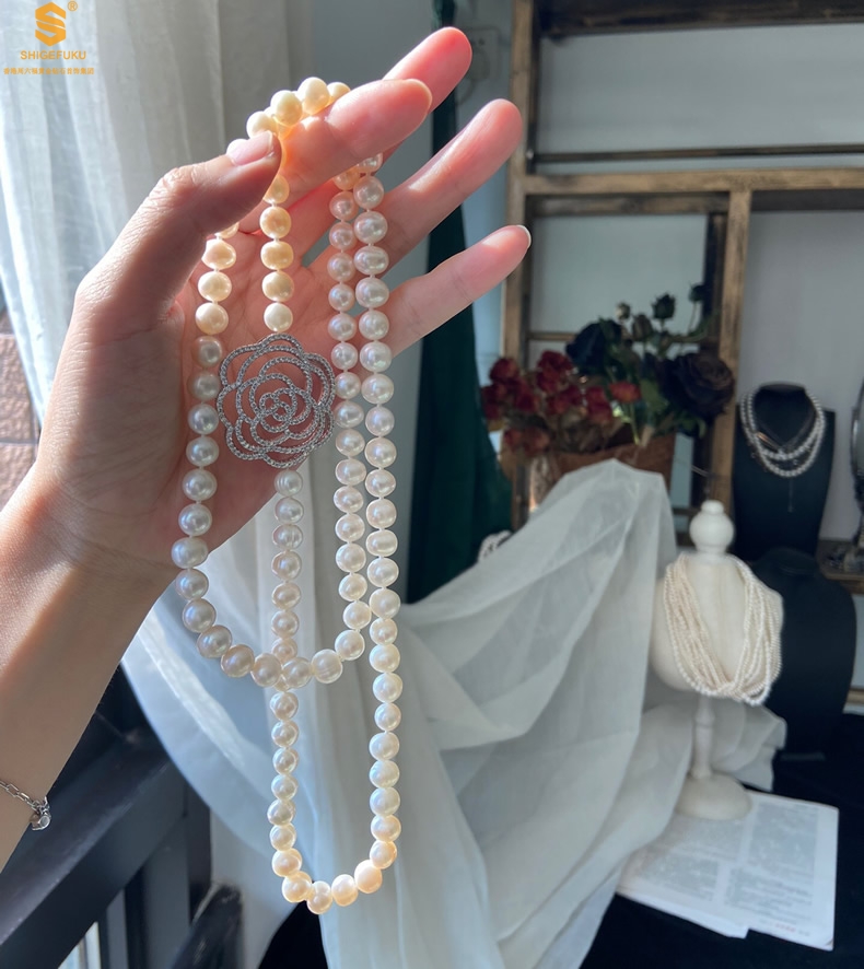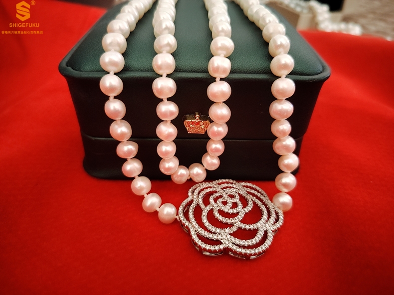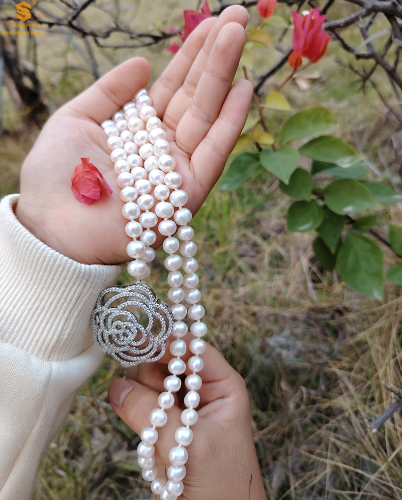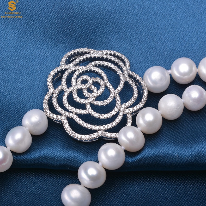 【品名】近圆天然深水珍珠豪镶满钻白玫瑰毛衣链