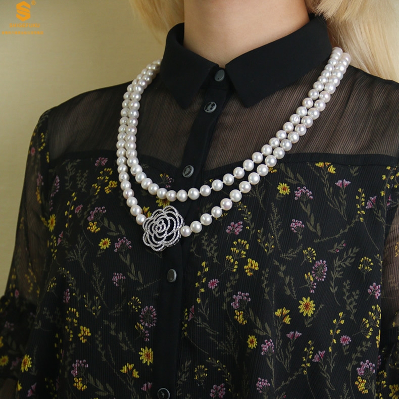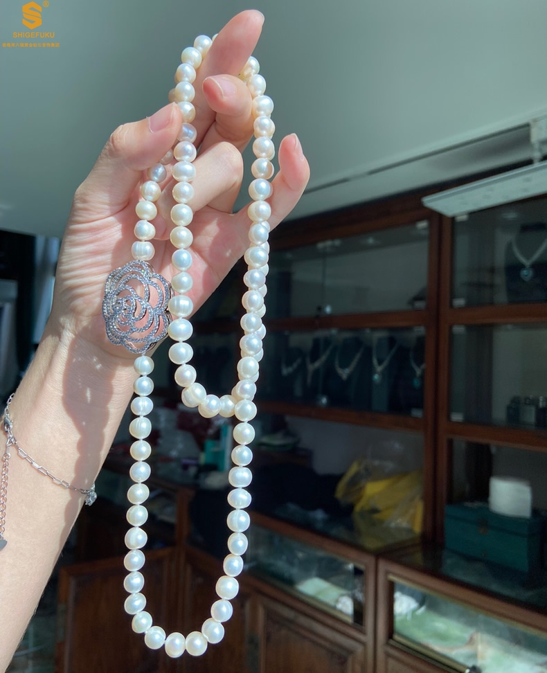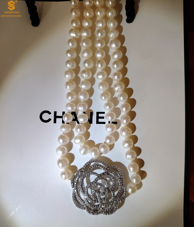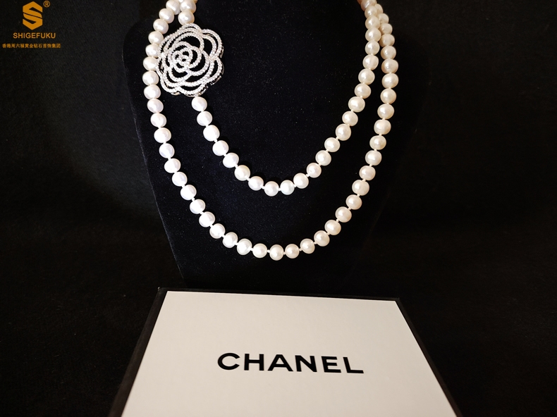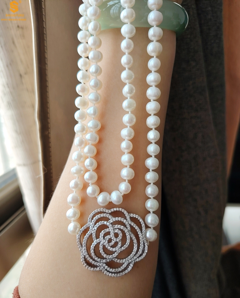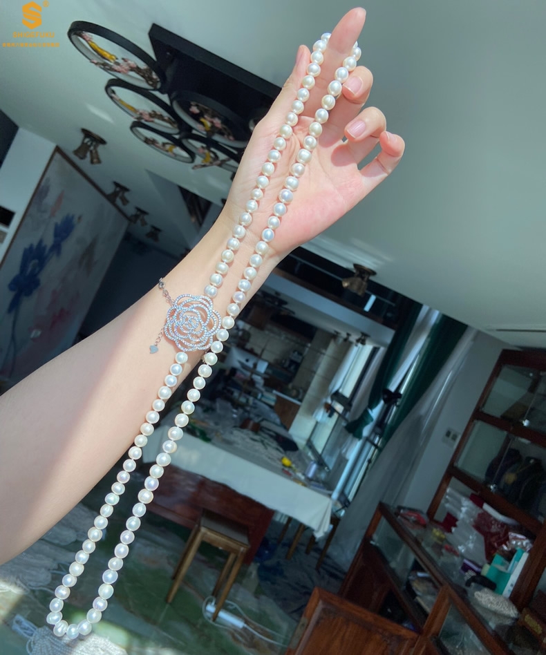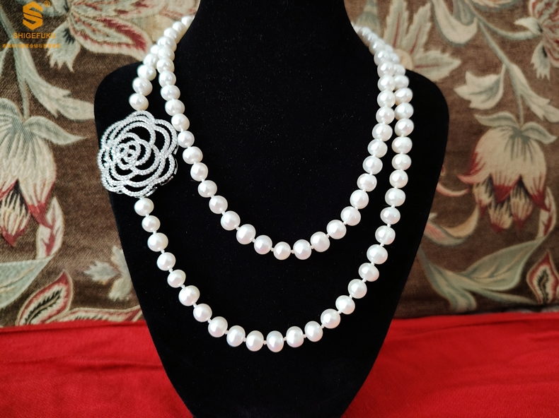 【品名】近圆天然深水珍珠豪镶满钻白玫瑰毛衣链