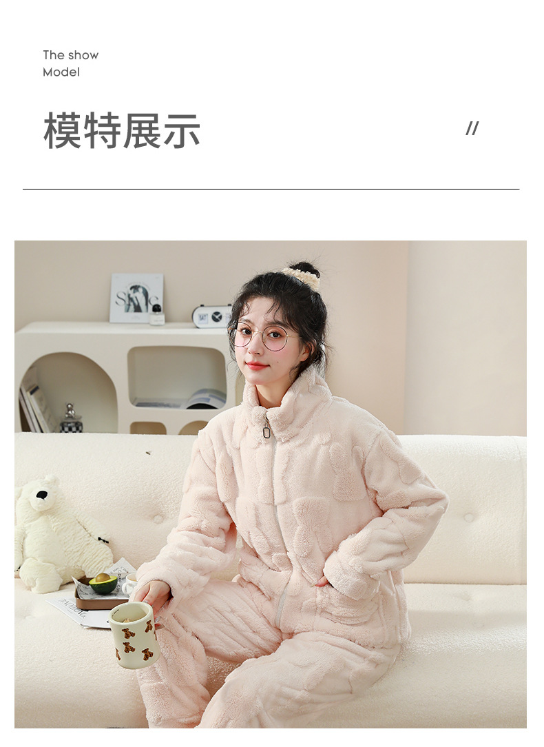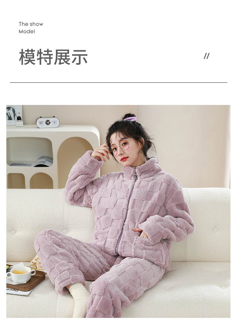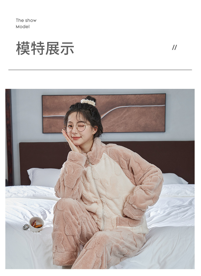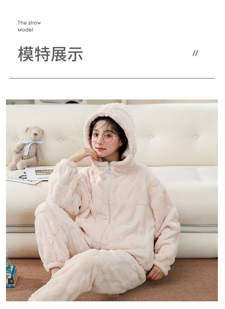 【可外穿睡衣女】秋冬季 法兰绒加厚立领 连帽拉链珊瑚绒家居服套装